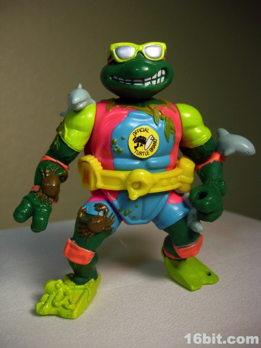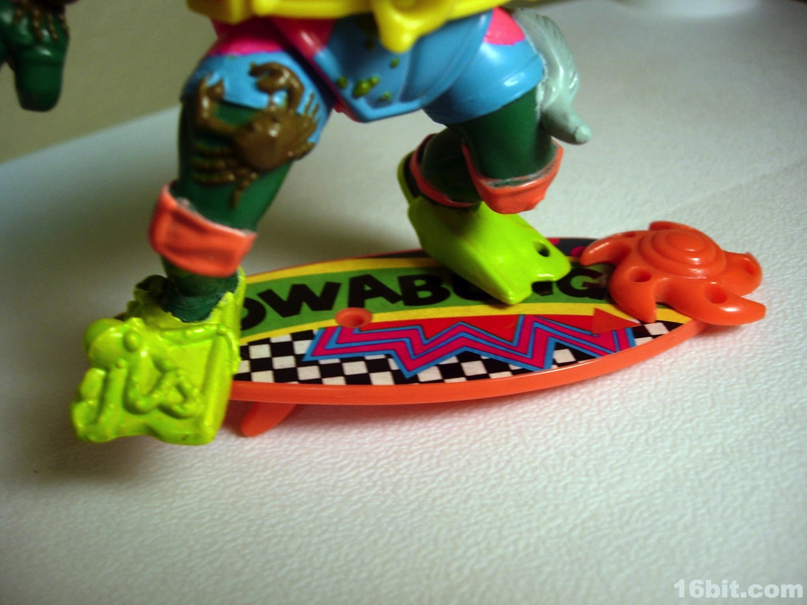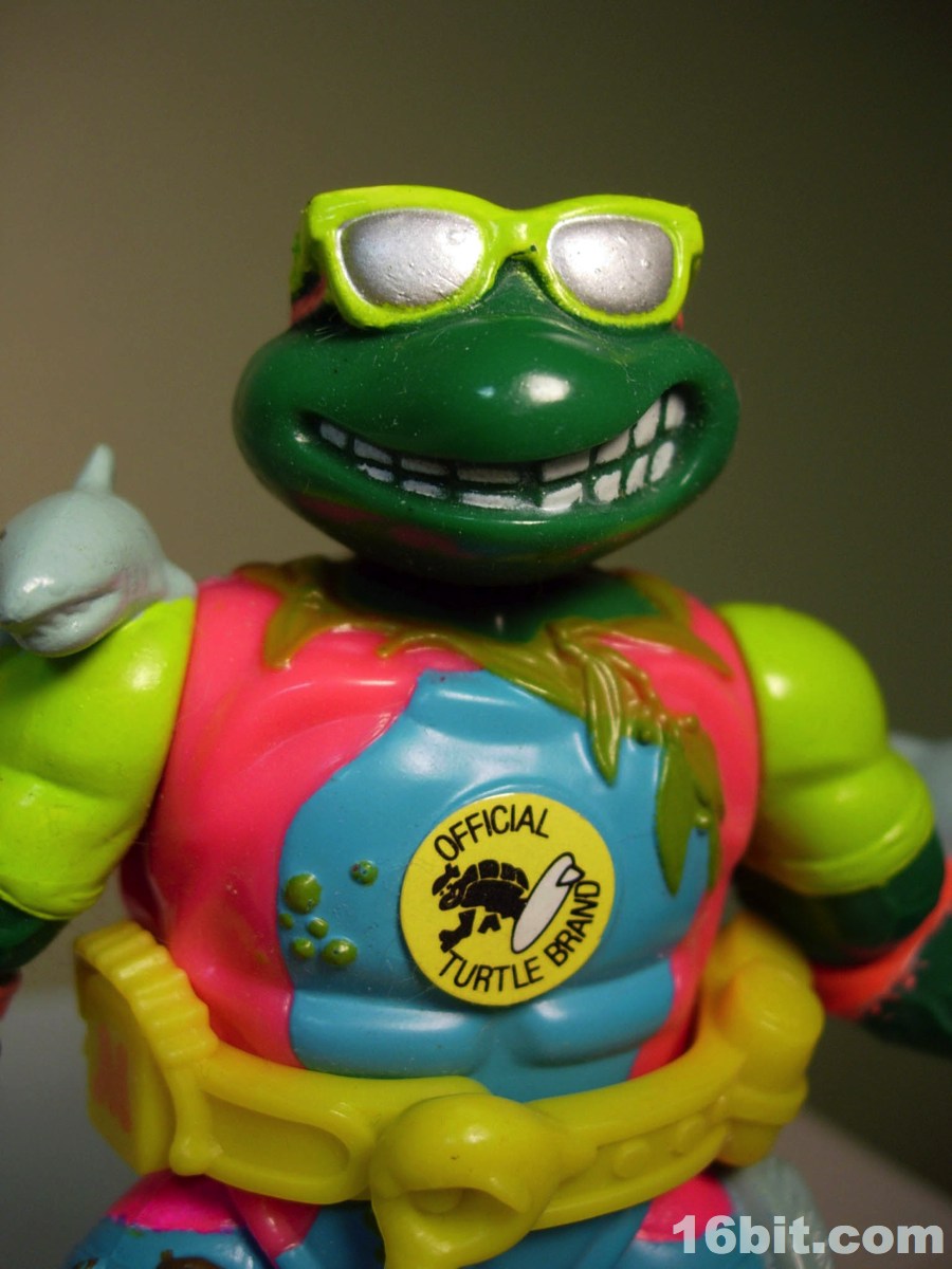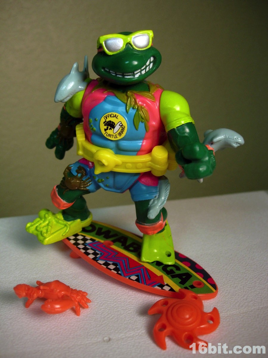 It may not be obvious, but Mike, the Sewer Surfer was something of a milestone in the toy world. He, along with an Undercover Donatello, Samurai Leonardo, and Space Suit Raphael, made up the first turtles to be released in new and unusual outfits. Before this, they were just based on the normal character models without any wacky shirts or helmets. This one was pure late 1980s/early 1990s insanity, incorporating surfer culture, an environmental motif, and of course, unnecessary sunglasses. I'm not sure if I'm here to celebrate this figure as a 4-inch plastic time capsule, or to mock it.