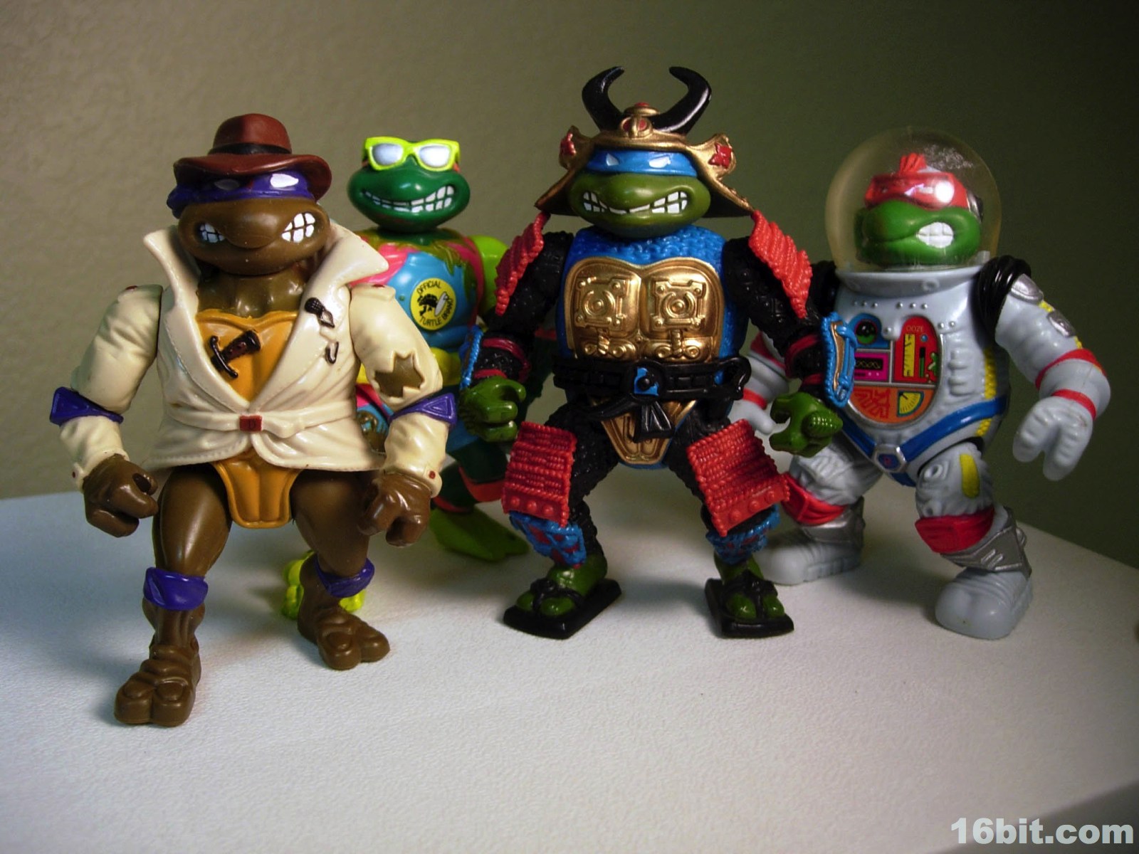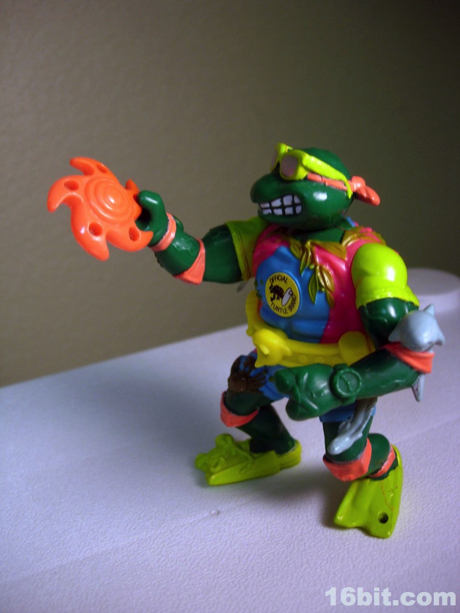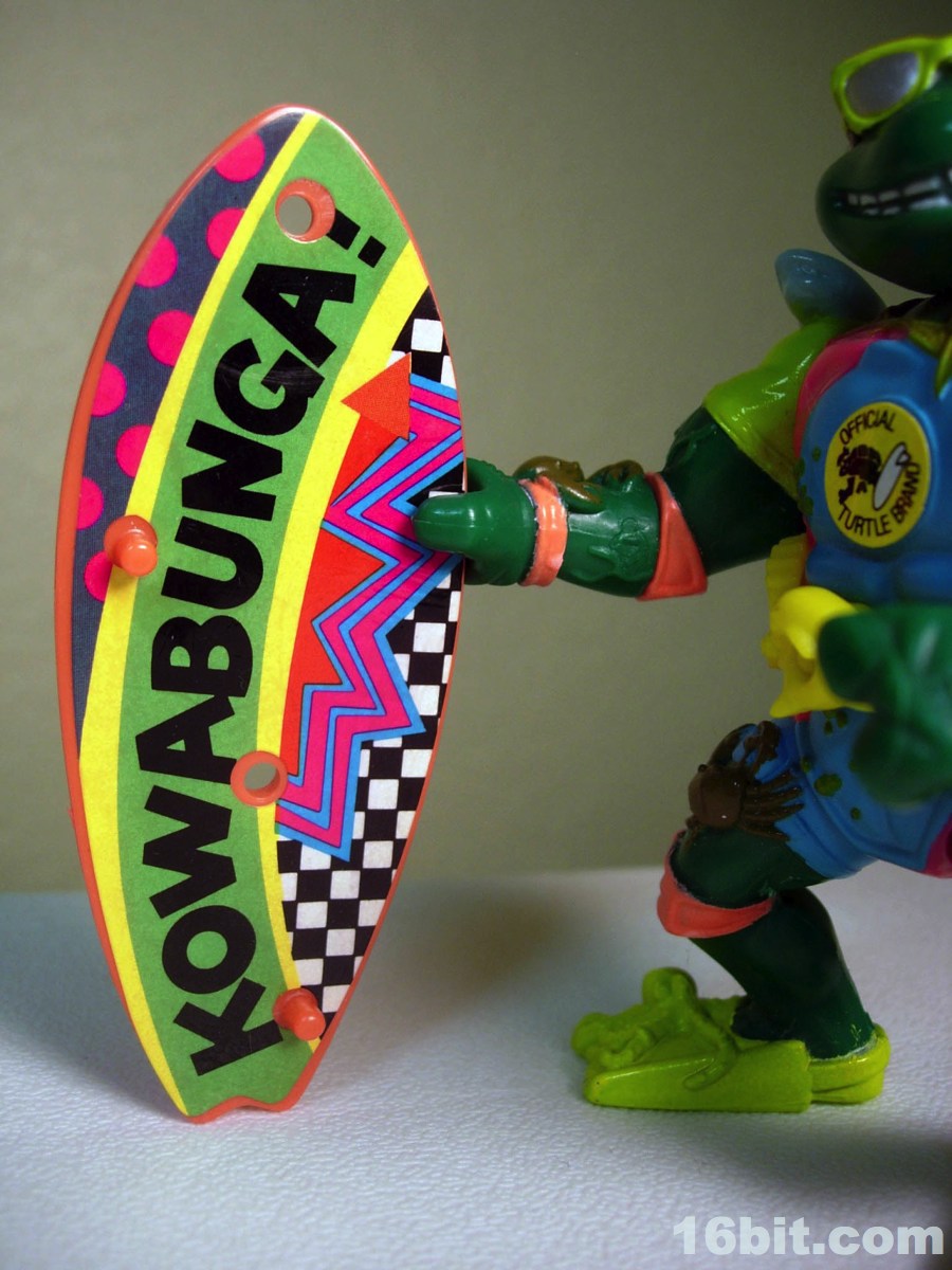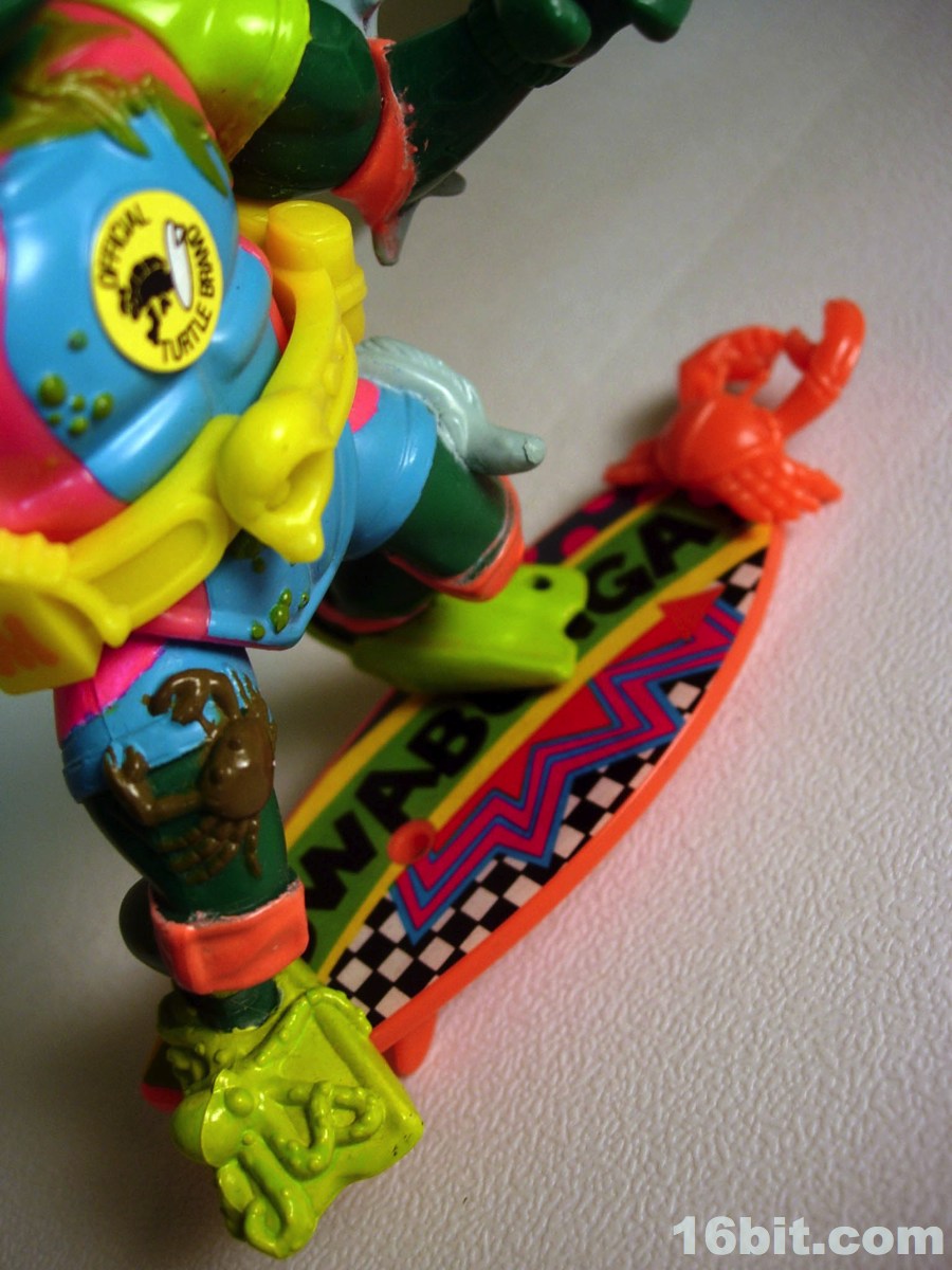It may not be obvious, but Mike, the Sewer Surfer was something of a milestone in the toy world. He, along with an Undercover Donatello, Samurai Leonardo, and Space Suit Raphael, made up the first turtles to be released in new and unusual outfits. Before this, they were just based on the normal character models without any wacky shirts or helmets. This one was pure late 1980s/early 1990s insanity, incorporating surfer culture, an environmental motif, and of course, unnecessary sunglasses. I'm not sure if I'm here to celebrate this figure as a 4-inch plastic time capsule, or to mock it.