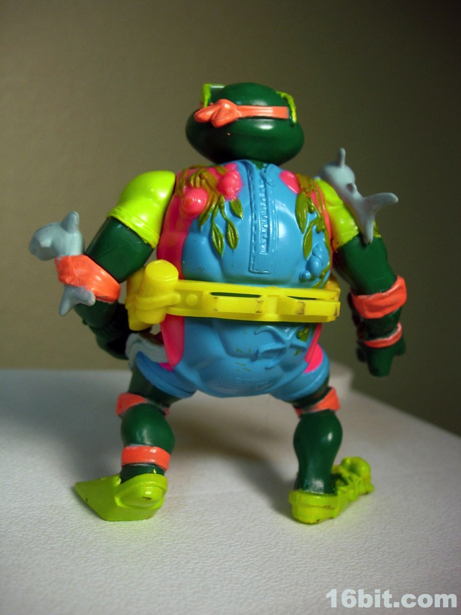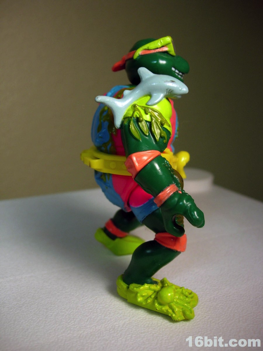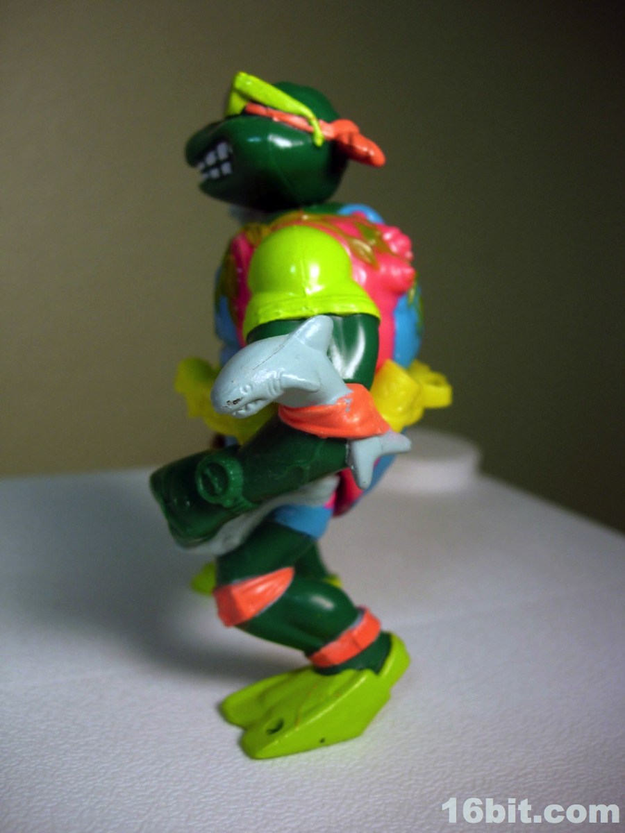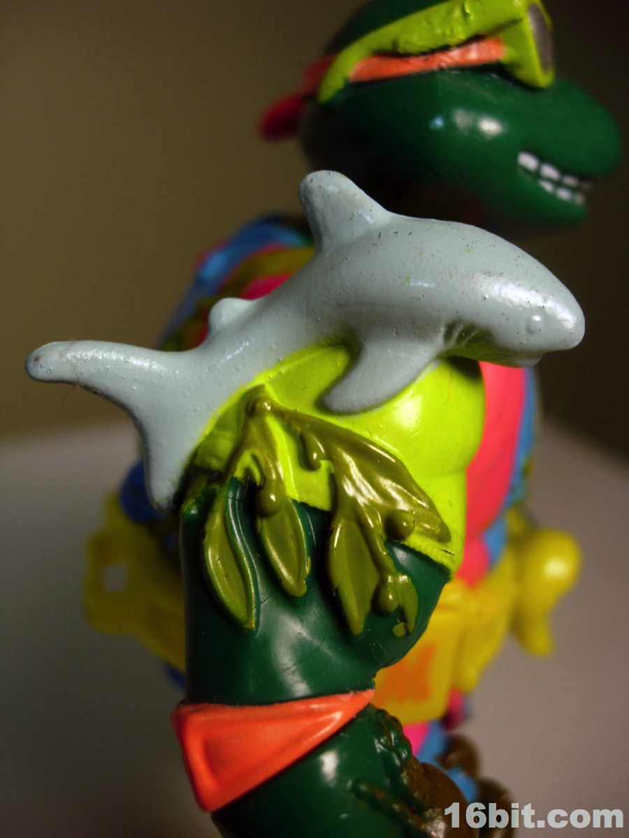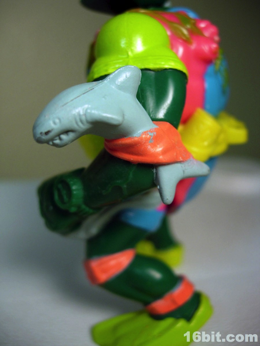 When I bought this as a kid-- and yes, this is the sample I got when I was 10-- I knew it was dumb but I wanted the set anyway. I believe Mike was the hardest of the four to find, and looking at it for the first time in over a decade, I'm not sure why it was so hot. His trademark orange bands are now crazy day-glo orange, and if you shine a black light over them you might go blind. He wears a partial wet suit, made of pink and bright blue. An "Official Turtle Brand" sticker was applied to his chest, and I'm actually pretty amazed it's still there. I'm not entirely sure why he has swim fins on, but he does, and there are tons of little sculpted details all over the figure. Some, like seaweed, add some visual flair to the figure. Others, like his little shark buddies, make absolutely zero sense to me.