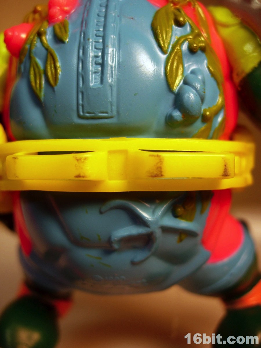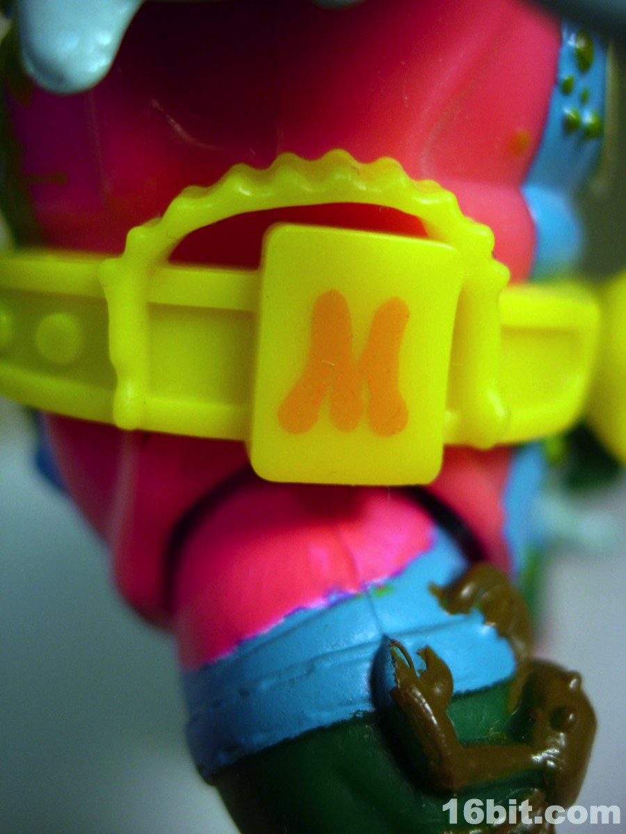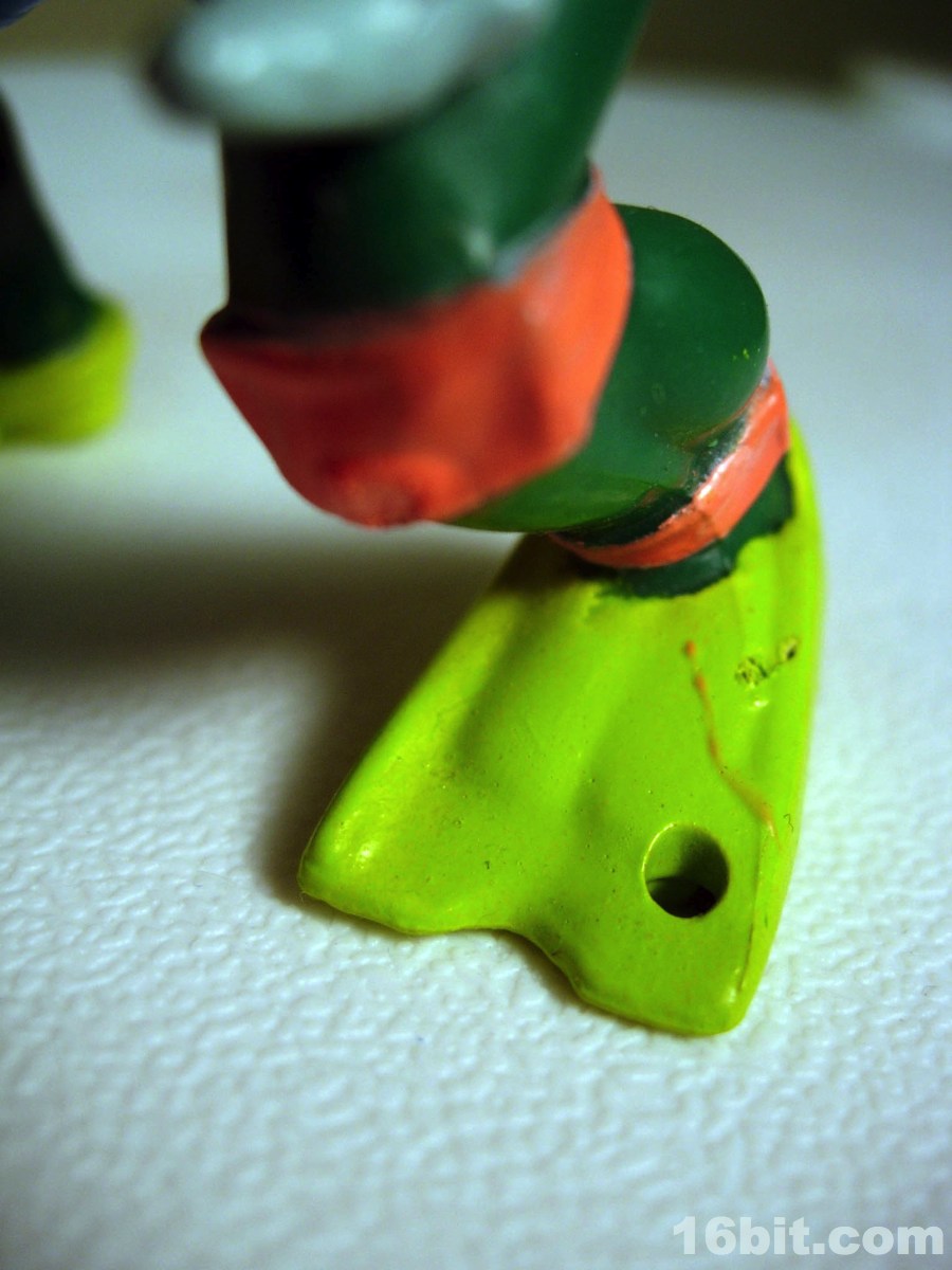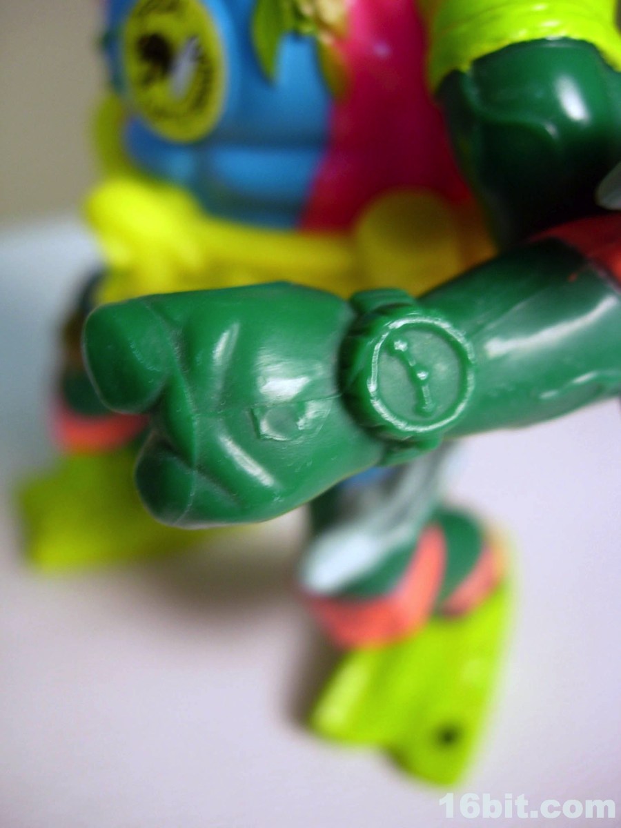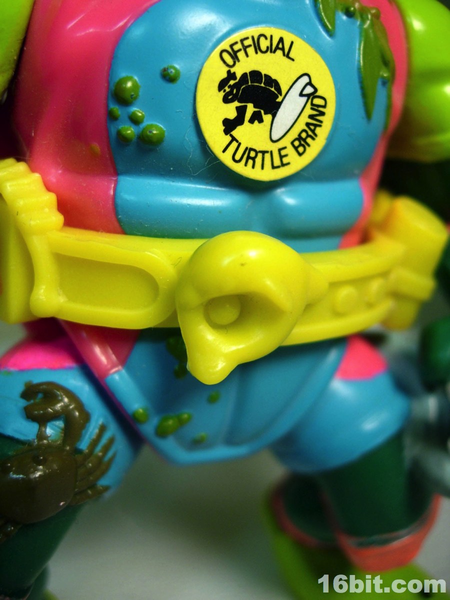 When I bought this as a kid-- and yes, this is the sample I got when I was 10-- I knew it was dumb but I wanted the set anyway. I believe Mike was the hardest of the four to find, and looking at it for the first time in over a decade, I'm not sure why it was so hot. His trademark orange bands are now crazy day-glo orange, and if you shine a black light over them you might go blind. He wears a partial wet suit, made of pink and bright blue. An "Official Turtle Brand" sticker was applied to his chest, and I'm actually pretty amazed it's still there. I'm not entirely sure why he has swim fins on, but he does, and there are tons of little sculpted details all over the figure. Some, like seaweed, add some visual flair to the figure. Others, like his little shark buddies, make absolutely zero sense to me.