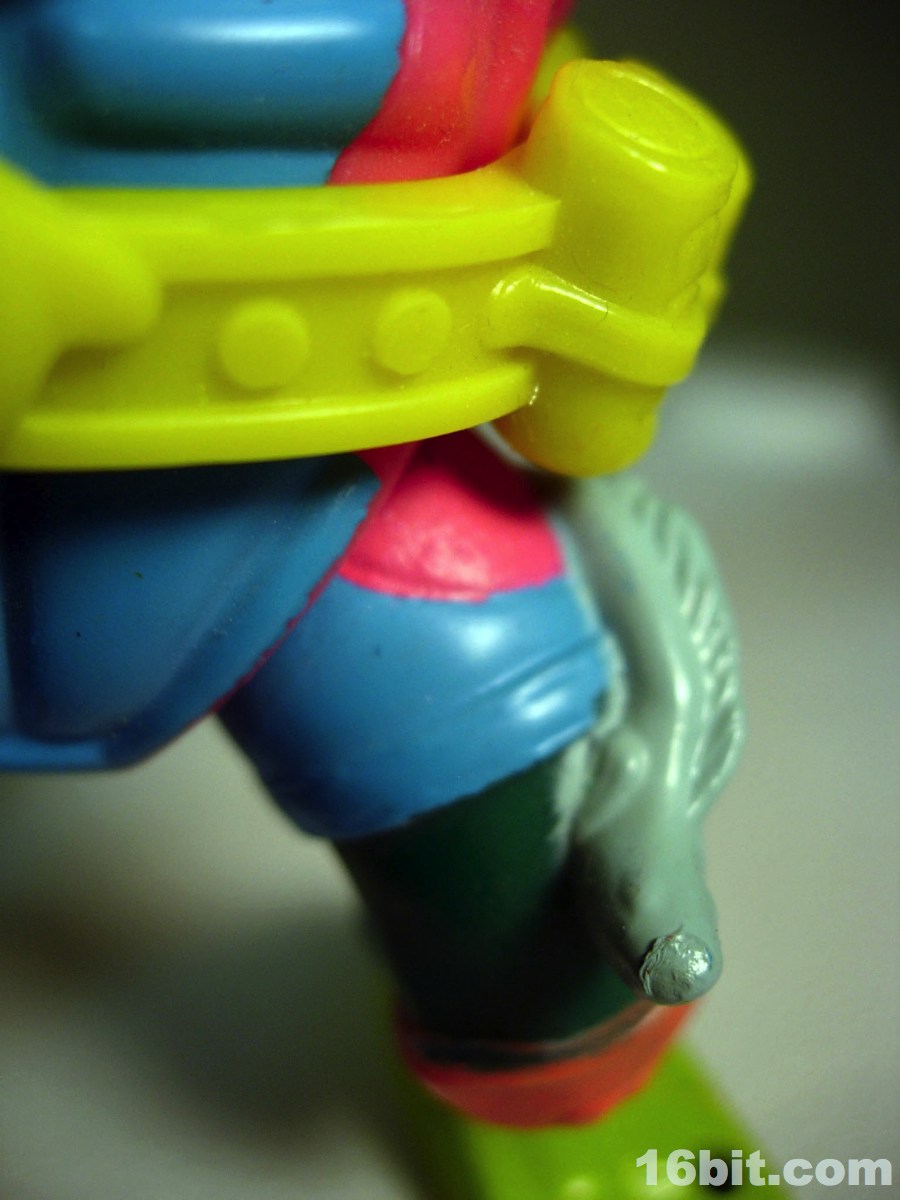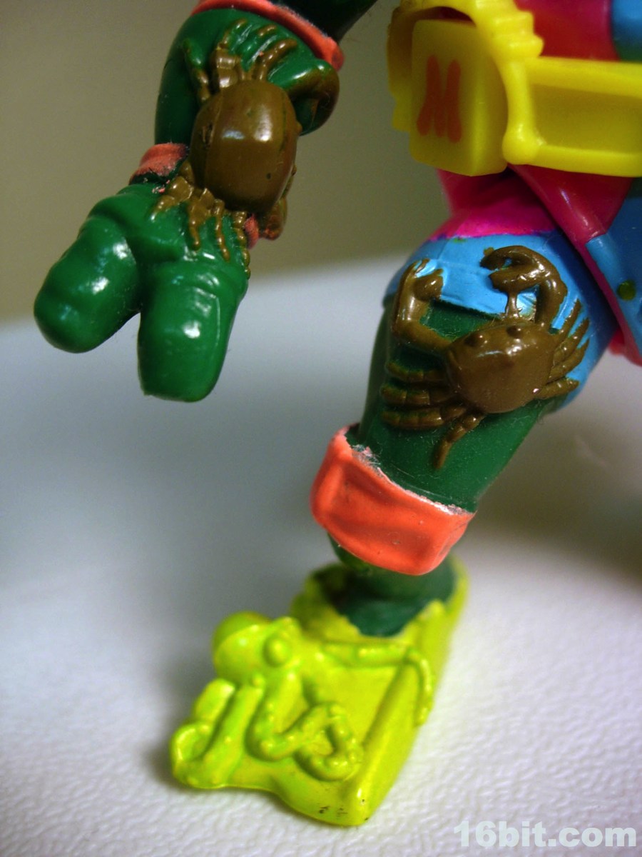 The amount of crap Playmates added to this figure is mind-boggling. Back in the day, I was perplexed why they had so many muscles and veins on their arms, and looking back at this figure, it's a wonder my head didn't explode. His outfit-- which is sort of over the top as it is-- also has two sharks, an octopus, two crabs, an eel, a seastar, and three shells on his body. What's more, most of these got painted, so some sculpted details like his watch were left as his skin coloring... which is odd. The figure actually has too much going on. This level of overkill wasn't entirely uncommon on Playmates figures of this era, which meant you never get painted accessories but, strangely, the sculptors went absolutely haywire in adding detail to figures.