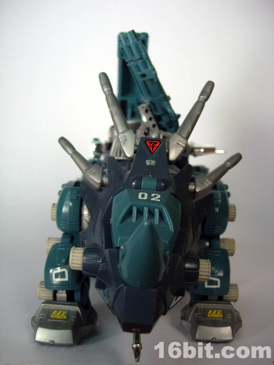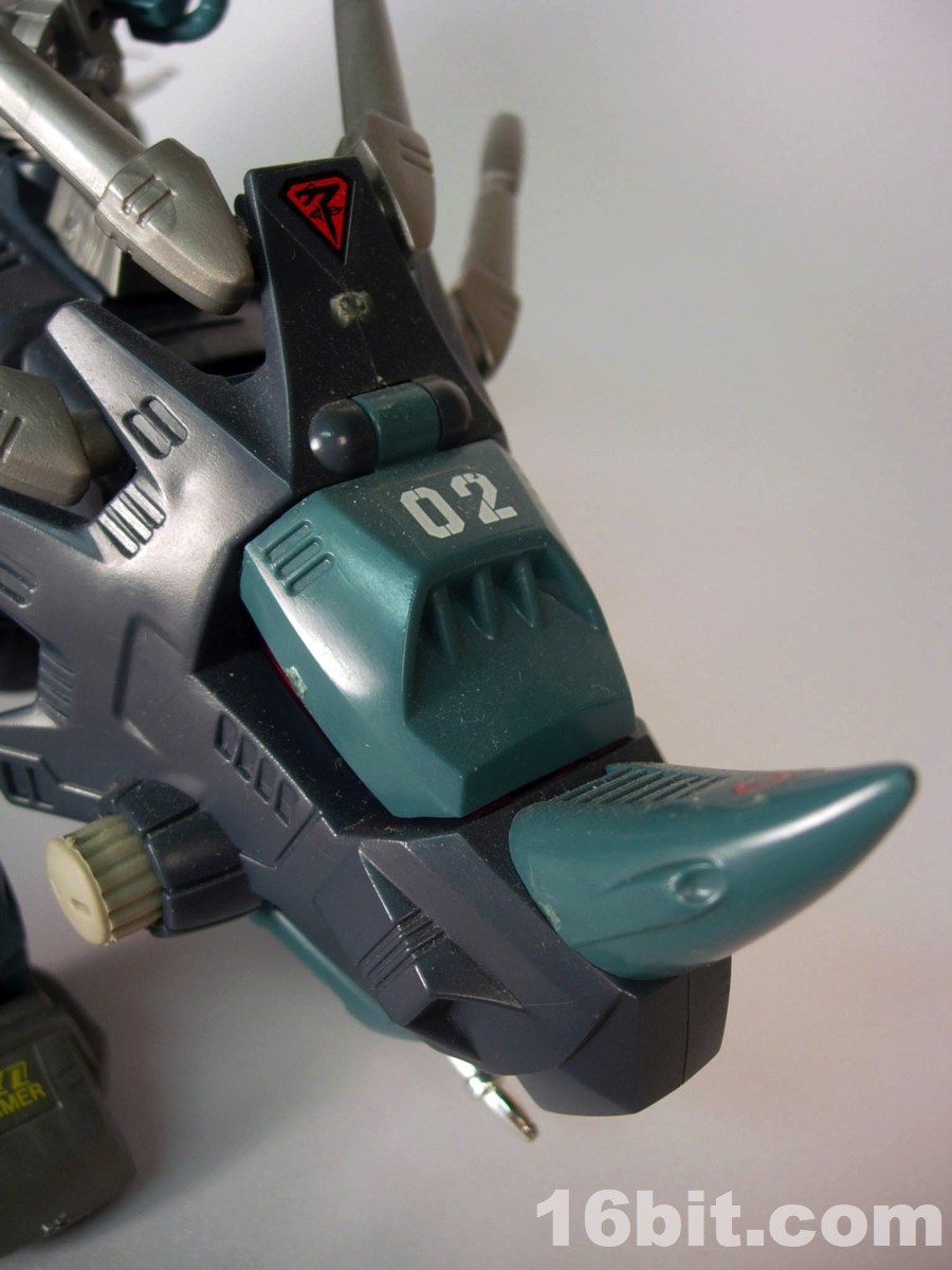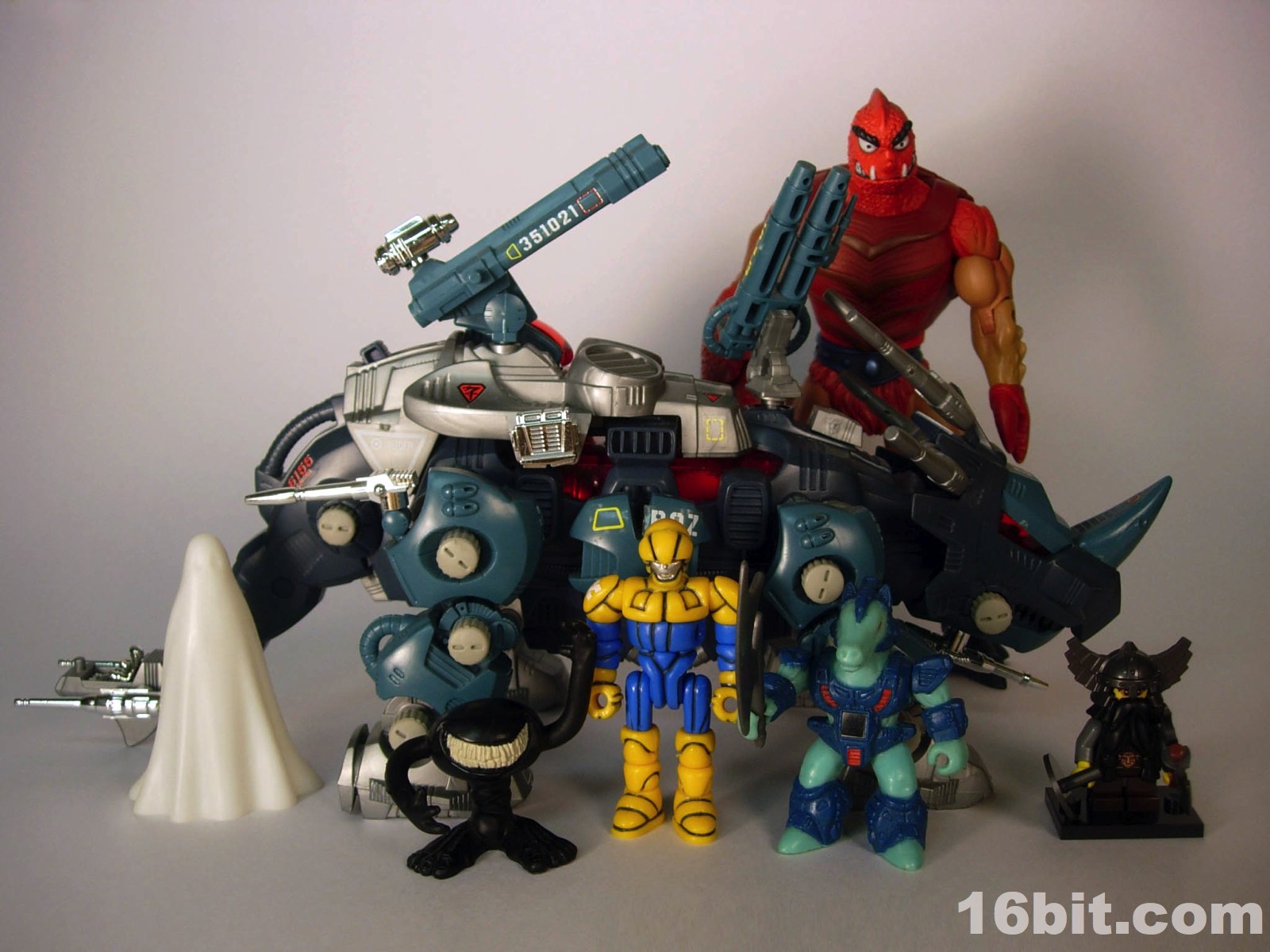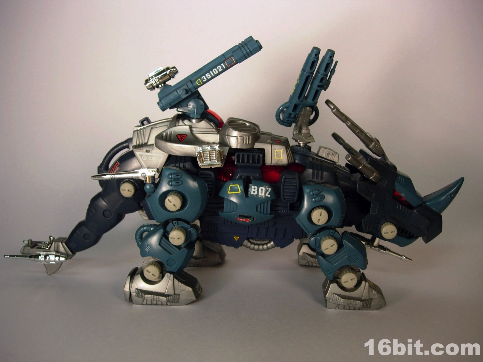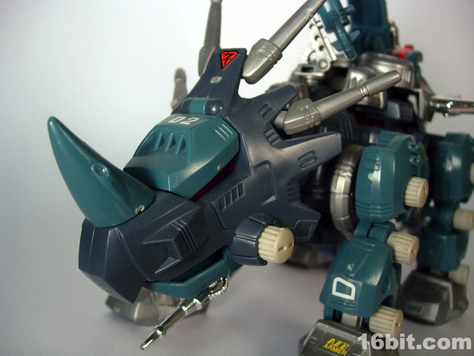 Some things are sacred-- my Robostrux toys probably received better treatment than anything I had as a kid, and I took good care of my stuff. Brutox was the third (and for a couple of decades, final) kit I received in the line, and it was a hum-dinger. The battery-powered Styracosaurus was sold in the USA initially in this blue color, complete with Zenebas logo, but here's the weird thing: the Robostrux line ignored the Helic and Zenebas faction logos. (Think Autobots and Decepticons.) They just randomly reassigned characters to the Red Mutants or Blue Guardians, and Brutox was a Blue Guardian. Because he's blue. In Japan (and much later in the USA), this toy was sold as Red Horn in red and various other colors. (Tweaked versions of the old Dark Horn and Red Horn both bowed in the USA around 2002.)