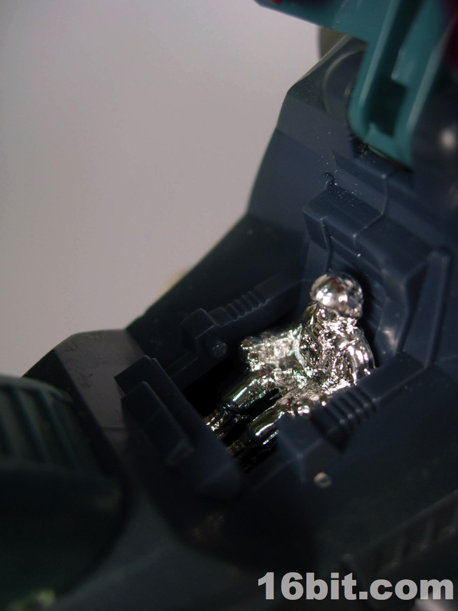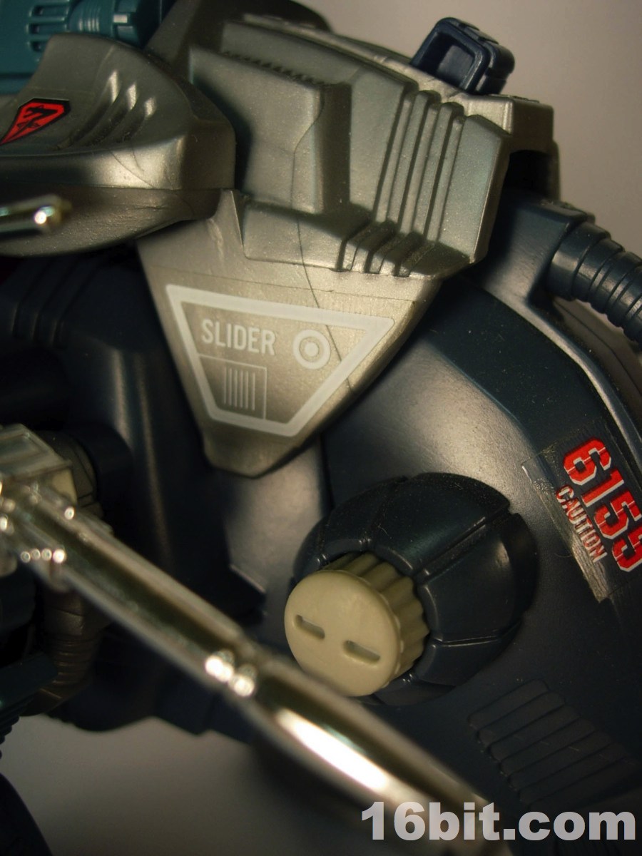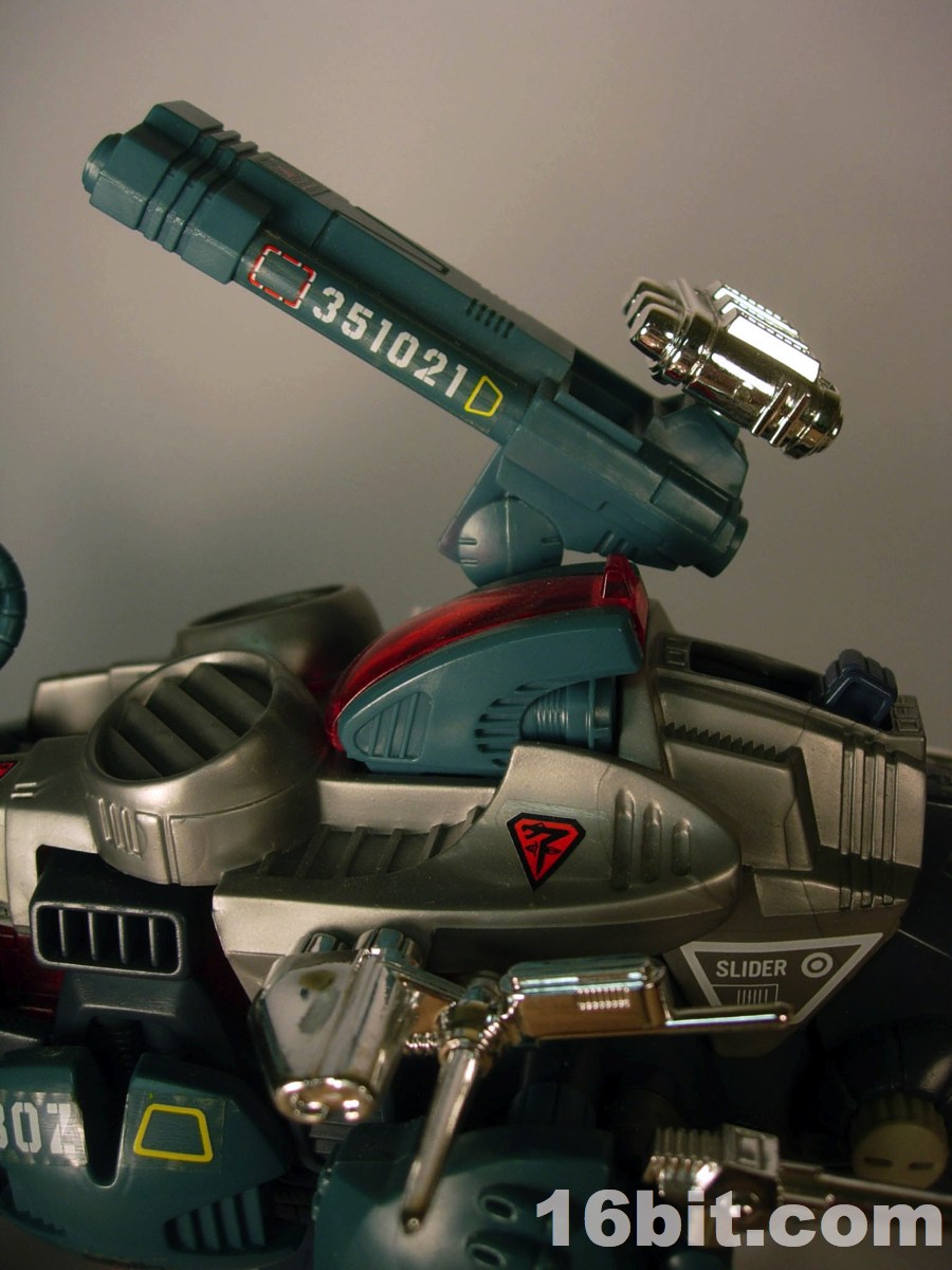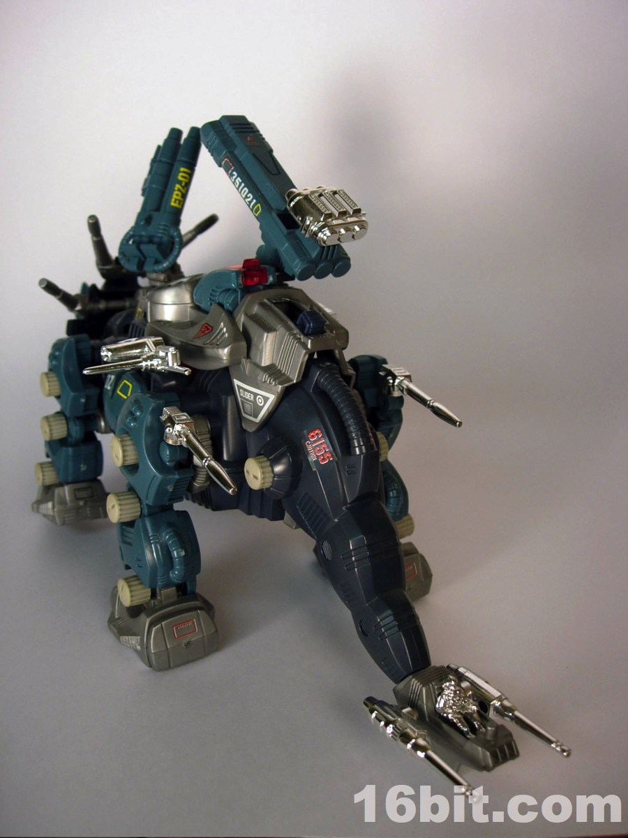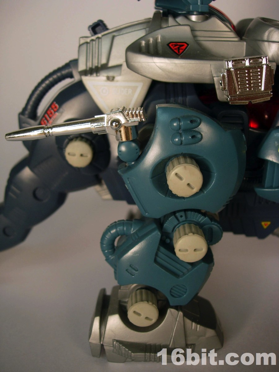 The modestly sized kit is, to say the least, beautiful. The US release was properly blinged out with vac-metal guns (which Japan did not get), which just makes the damn thing sparkle. The sticker sheet is fundamentally the same as the one used for Japan, but the plastic colors are completely different-- long gone are the red and dark maroon colors, instead American boys got to enjoy silver, a light blue, and a sort of a royal blue color. If you flick a switch on his back near the tail, the battery-powered motor (which last I checked just suddenly stopped working) will propel the beast forward, opening and closing his mouth while his legs heave ahead and the front cannon spins. It was basically a low-level robot dinosaur that friggin' came alive. The little wind-up ones are cool-- and yes we'll be talking about them soon-- but this beast really was a delightful creation.