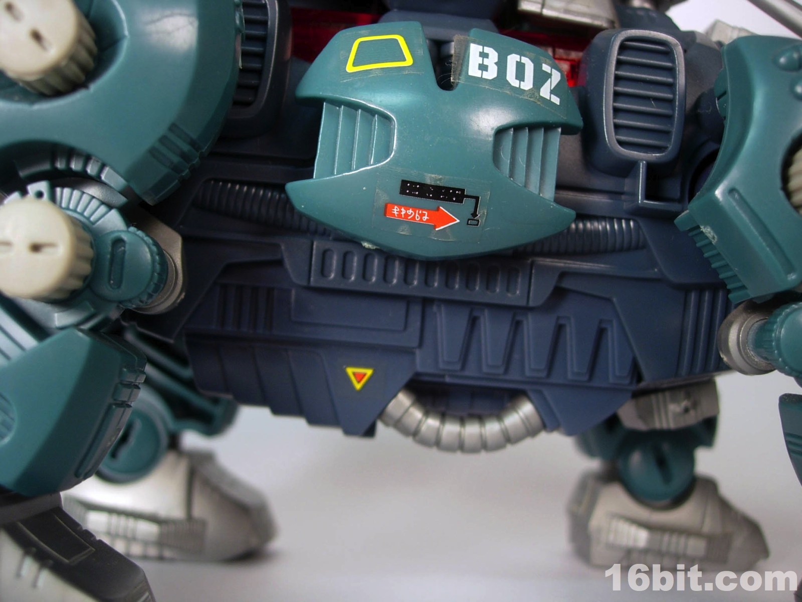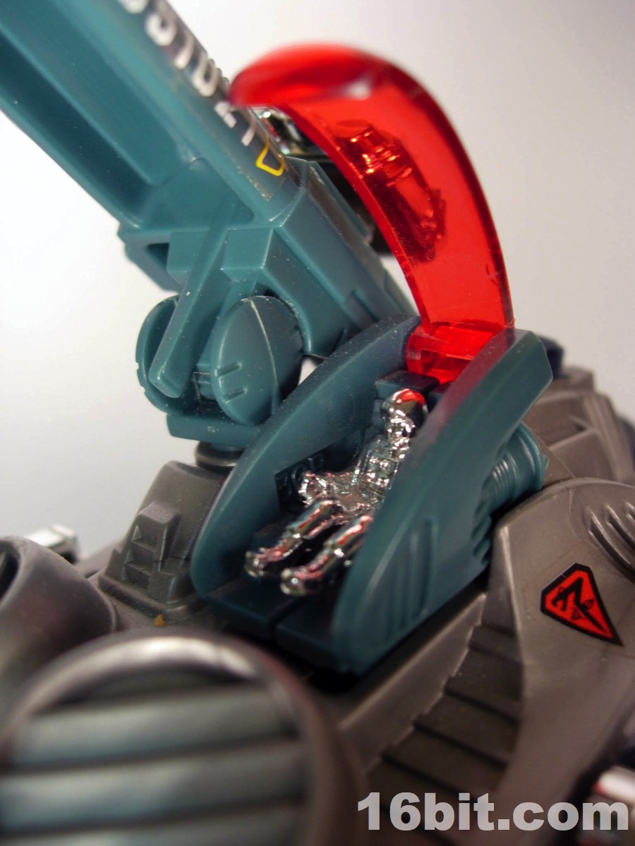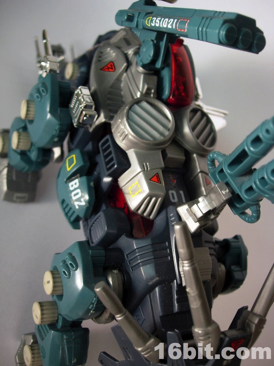 There's a lot of detail on the kit, which basically any able-bodied adult can assemble in under an hour with a hobby knife and a little patience. Kids might assemble it faster. (They're better than us.) The horns on the crest are jointed, as are most of the guns-- you can position them to your liking. The canopies on the head and back open, plus a gunner sits out in the open on the tail. The toy is covered in vents, bolts, hoses, and other sculpted details that you generally didn't get a heck of a lot of from toys of the day. Transformers and Go-Bots of the day were much simpler, as were the earlier Tomy Zoids kits sold in the USA and Japan a few years earlier. This thing is just gorgeous-- most of the Robostrux kits were culled from the middle years of the original Zoids line, where the skeletal robots were replaced by bulkier, meatier armored dinosaurs that just make me smile. I don't deny that my love of this line comes form the fact that I still view it through the eyes of a little kid who couldn't put on labels to save his life, and to this day I can't name a toy line that immediately spoke to me and said "I am spectacular. Now take good care of me" in the same way as these guys.