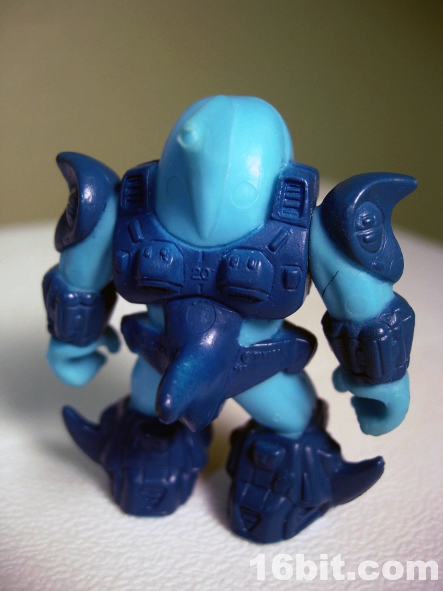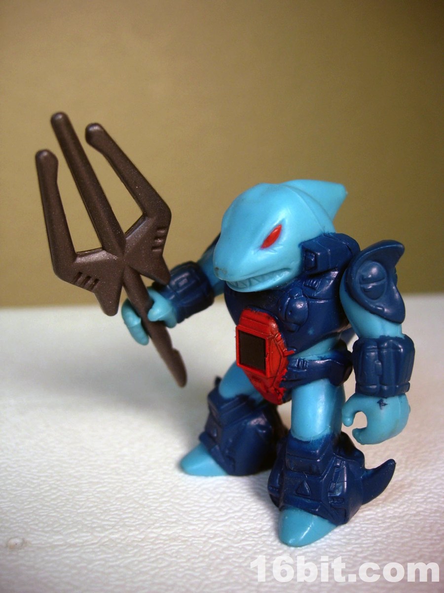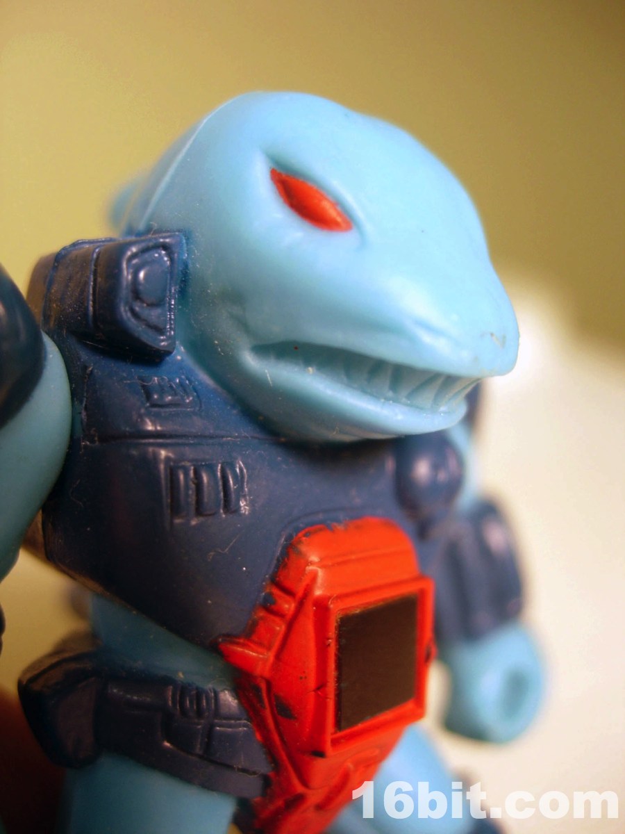 Sawtooth Shark is a blue action figure which was sold in mini-figure 2-packs, although the combinations varied. You get a fight in every pack, with a clearly defined winner and loser. The only reason to keep buying (other than collecting) was to raise the self-esteem of the poor fire creature packaged with your water warrior. Surely, he would win next time! Anyway, the sculpting on these little guys was done by Takara, and the heads (specifically the eyes) show the influence of robots and other Japanese toys from the era which came out of Takara and Tomy. Hekc you can see some of the Battle Beasts in the Headmasters cartoons from Japan. With only two joints, this was-- in every sense of the word-- a cheap figure. Unlike M.U.S.C.L.E. or other "collectible" figure ranges, the figures were painted with 2-3 colors per plus they were armed with some form of melee weapon.* In the Sawtooth Shark's case, he was armed with a swell (and appropriate) trident which fits nicely in either of his fists. He's covered in robotic armor, plus has a dorsal fin, a "tail" under his aft armor, vents, bolts, and other panels. I remember wondering as a child "Why doesn't he have something to help him breathe on land?" I'm still wondering. What I do know is that the red eyes sit nicely in his blue head, and his dark blue armor looks nice, too. Granted, when I think "shark" I usually think grey, but I guess this fishy fellow has to sell the notion of water given the fact he has feet.