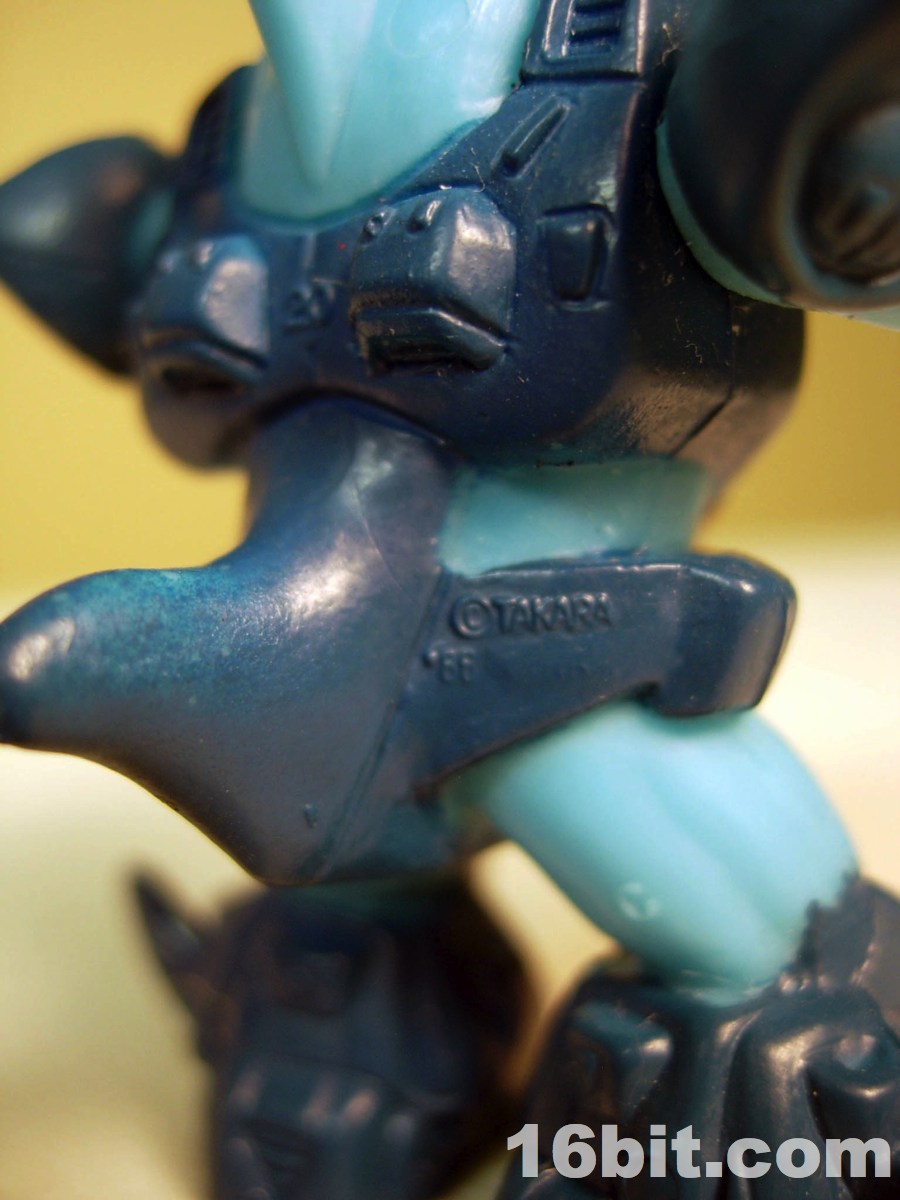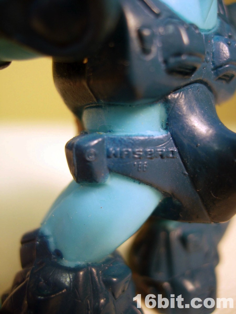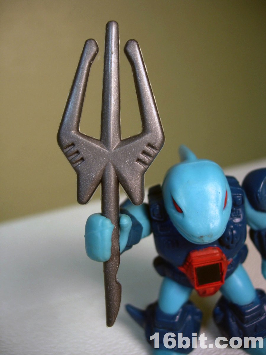 Sawtooth Shark is a blue action figure which was sold in mini-figure 2-packs, although the combinations varied. You get a fight in every pack, with a clearly defined winner and loser. The only reason to keep buying (other than collecting) was to raise the self-esteem of the poor fire creature packaged with your water warrior. Surely, he would win next time! Anyway, the sculpting on these little guys was done by Takara, and the heads (specifically the eyes) show the influence of robots and other Japanese toys from the era which came out of Takara and Tomy. Hekc you can see some of the Battle Beasts in the Headmasters cartoons from Japan. With only two joints, this was-- in every sense of the word-- a cheap figure. Unlike M.U.S.C.L.E. or other "collectible" figure ranges, the figures were painted with 2-3 colors per plus they were armed with some form of melee weapon.* In the Sawtooth Shark's case, he was armed with a swell (and appropriate) trident which fits nicely in either of his fists. He's covered in robotic armor, plus has a dorsal fin, a "tail" under his aft armor, vents, bolts, and other panels. I remember wondering as a child "Why doesn't he have something to help him breathe on land?" I'm still wondering. What I do know is that the red eyes sit nicely in his blue head, and his dark blue armor looks nice, too. Granted, when I think "shark" I usually think grey, but I guess this fishy fellow has to sell the notion of water given the fact he has feet.