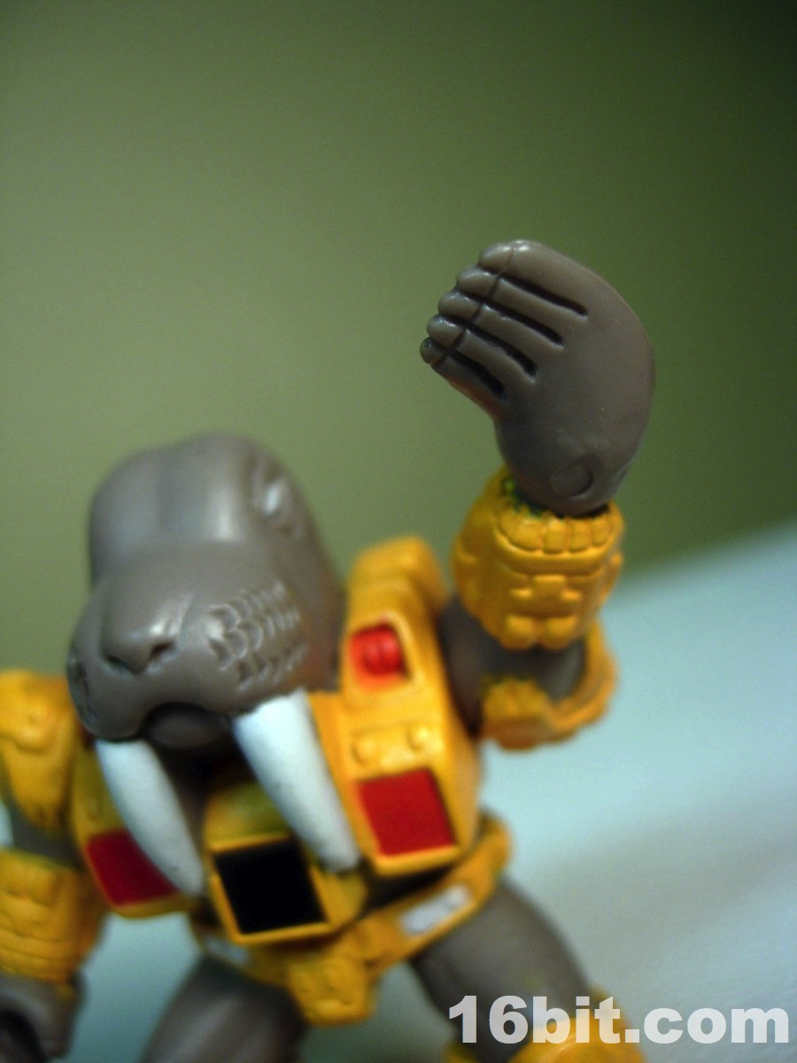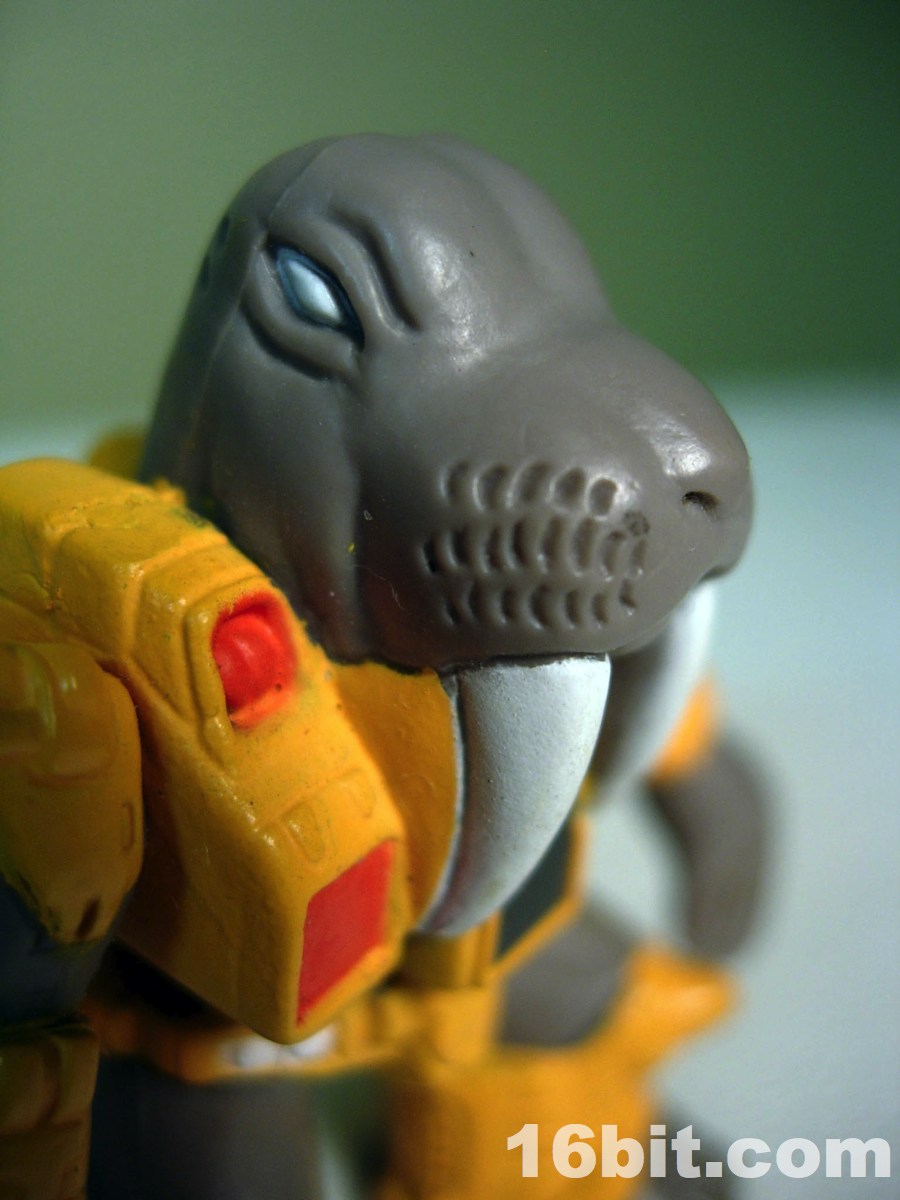 Series 2 of Battle Beasts refined the figures a little bit with better paint jobs, stranger figure choices, and big changes to their feet. The copyright information was moved to the soles of the figures, and a foot peg hole was added-- previously released Series 1 figures had flat feet (like Gormiti toys) and the copyright information was usually on their backs. Wolfgang Walrus is a fine example of a good concept refined in its second series, and he also just happens to look more than a little like the Transformers toy Longtooth. As I'm a sucker for ocean life toys, this was one of the many figures I requested as a kid and by gum I've still got him.