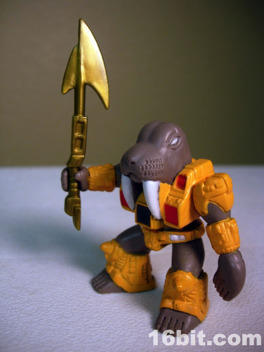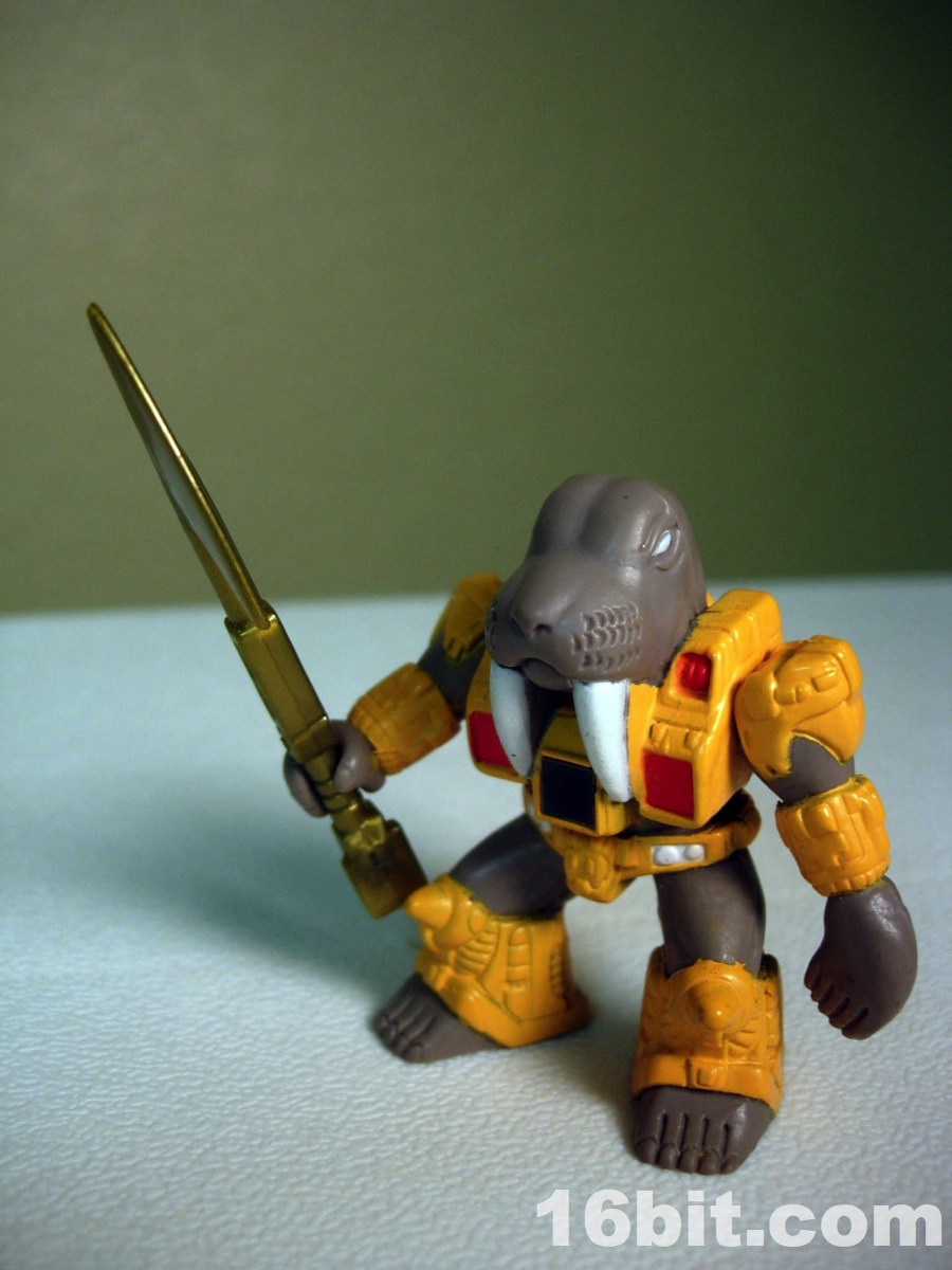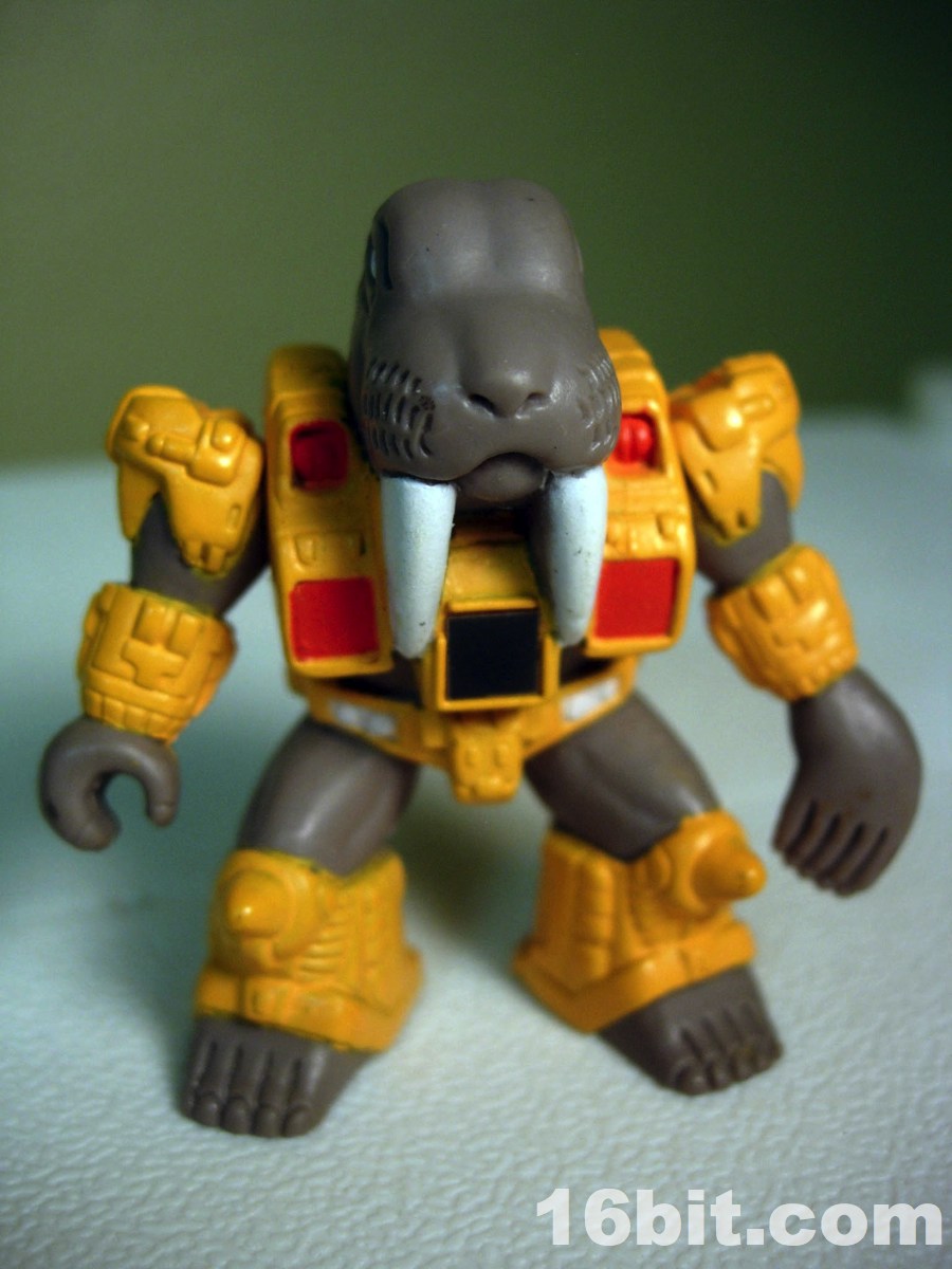 Wolfgang measures about 2-inches tall and has 2 points of articulation, like most figures in the line. His right hand can grip weapons (his own, or most 3mm weapons like LEGO or Transformers Cyberverse) while his left hand is a flipper which can grip nothing. A variation exists too, with unpainted tusks and some added green detail on his armor. Neither seems to be more desirable, but hey-- who doesn't love a good, unnecessary variation? Like all figures in the first chunk of the line, he has feet with toes and he wears a robotic suit. In his case, it's more or less a thong. With his grey skin, Takara could have probably easily retooled him into a Manatee if they just dropped the tusks.
