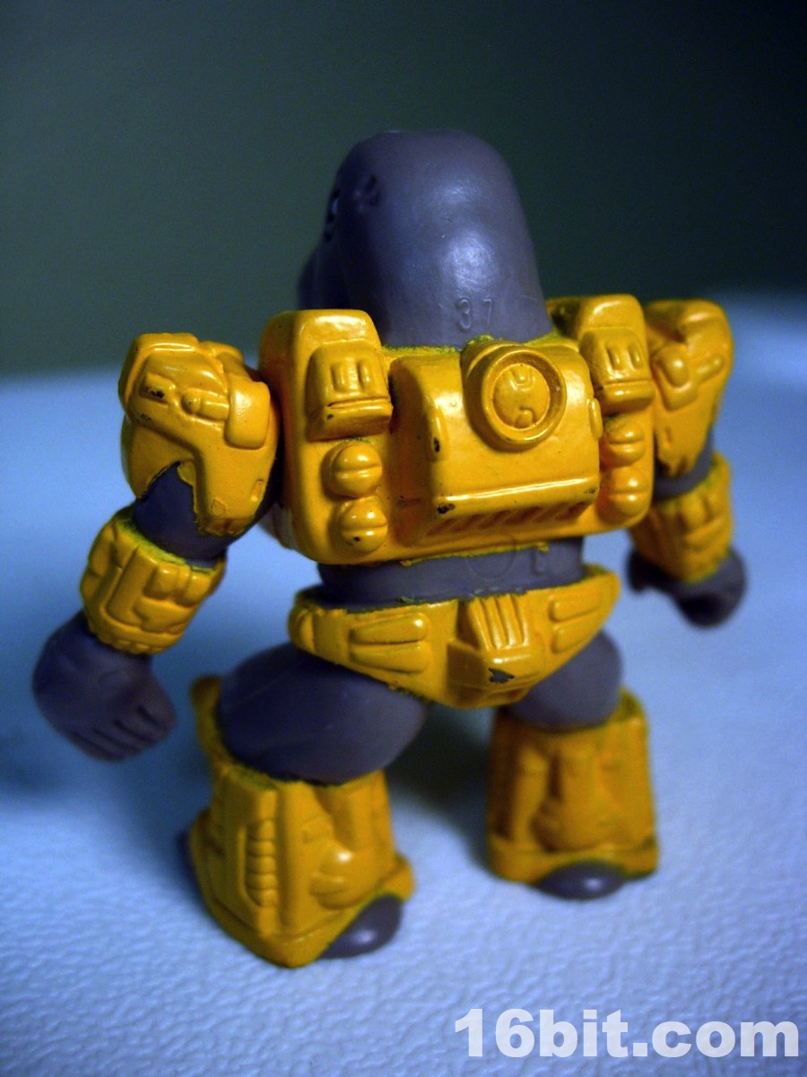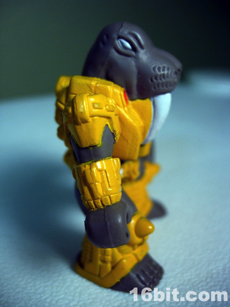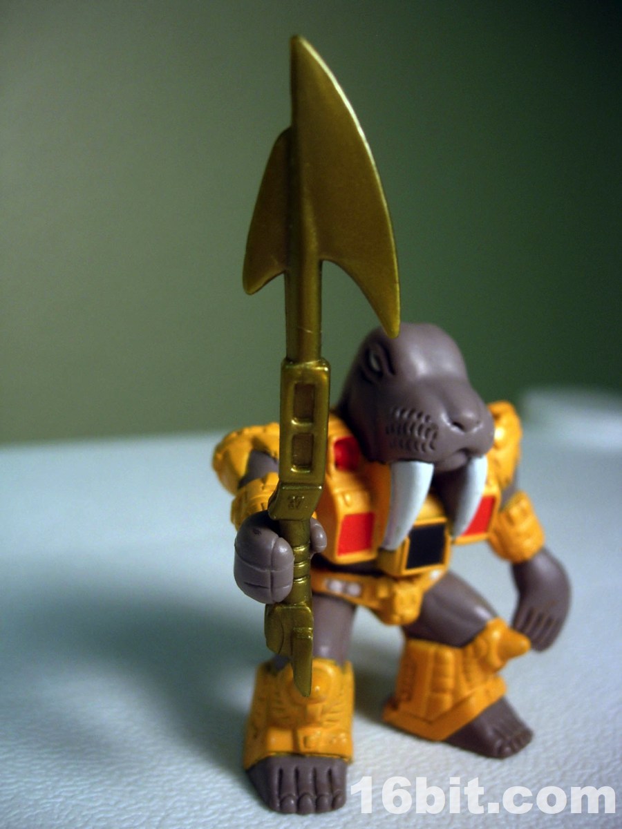 Wolfgang measures about 2-inches tall and has 2 points of articulation, like most figures in the line. His right hand can grip weapons (his own, or most 3mm weapons like LEGO or Transformers Cyberverse) while his left hand is a flipper which can grip nothing. A variation exists too, with unpainted tusks and some added green detail on his armor. Neither seems to be more desirable, but hey-- who doesn't love a good, unnecessary variation? Like all figures in the first chunk of the line, he has feet with toes and he wears a robotic suit. In his case, it's more or less a thong. With his grey skin, Takara could have probably easily retooled him into a Manatee if they just dropped the tusks.