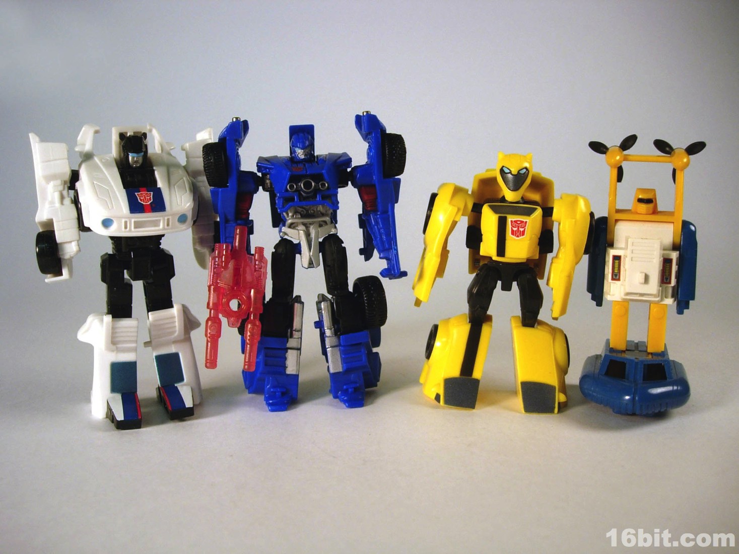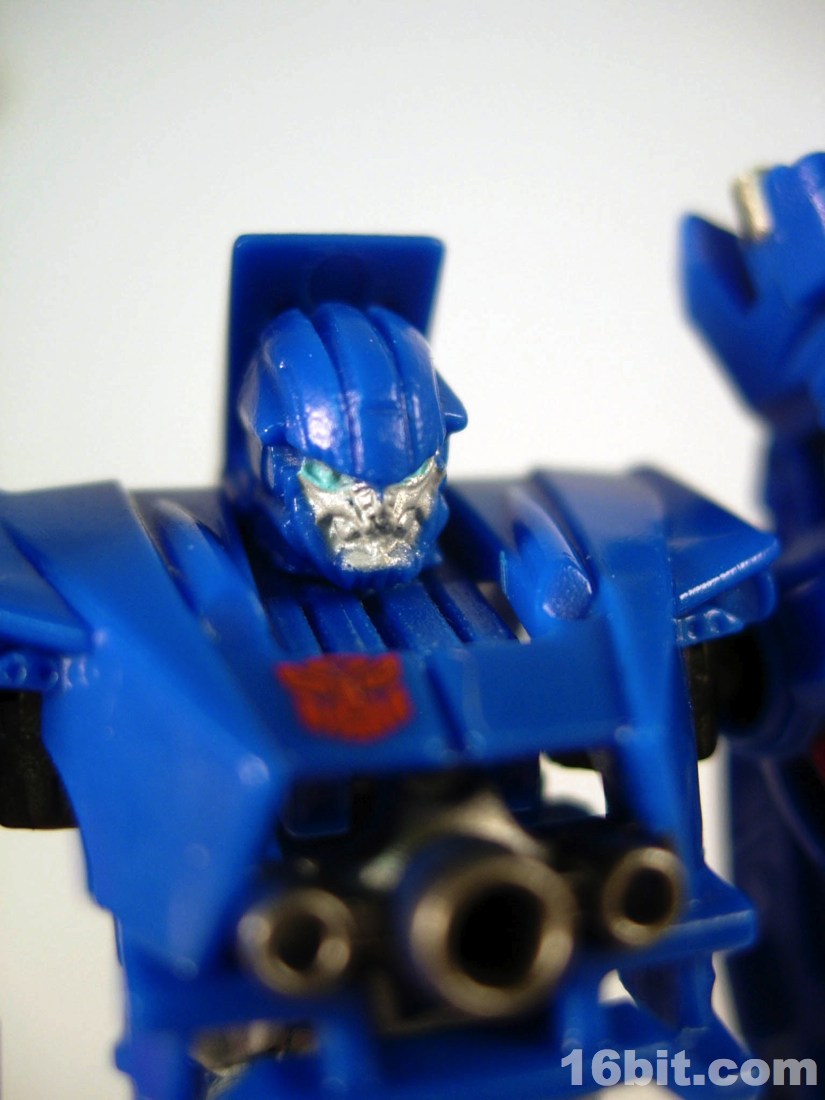 The robot mode is also quite nice, but it has all the usual trappings of this smaller 3-inch figure scale. He is jointed at the shoulders, hips, and sorta the knees while the figure has a decent amount of deco. Silver, light blue, red, black, and yellow paint on this figure no doubt added to the cost, but it looks really slick. The head is more or less "movieverse" but it's not like you can tell at this scale. There are light blue eyes-- which I'm stunned they bothered to paint at this scale-- and a light face helps to bring out some of the sculpted detail. As always bigger toys tend to have more going on, but this one is plenty good and the chest sculpt with the openings on the front are a nice touch.