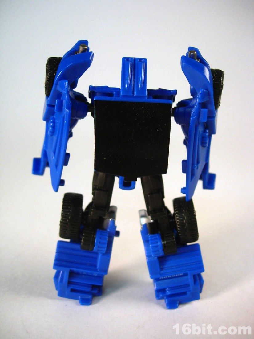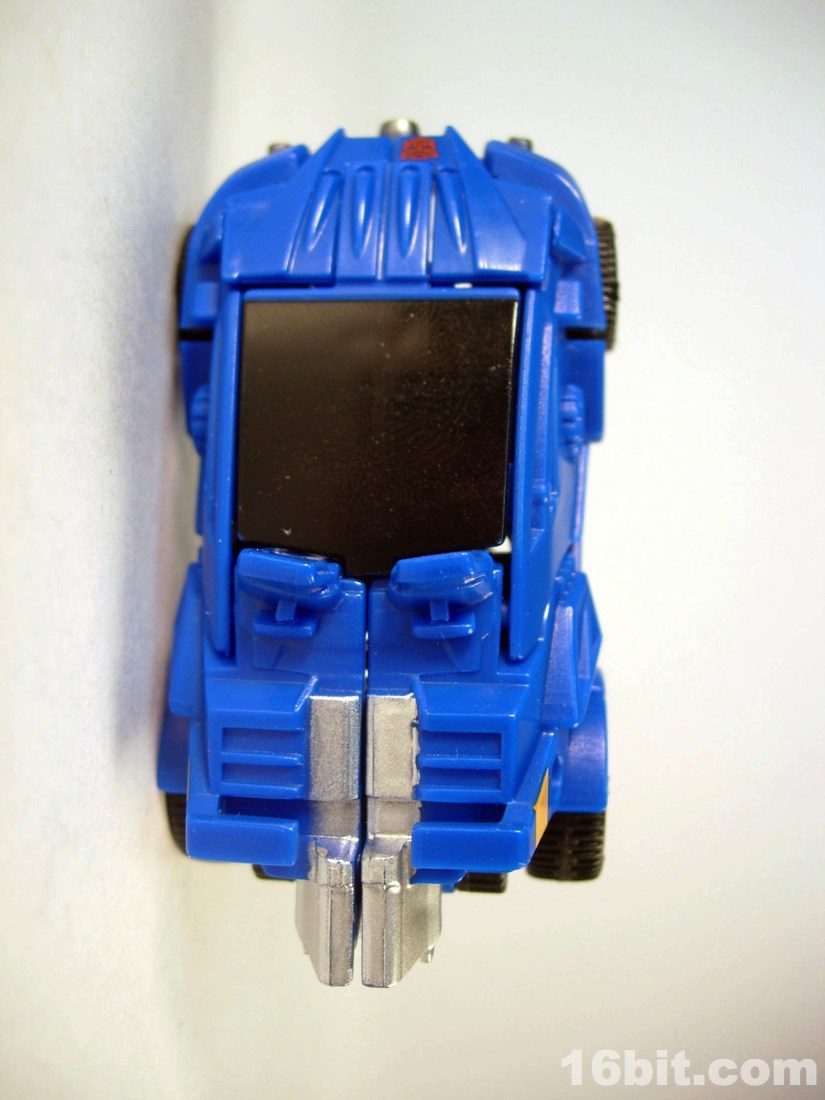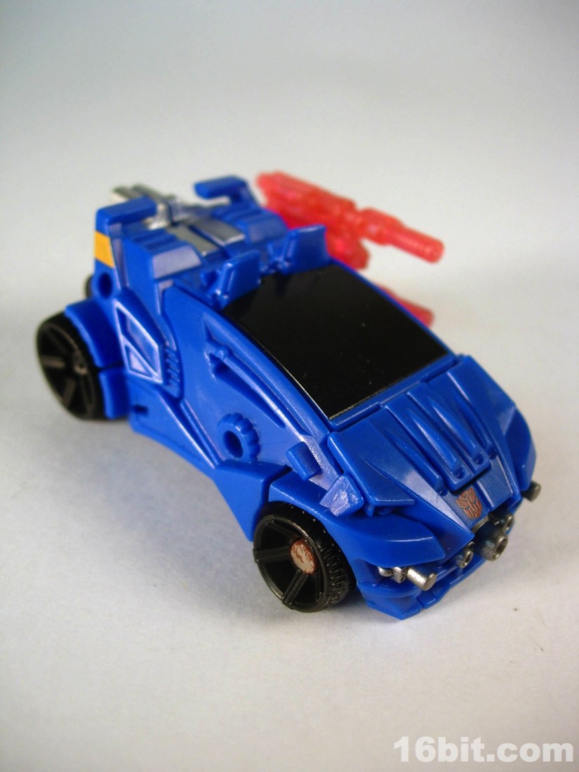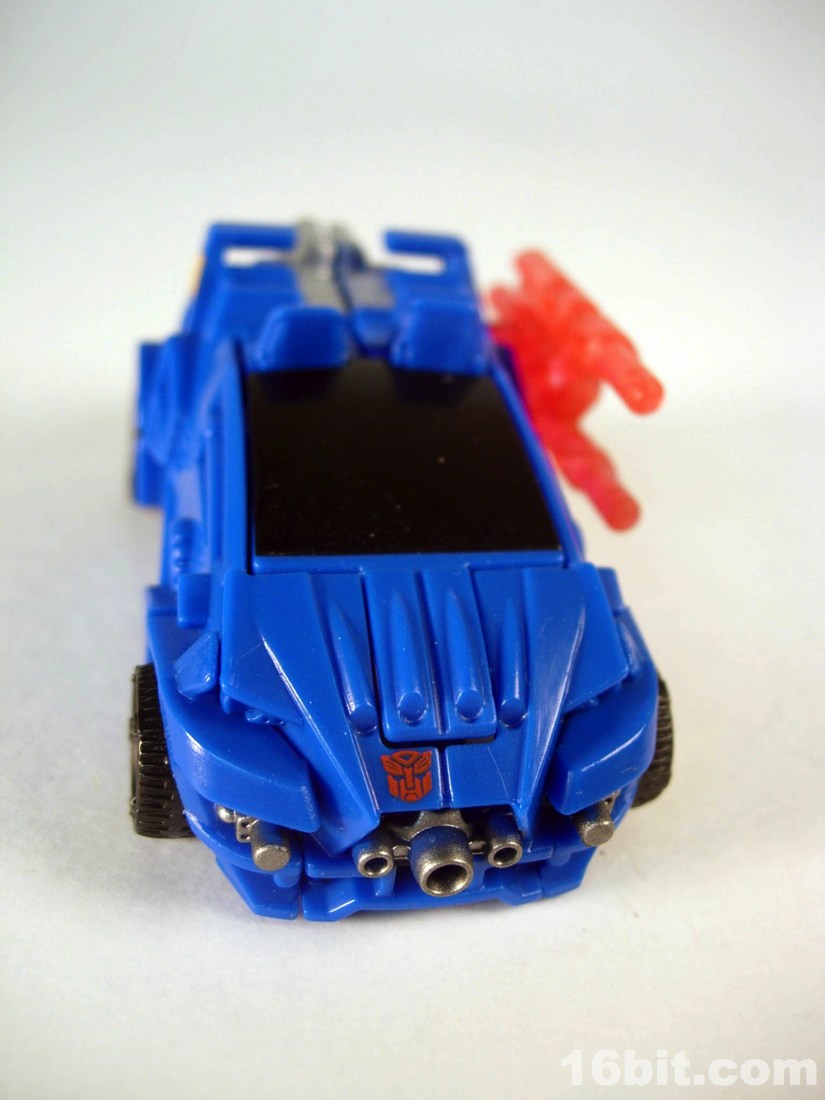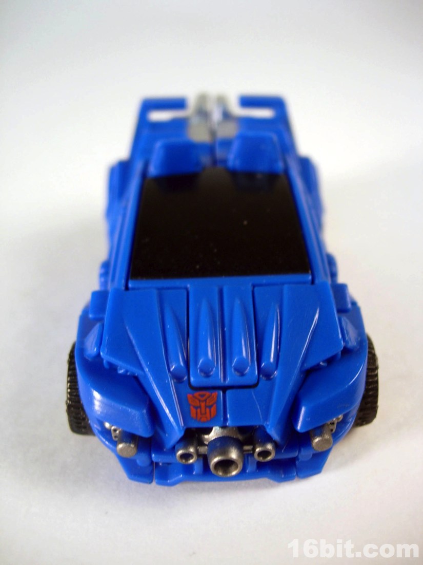 Packaged in robot mode, transformation is just as easy as always. Fold up the legs at the "knees", fold 'em back, and then fold the arms in place and presto-- you get some funky Cybertronian car thing. I really dig the vehicle mode, as the giant windshield reminds me a little bit of the movie (and by movie, I mean 1987) Autobot cars. It's bulky and sleek all at once, which I didn't know was really possible. Granted, I'm not a car guy either, so I just enjoy this thing as a funky toy.
