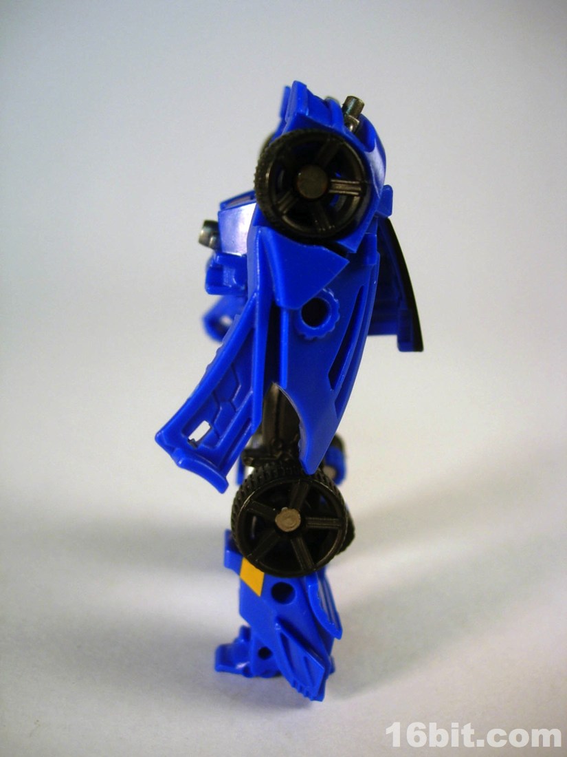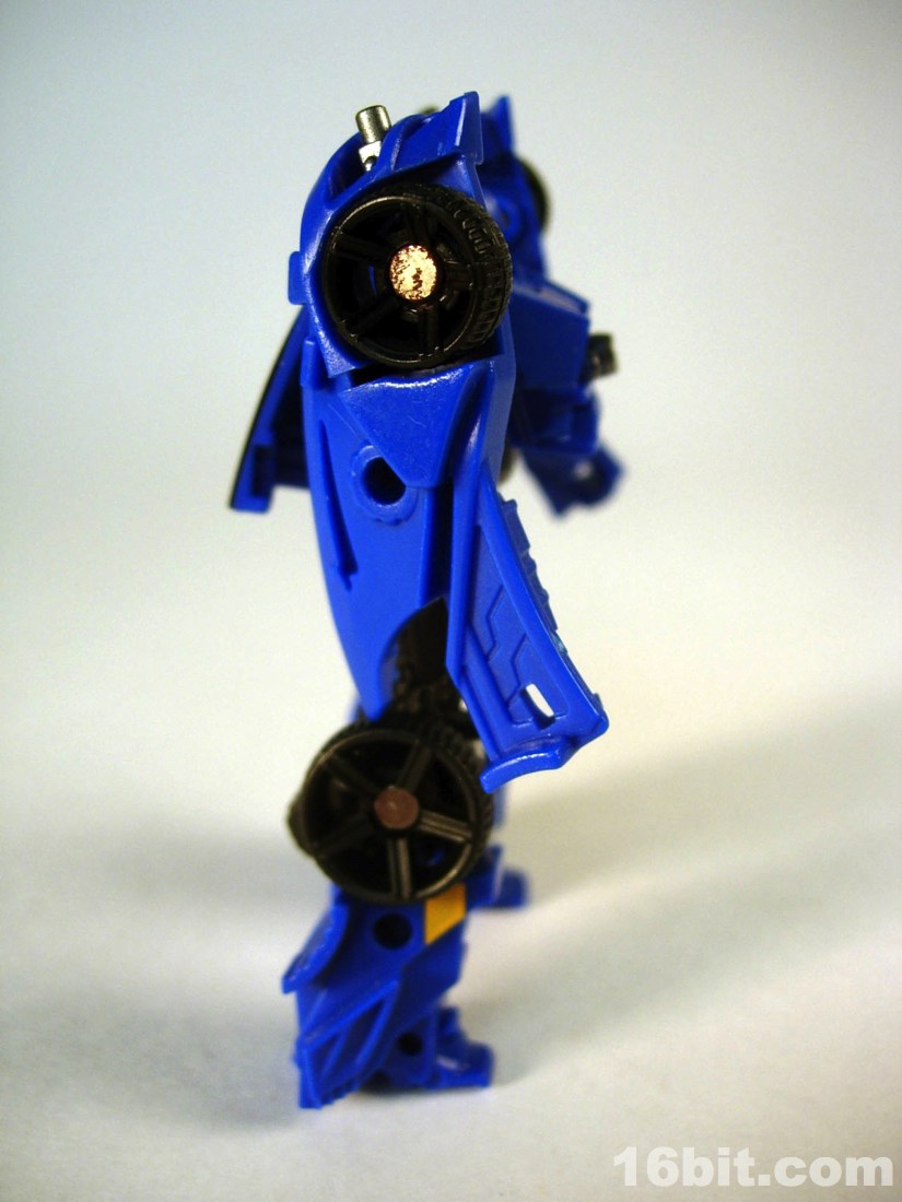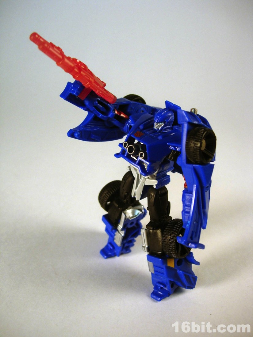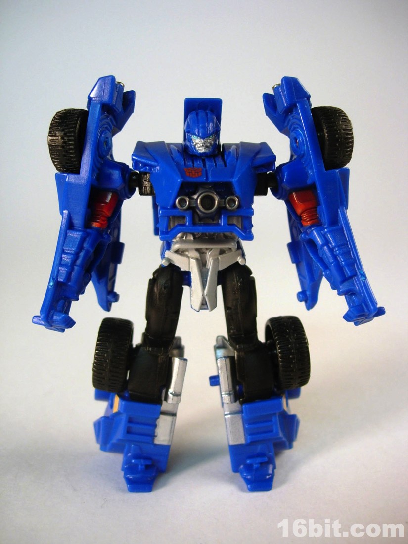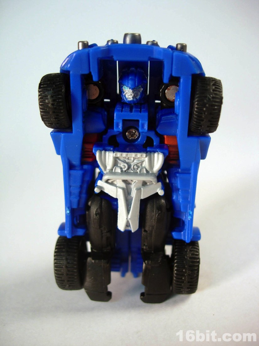 Packaged in robot mode, transformation is just as easy as always. Fold up the legs at the "knees", fold 'em back, and then fold the arms in place and presto-- you get some funky Cybertronian car thing. I really dig the vehicle mode, as the giant windshield reminds me a little bit of the movie (and by movie, I mean 1987) Autobot cars. It's bulky and sleek all at once, which I didn't know was really possible. Granted, I'm not a car guy either, so I just enjoy this thing as a funky toy.