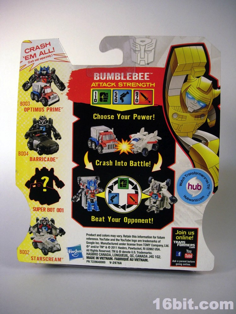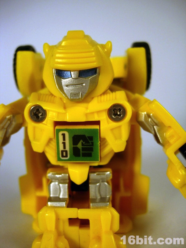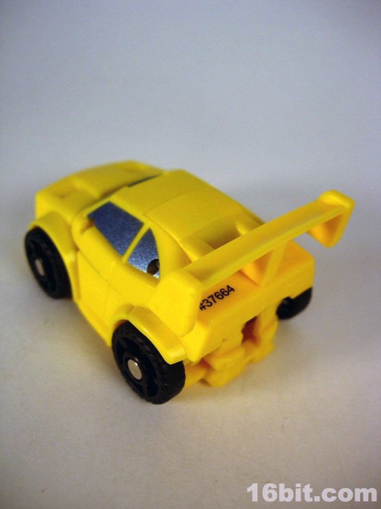 The figure converts to a car by pushing in the arms and feet, and folding down the hood. It's the same on pretty much every figure so far, and sometimes it clicks into place and on some figures, it's a little more difficult. (Each figure varies.) The robot has a lot of simple sculpted detail, while the car... well, it does too. The yellow car has black wheels and painted windows in a metallic bluish color, but the oddest feature is that the Vietnamese factory (unlike most figures made in China) stamped the product SKU on each figure. That's the number Hasbro stamps on the packaging and uses internally to track the figures in the assortments, which generally does not appear on the figure. (Mattel sometimes does this, it's seen on Masters of the Universe Classics for example.) Weird! But now you know what that number is.