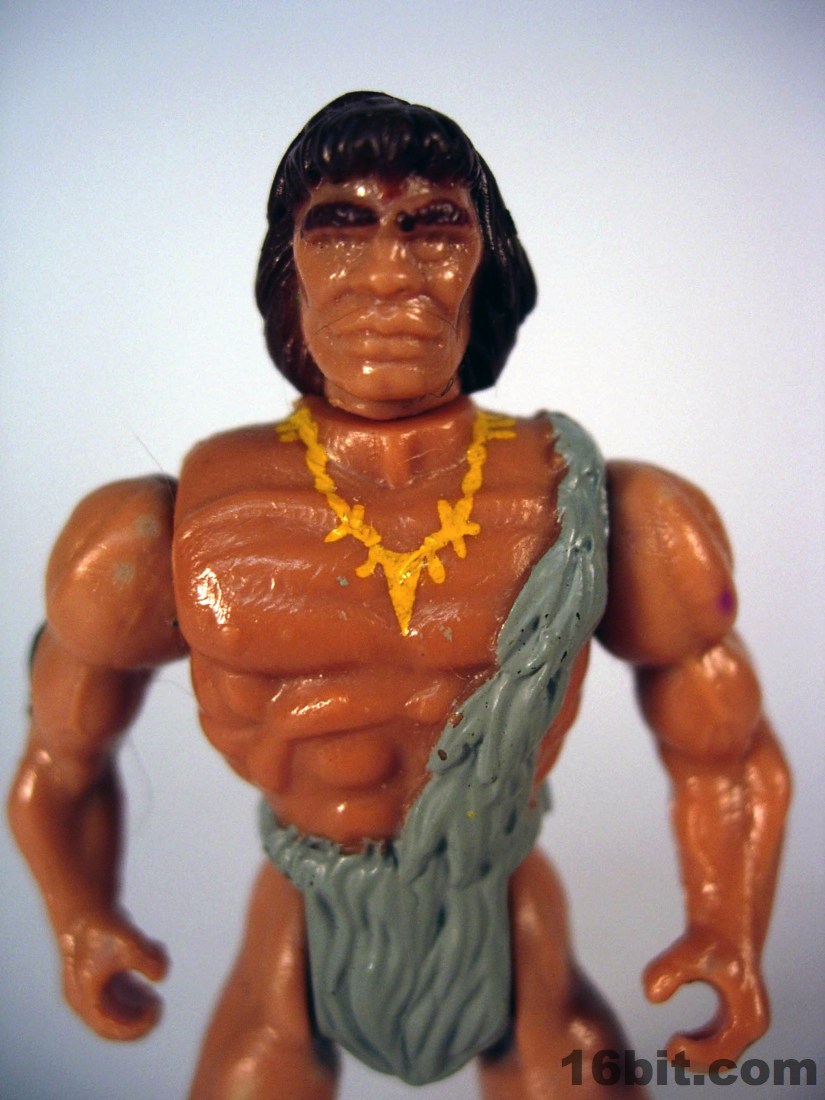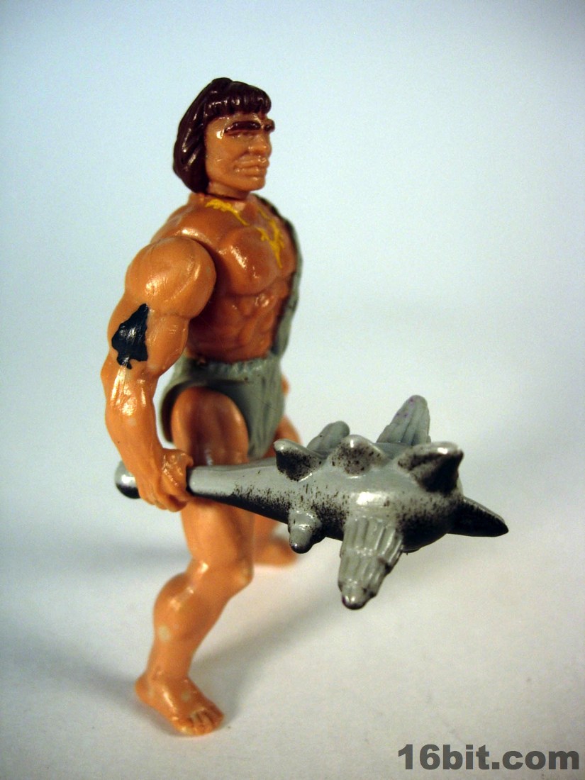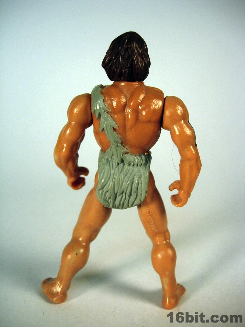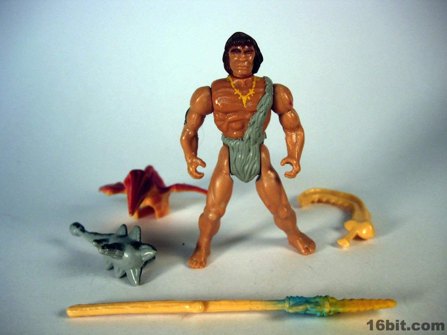 The sculpt is about as good as you should expect from a tiny Kenner caveman from 1988. Five points of articulation, a torso and arms shared with Zur and legs shared with other figures, and muscles galore. The head has painted eyebrows and hair, with the eyes left untouched. Rather than sculpt on unique features, he has a yellow necklace painted on his chest and a stone arrowhead on his arm, which I believe I assumed was a Christmas tree until the late 1990s. He has no problem sitting and his joints move freely, although he may require a little extra support due to his smaller feet. I suggest propping him up with his spear.