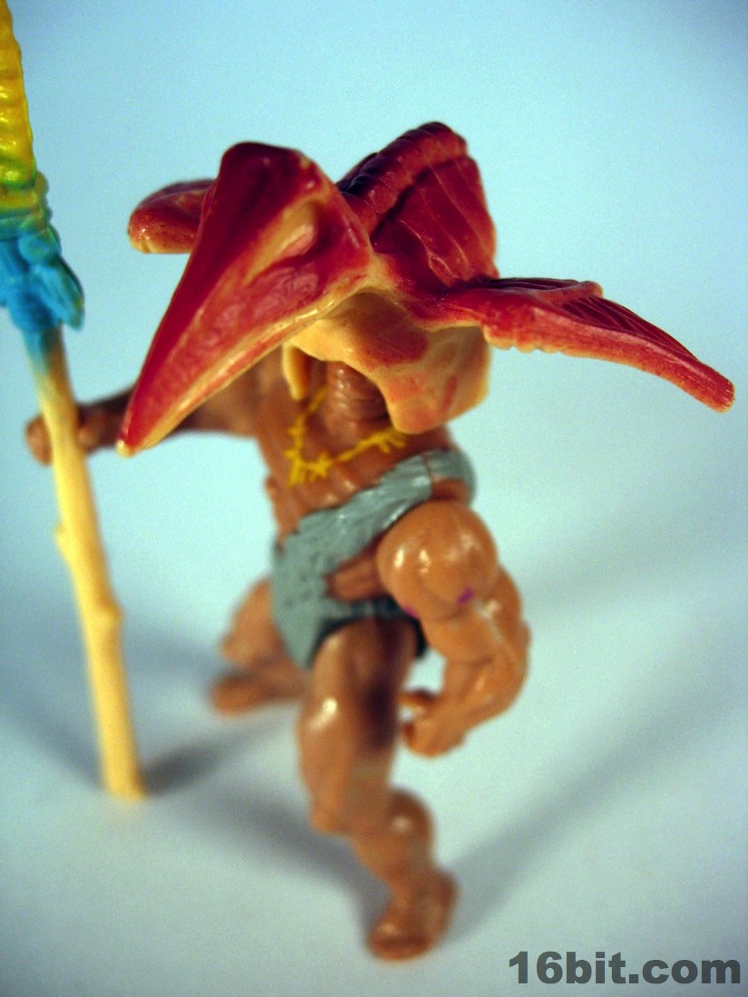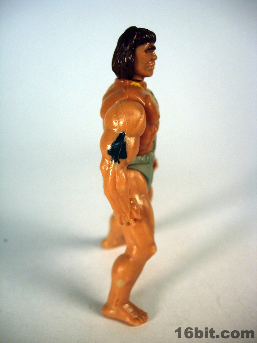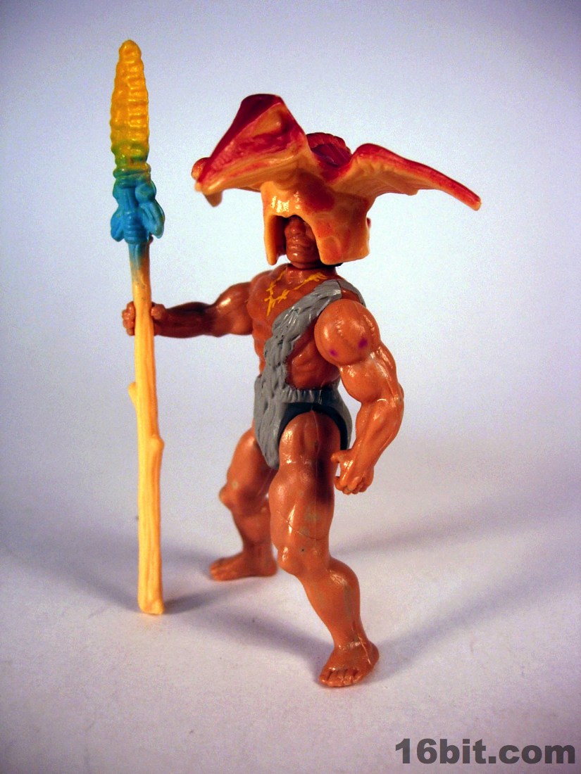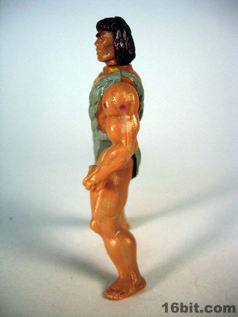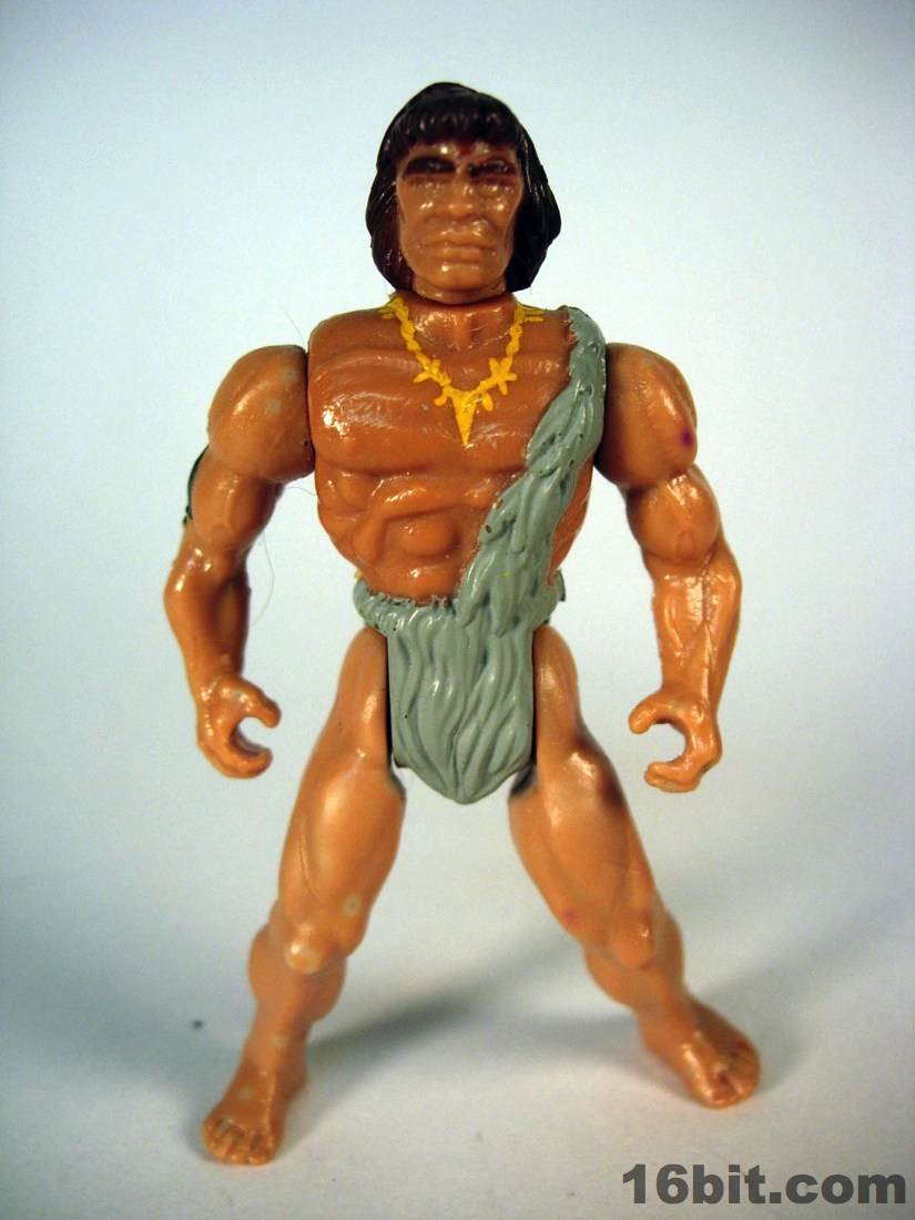 The sculpt is about as good as you should expect from a tiny Kenner caveman from 1988. Five points of articulation, a torso and arms shared with Zur and legs shared with other figures, and muscles galore. The head has painted eyebrows and hair, with the eyes left untouched. Rather than sculpt on unique features, he has a yellow necklace painted on his chest and a stone arrowhead on his arm, which I believe I assumed was a Christmas tree until the late 1990s. He has no problem sitting and his joints move freely, although he may require a little extra support due to his smaller feet. I suggest propping him up with his spear.