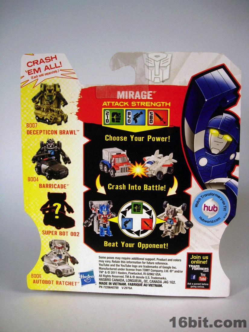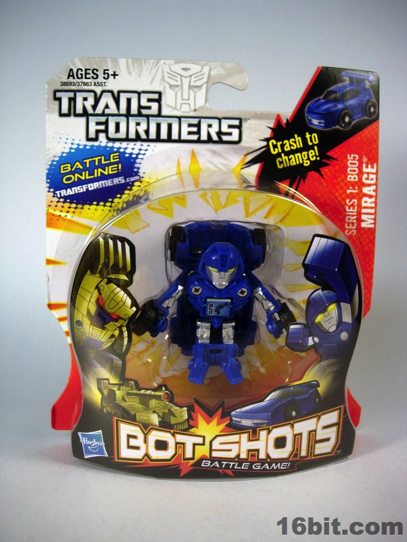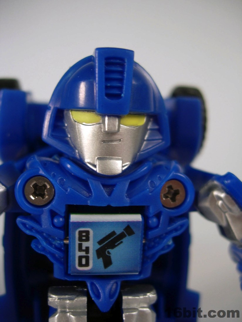 After first having heard about them a while ago, I got pretty excited for Bot Shots. I really didn't expect we'd start digging into classic characters like Mirage so soon, but I'm not complaining! As part of wave 2 (I know it says "series 1" on the package, but trust me, it was part of wave 2) the blue sportscar is loosely inspired by a mix of generations and is distinctive in that it actually has some painted windows. (Most Bot Shots are molded in color and are lacking this detail.) The head sculpt and coloring reek of the 1984 character, but the lack of rally markings and the relatively plain blue detail feel more like something new. Oh, and it's a remold: the basic body is the same as Bumblebee, with a new bumper, hood, spoiler, head/chest. The arms, feet, and the bulk of the body are reused.