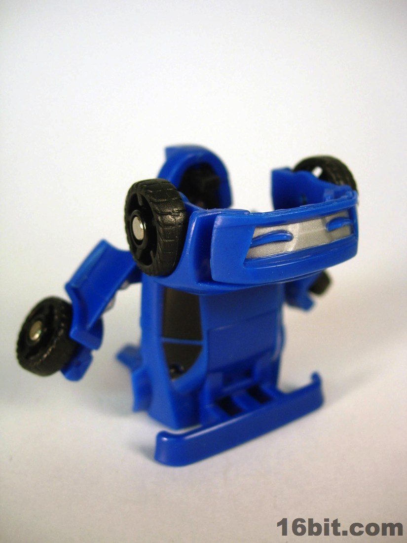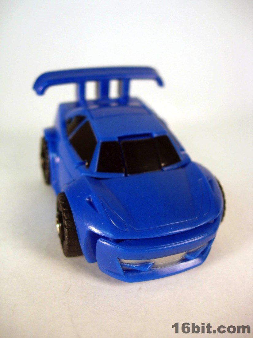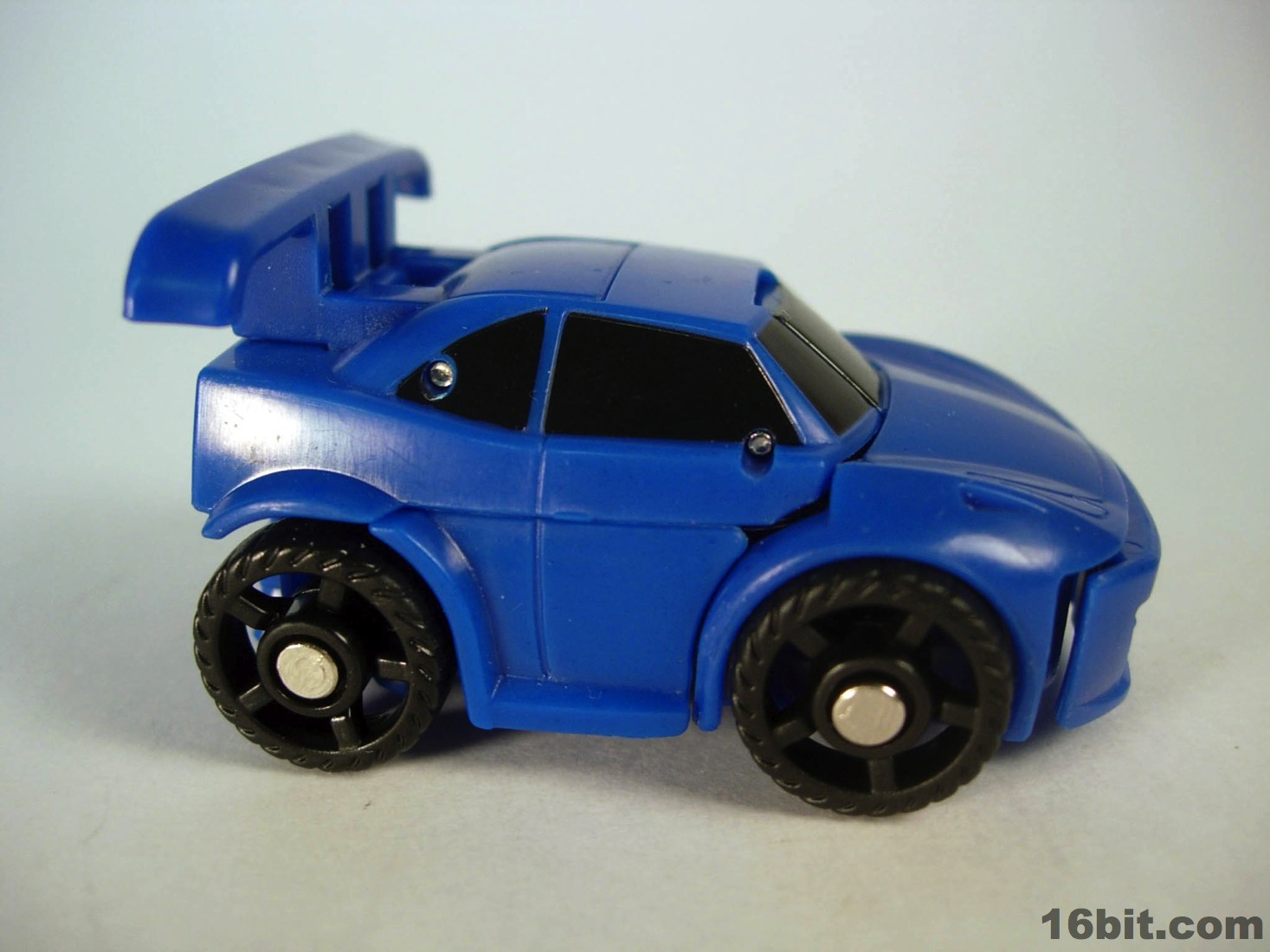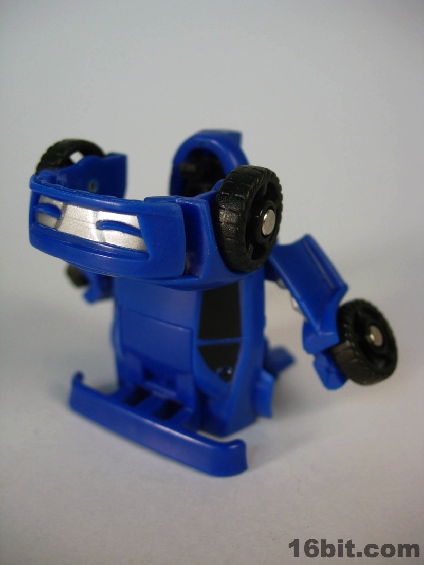 Packaged in robot mode, transformation is painfully easy. Just fold in the arms and feet, fold down the hood, and presto-- you're done. Two transform it into robot, just hit the bumper-- it'll jump into robot mode, and if you hit it just right, he'll even stand up.