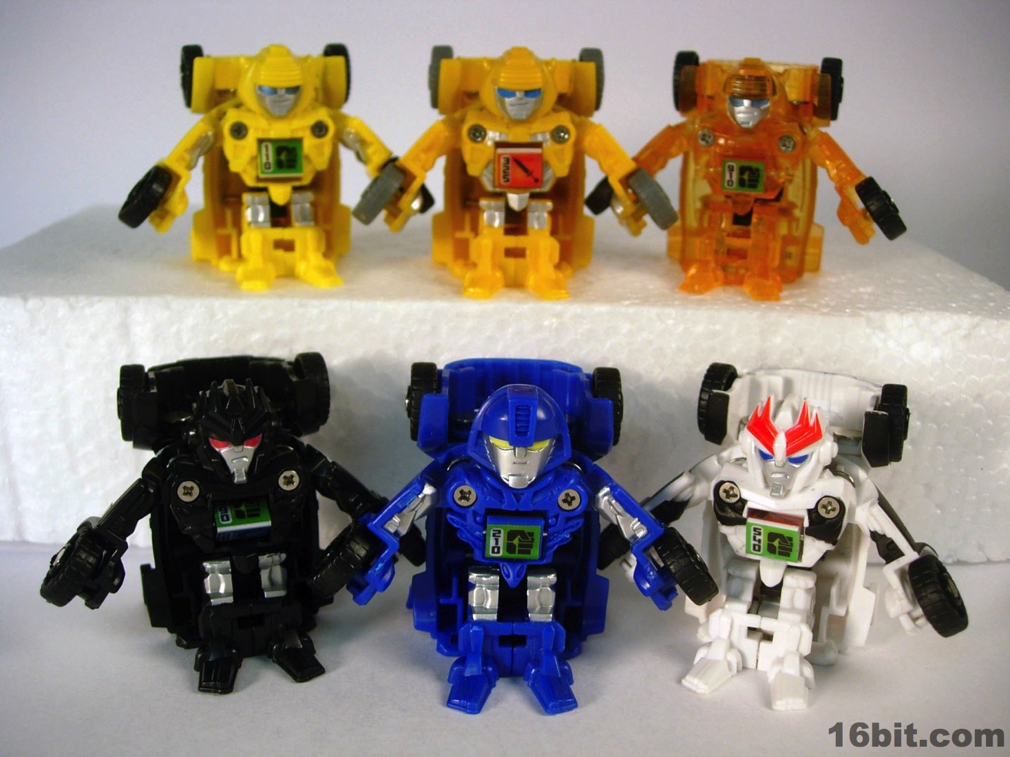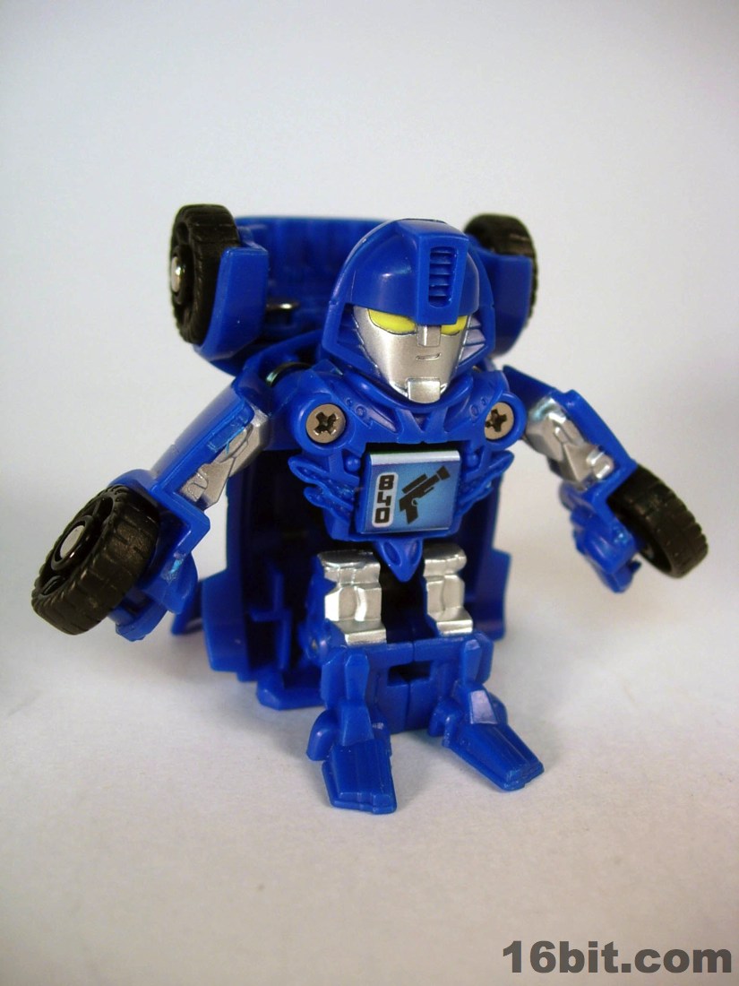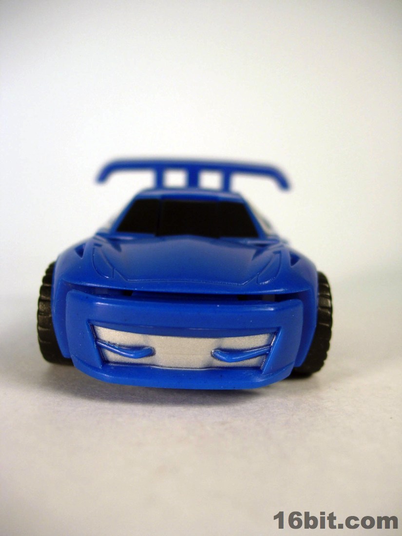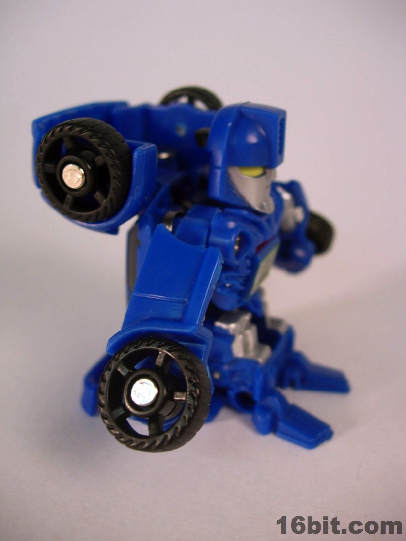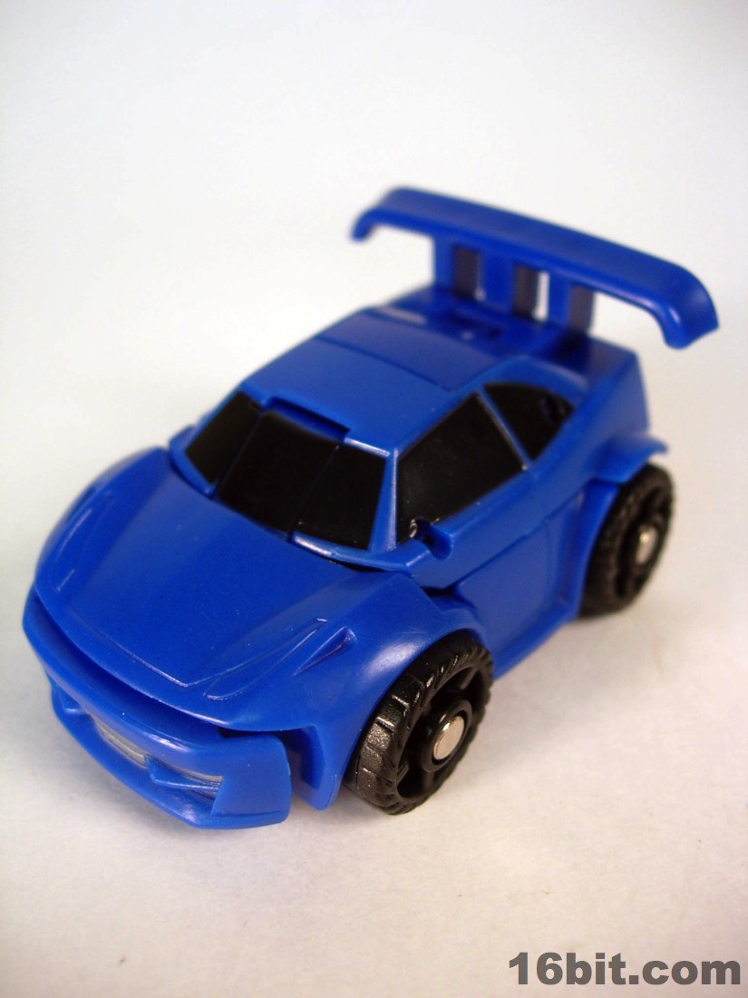 Packaged in robot mode, transformation is painfully easy. Just fold in the arms and feet, fold down the hood, and presto-- you're done. Two transform it into robot, just hit the bumper-- it'll jump into robot mode, and if you hit it just right, he'll even stand up.