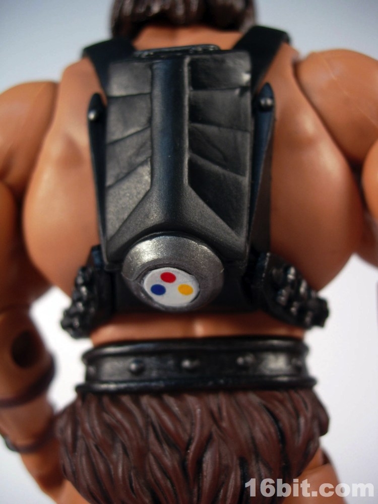 When you get right down to it, the figure is a repainted He-Man body with brown hair, mostly black costume elements, and Zodac's armor. There's nothing new here, and as a gag piece it's pretty awesome. Aside from the name and the bread, the figure has a tiny 3-color tampo on his backside which looks vaguely like the Wonder Bread logo with red, yellow, and blue dots. The original toy is basically a He-Man variant, but this toy is a different character who ran around Eternia before Prince Adam became He-Man and for some reason, he has cooler armor and a gun.