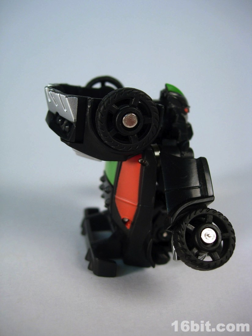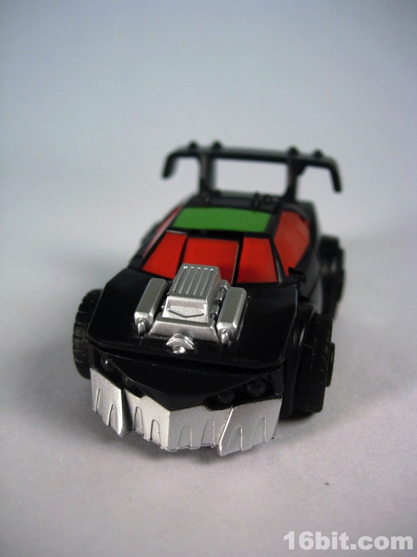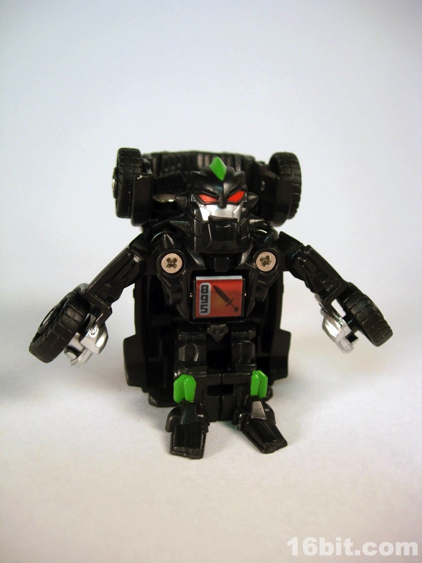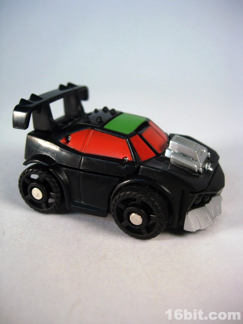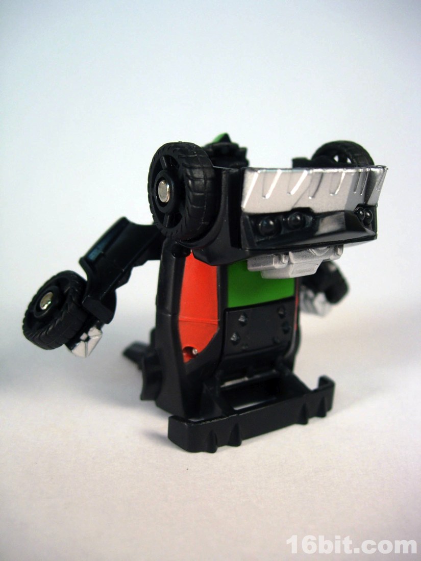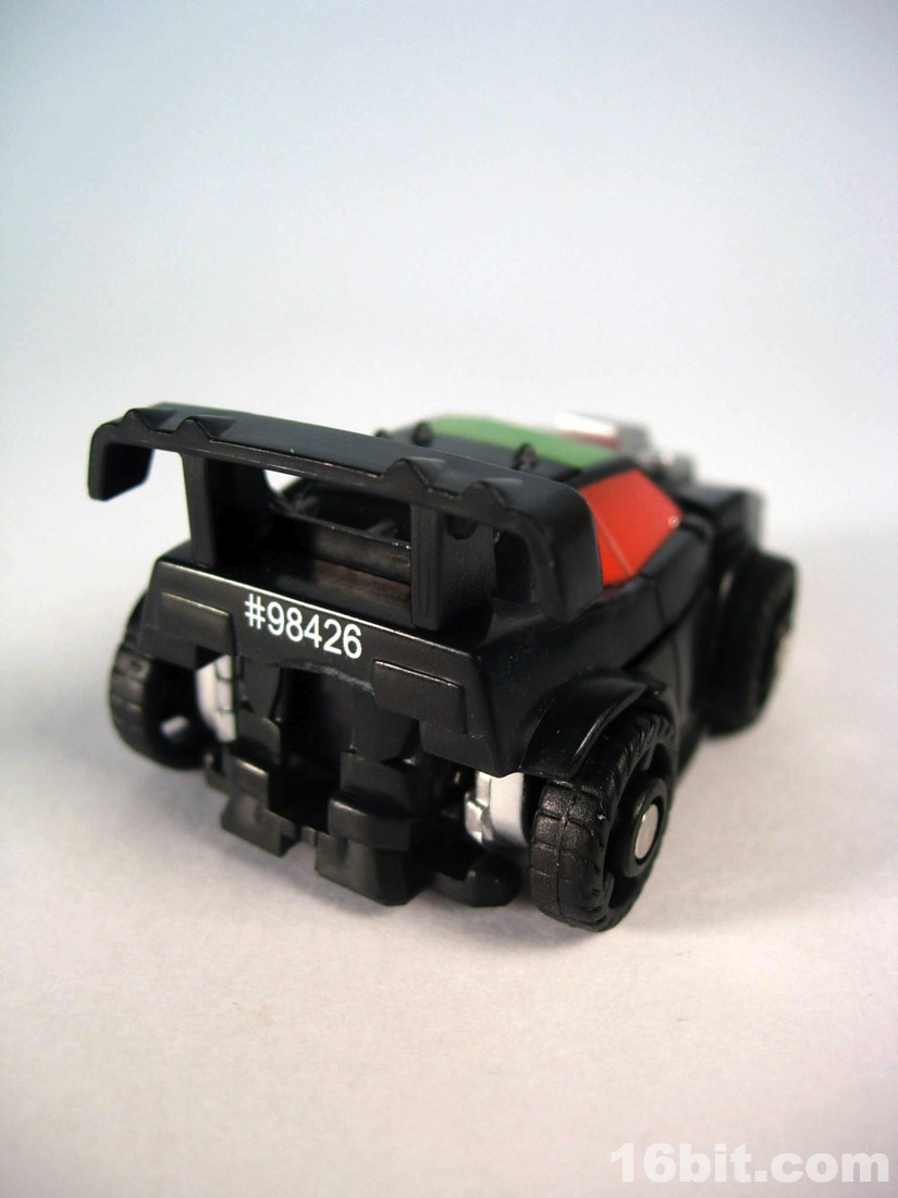 Standing around 2-inches high, this is a pretty nice mini-figure. You'll note many pieces are recycled from Bumblebee (and other sportscar figures) but he has a new head, bumper, hood, and spoiler, plus a nice paint job. The robot is primarily black, but there's enough silver, red, and green to give him some personality. What's particularly interesting is the eyes, rather than try to be symmetrical they have one eye raised slightly, giving him a more thoughtful appearance.