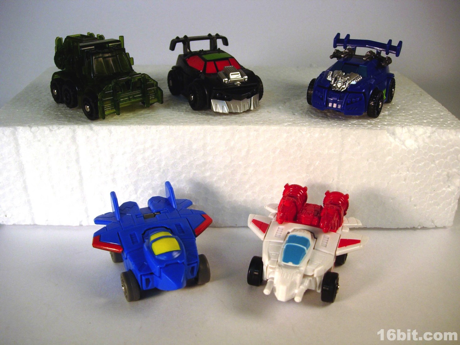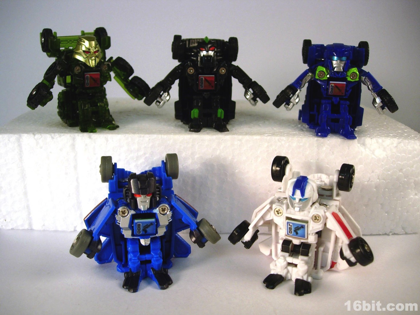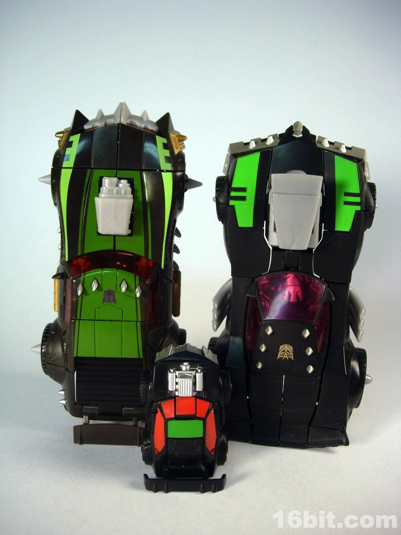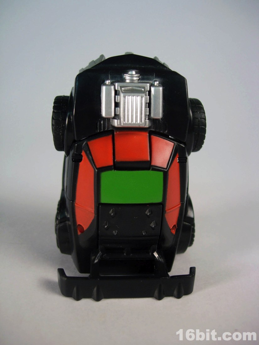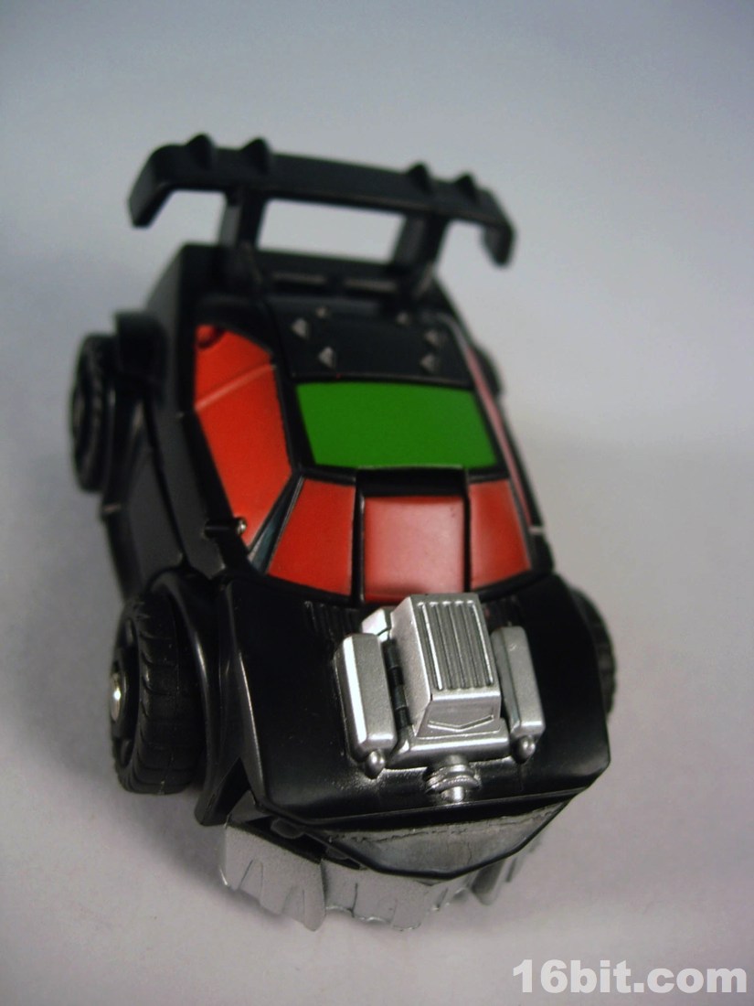 Standing around 2-inches high, this is a pretty nice mini-figure. You'll note many pieces are recycled from Bumblebee (and other sportscar figures) but he has a new head, bumper, hood, and spoiler, plus a nice paint job. The robot is primarily black, but there's enough silver, red, and green to give him some personality. What's particularly interesting is the eyes, rather than try to be symmetrical they have one eye raised slightly, giving him a more thoughtful appearance.