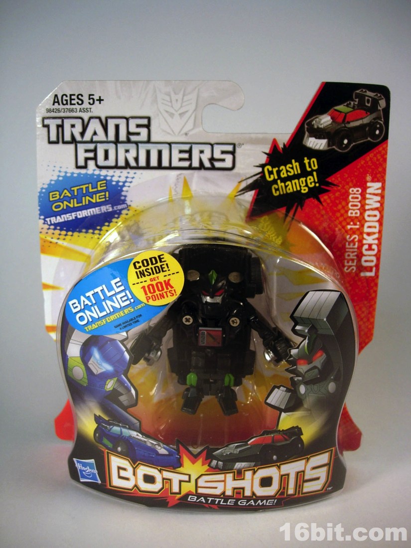 When I saw the list of Bot Shots characters, one that got me the most excited was Lockdown. This was an awesome new character introduced to Transformers by the great Animated cartoon, and he's received a surprisingly large amount of merchandising for someone who is, for all intents and purposes, the new guy. He got a Speeds Stars non-transforming car (which I could never find), a "movie" toy, several animated toys, and now this Bot Shots release. I'm very glad about this for a variety of reasons, not the least of which is that as far as Bot Shots go, this is one of the better releases.