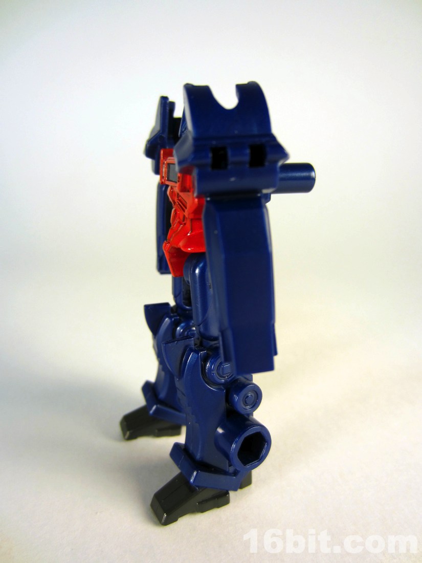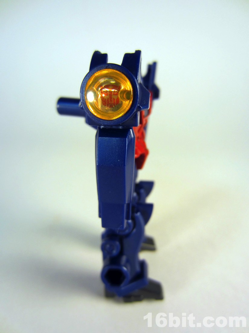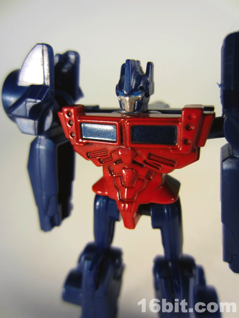 Takara-Tomy Transformers Prime Optimus Prime Blaster Action FigureThe toy is molded in a dark blue color with minimal paint, a red chest and some silver with blue on his face. It really brings this cheap toy to life, and when I say cheap, I mean it. I've bought Kabaya Microns and these feel about as cheap. Interestingly made in Vietnam and not China (like many recent Transformers toys), the little guy has a spark crystal on his shoulder with an Autobot symbol inside. The streamlined design looks like a step or two beyond the current TV show, and almost feels like something out of the distant future of Beast Machines. And I mean that in the "I like these designs" kind of way. Little Optimus has no hands, but he does have jointed shoulders, hips, and knees with ball joints at the shoulders and knees. The range of movement is absolutely acceptable, but he does feel a little flimsier than earlier Mini-Cons but seems to have a stronger sculpt and paint job. The body has little detail outside the head, so in many ways it feels like a throwback.