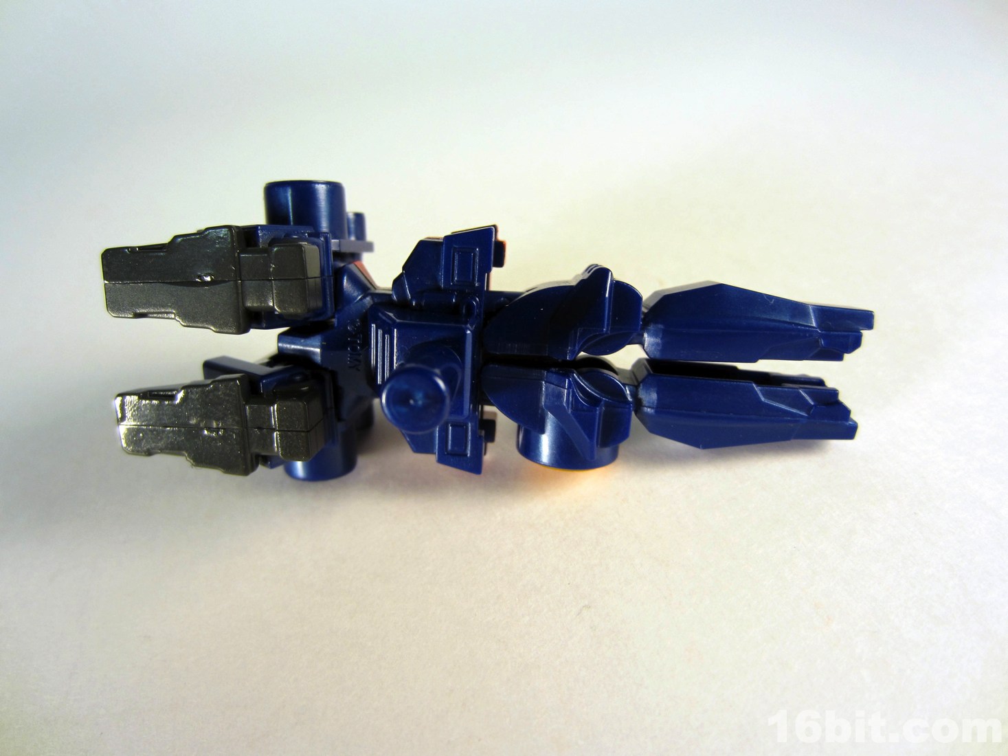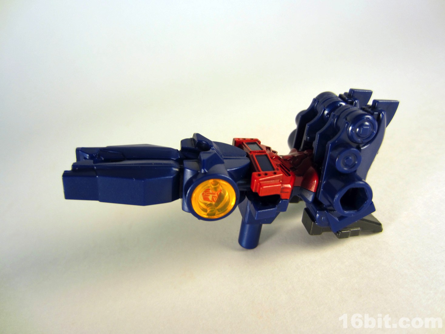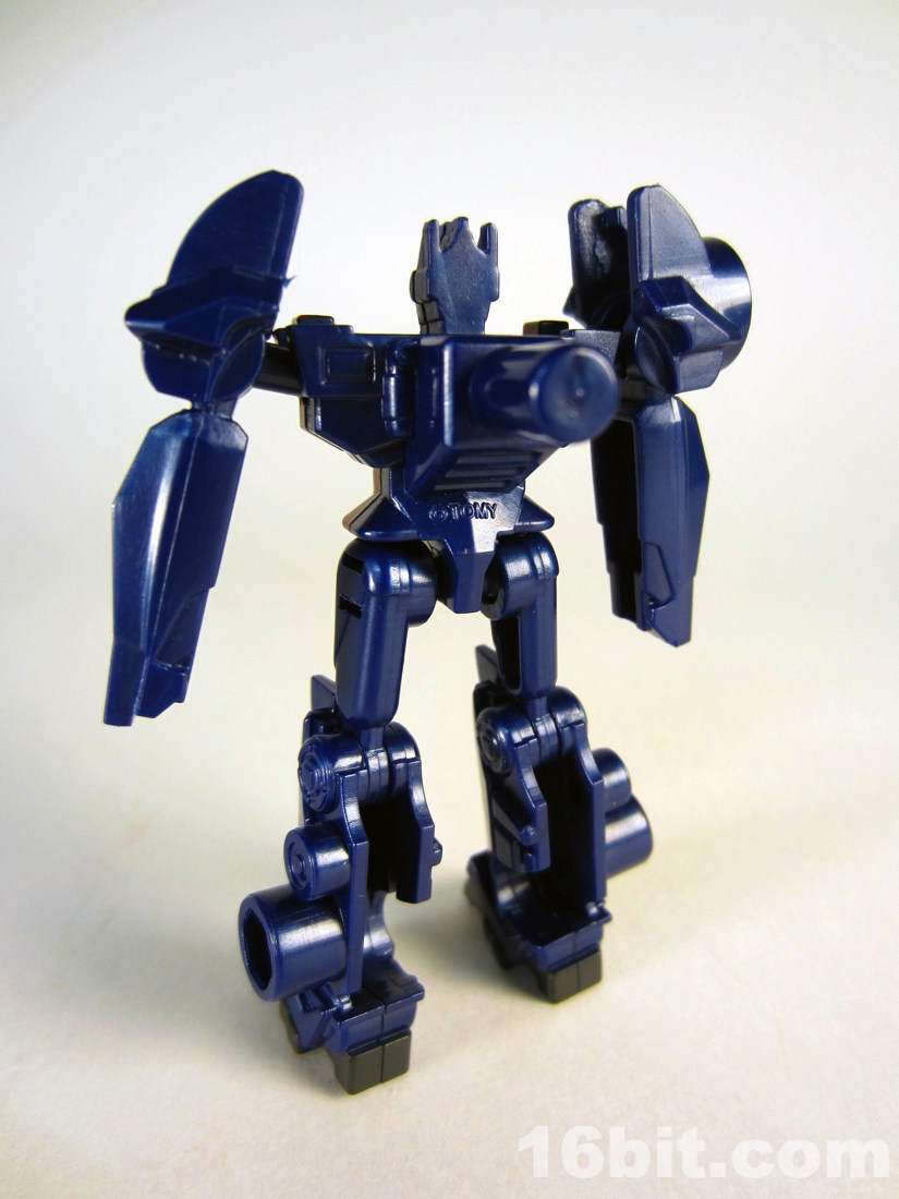 Transforming him to a gun is a little tricky, getting the arms just right being the main problem. Once in gun mode, the hands become the barrel and the legs fold up to make the back half of the gun. His chest is clearly visible, but I gotta say it still looks pretty cool. There are no (intentionally) moving parts in gun mode, so he's just a nice accessory for your larger (and potentially cheaper) toys. If you're a sucker for this kind of gun-to-robot toy like I am, you know you should get one by now.