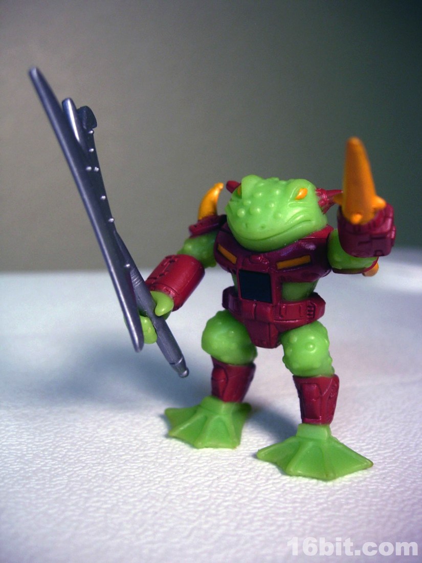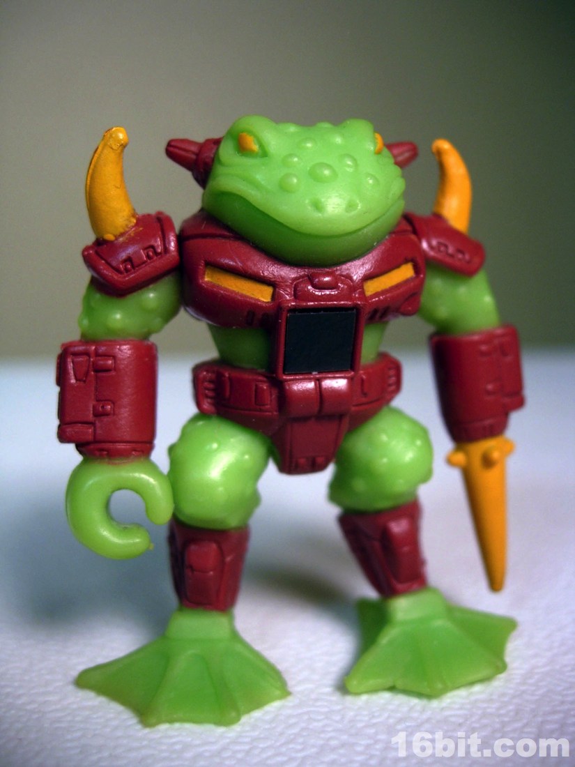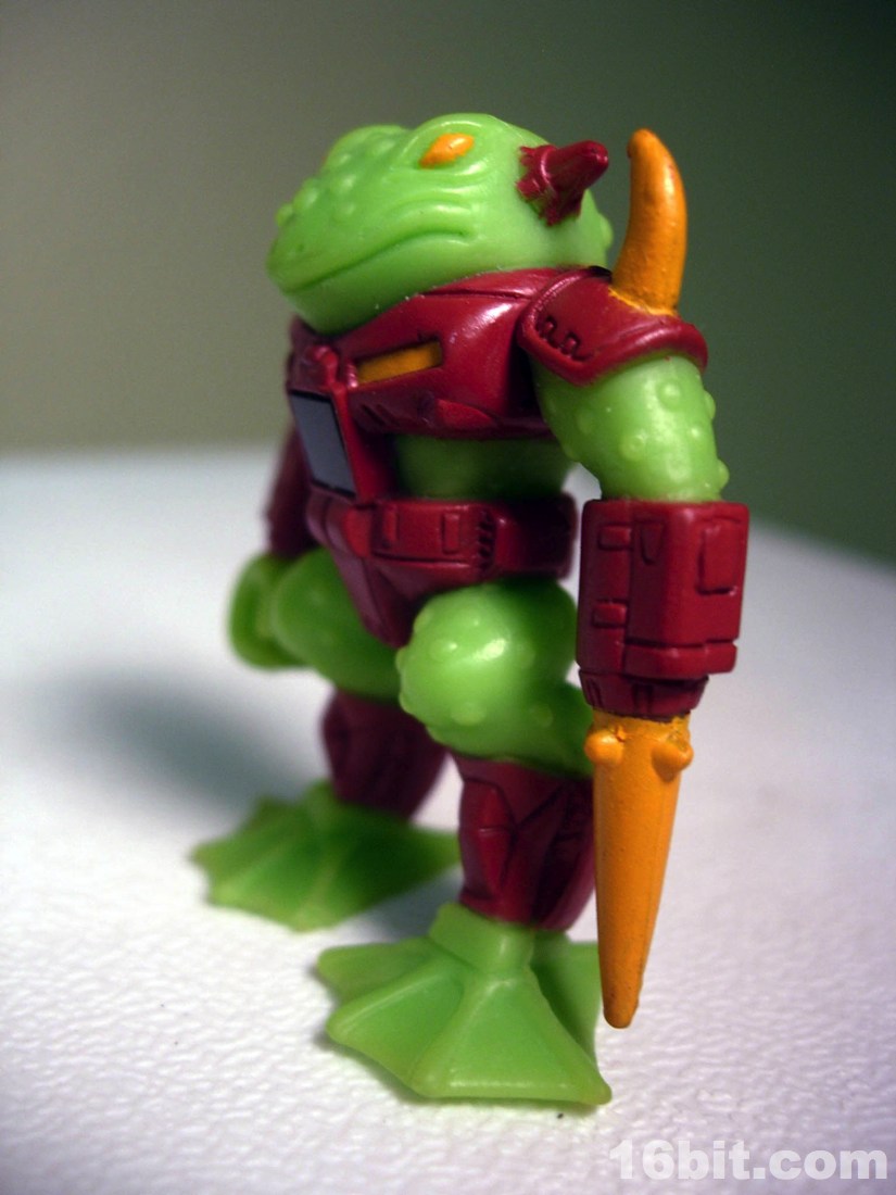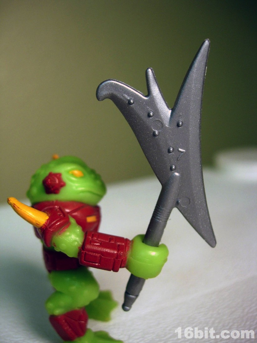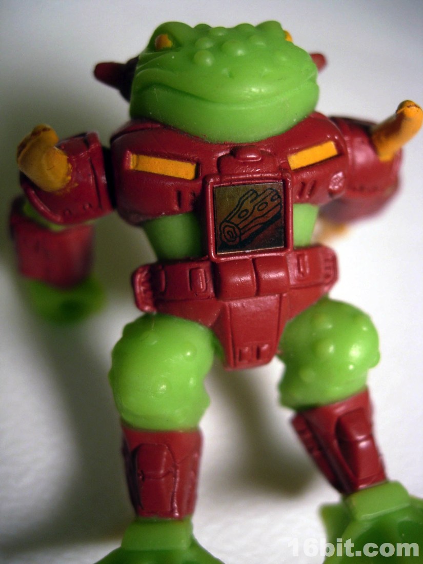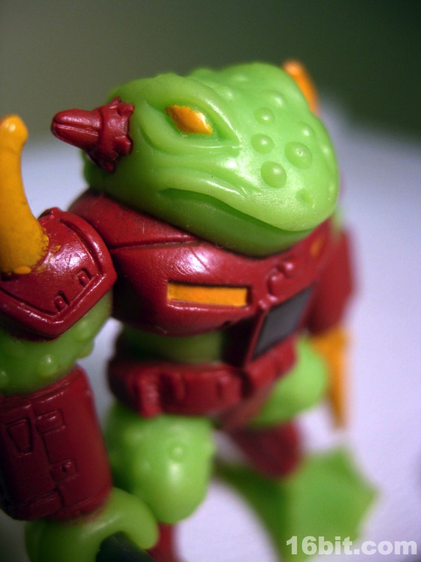 By today's standards, this figure isn't very impressive with its 2 points of articulation. As a kid, though, I was pleased he could stand up and sit in vehicles, plus hold his weapons without toppling over. (Of course, at that age, the notion that a figure could be released which could not stand wasn't even an consideration.) While it was a step back from the standard 4-5 joints of his day, you got two figures for roughly the price of one, and what kid doesn't love that? Horny Toad also predated the Ninja Turtles toys by a bit, which of course had their own bipedal mutant frogs. I still like this one more, it's just so... geez, just look at it. You don't have any other toys like this.