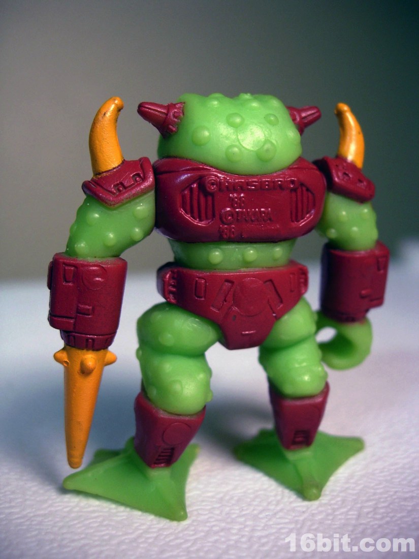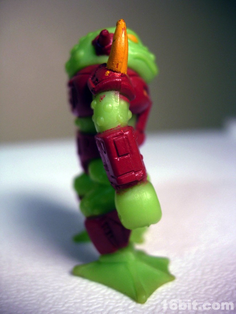 Its Japanese name made a little more sense-- I say "little" because the thing on his arm really didn't look like a drill-- but the design was really quite good. Compared to other action figures of its day, the fact that this guy had warts, panels, rivets, and all sorts of little sculpted elements was quite remarkable. Really, the only place this figure (and most Battle Beasts) fall short are in the hands, which are all pretty much the same looking for the first couple of series. Featureless, they do a bang-up job holding the weapons and filling their toy-driven role.... but it's the rest of the figure that really stands out. If you look at the close-up headshot of the top of the review, get in close and look at the paint and the sculpting. The green plastic lets the warts melt right into it, and there's a subtle ring under the eye. The painted armor is beautiful, the color really brings out the detail when the shadows dance off the lines. Of course, the orange spikes, the drill, and the "lights" on the chest also look great and make the figure really come to life.