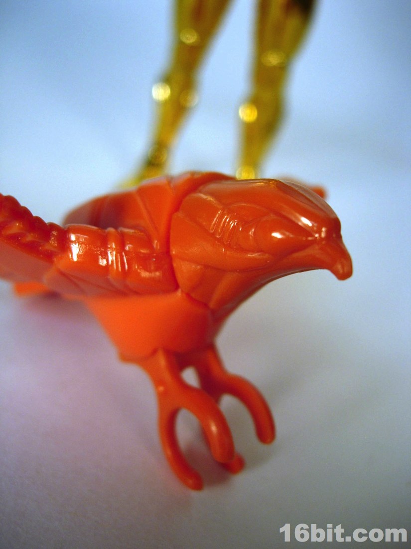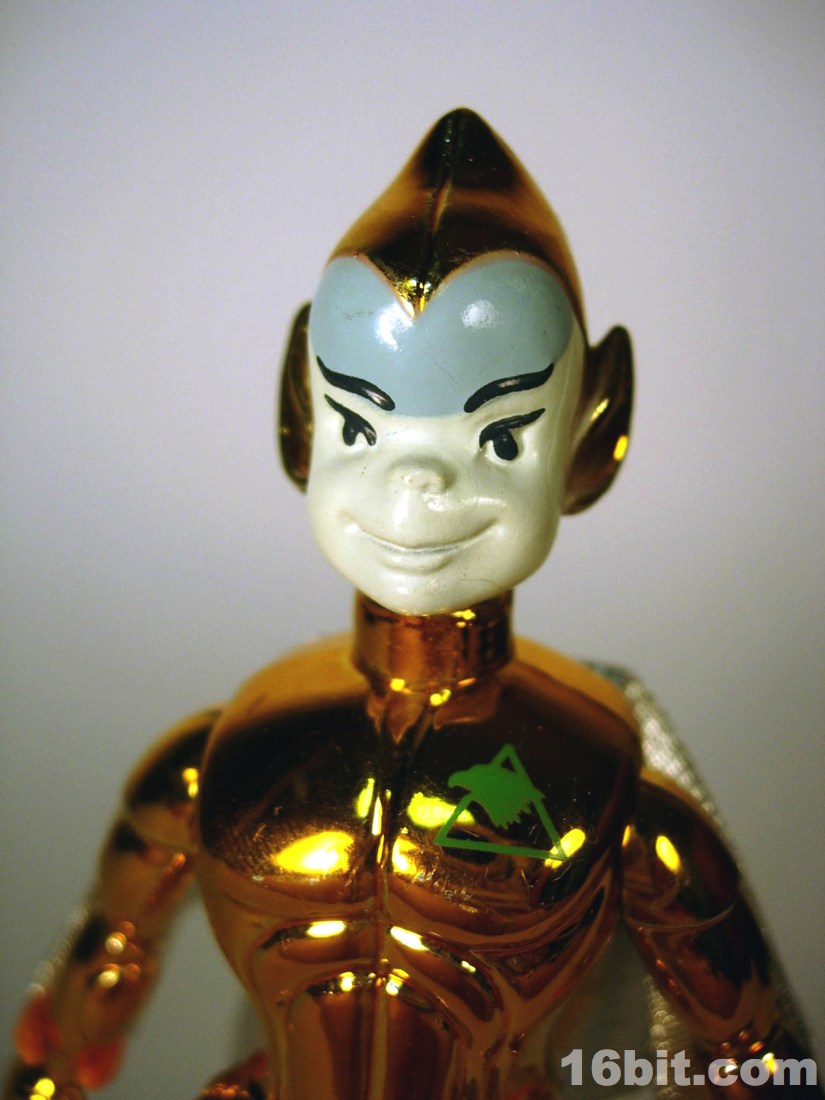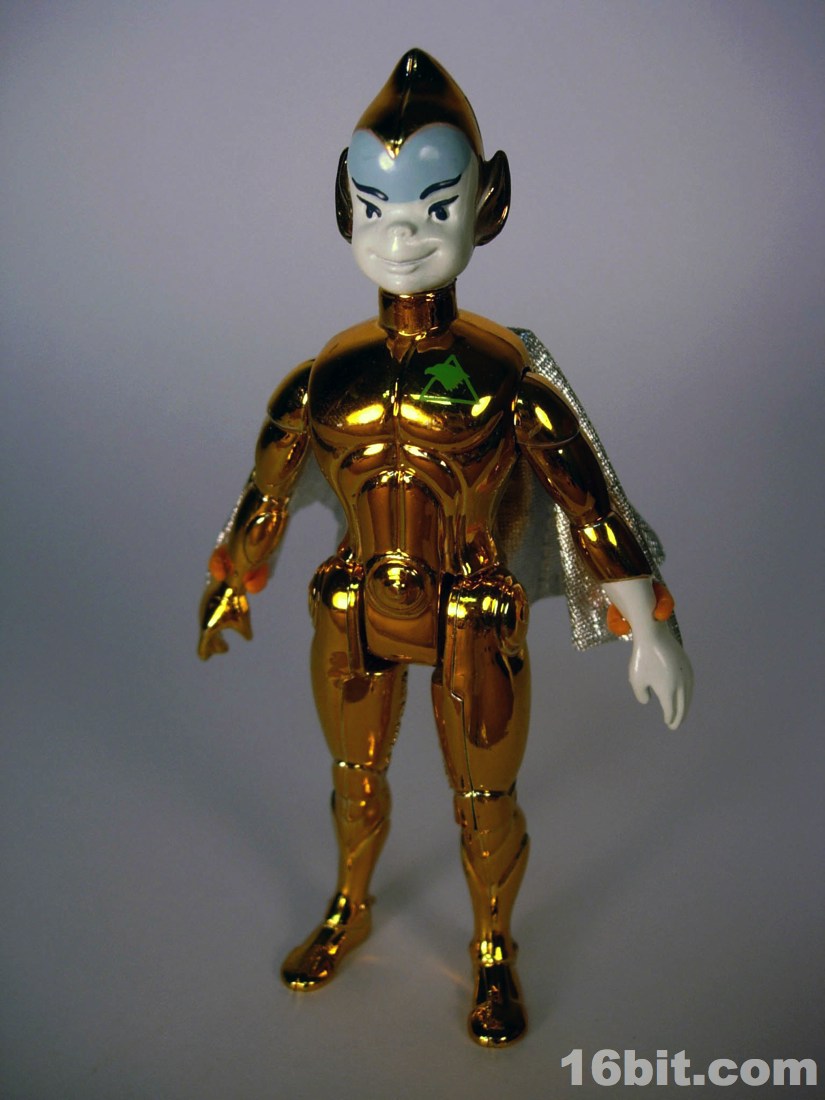 Given the vac-metal covering, the figure is a harder plastic and feels like he might shatter if you chuck him against the wall. (Solution: do not do this.) There's not a lot of deco to be had here, his face is blue and white (mime) and there's a green SilverHawks symbol on his chest. The animation model had a little more detail, with painted black lines and a pink nose, but such was the case of 1980s toys. For some reason, the figure's head reminds me a little of Tracy Morgan and I can't quite say why.