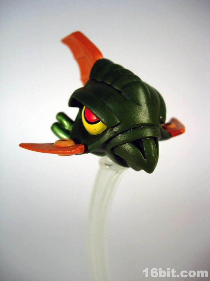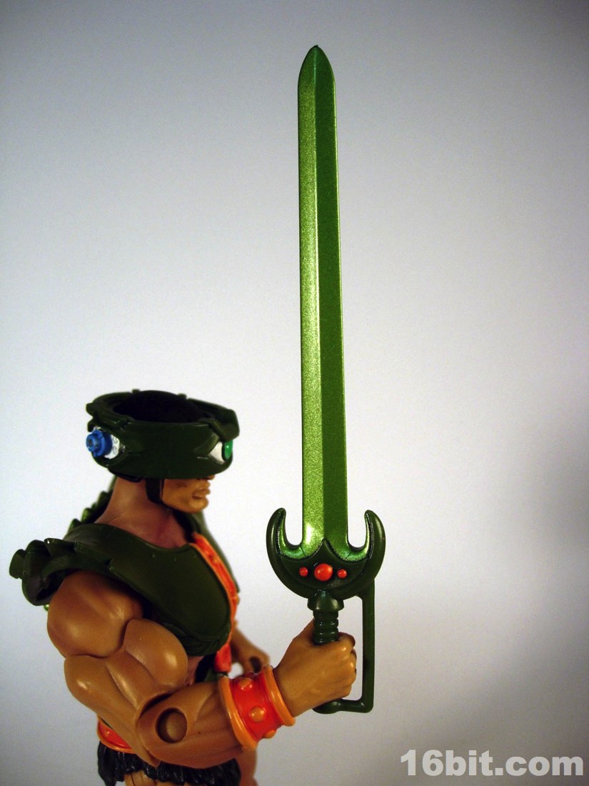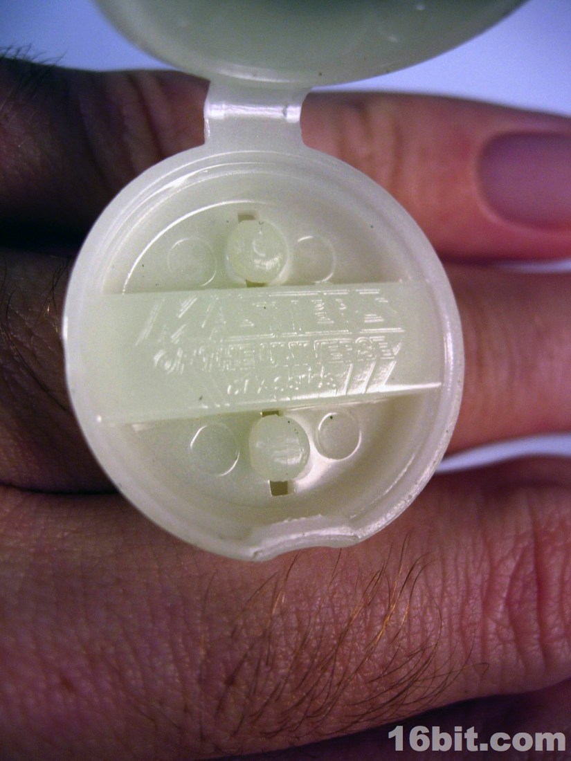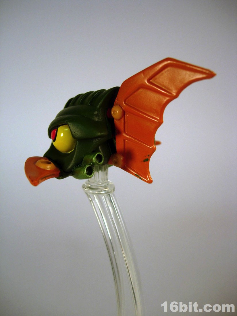 The figure has a nice update of the original sword, complete with the guard. Added metallic green paint has been added to the blade, as have a group of orange dots. The original didn't feature this level of deco, but it did include a glow-in-the-dark Warrior's Ring which seems to have Castle Grayskull on it. The idea on the original release was you could hide messages in there or something, and this new version looks pretty similar to the original. I appreciate its inclusion as a "secret accessory" but I'd by lying if I said I had any real use for it. Much more interesting is the Doomseeker, and update of the 2002 accessory. Fully-painted this time around, it's a colorful robot bird-fish thing with a clear plastic stand. It looks far superior to the 2002 version, and looks like it belongs in the 1982 aesthetic despite being cooked up two decades after the fact. Far more than the ring, this was a brilliant choice to flesh out Tri-Klops' gear.