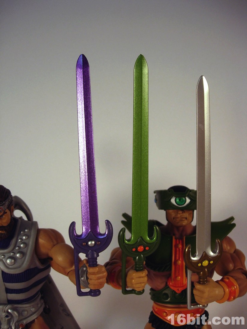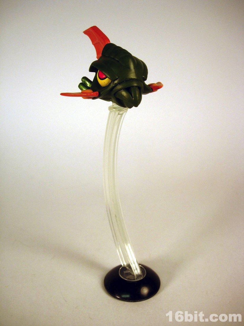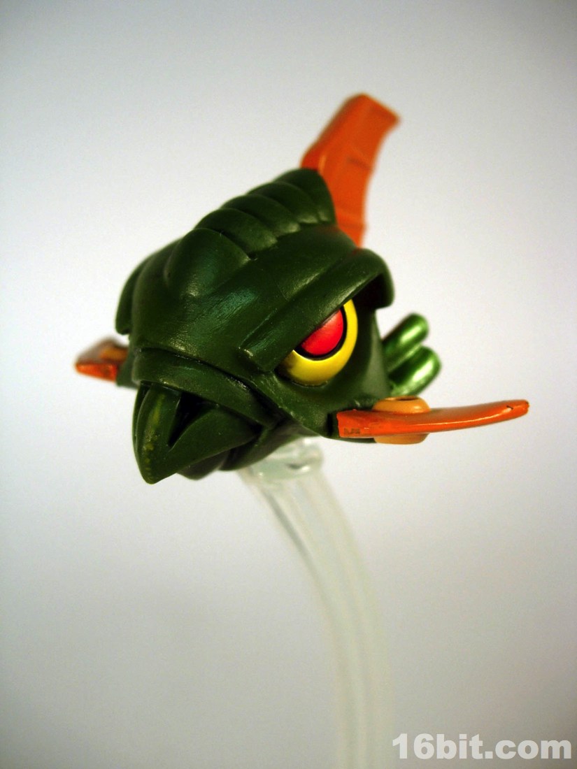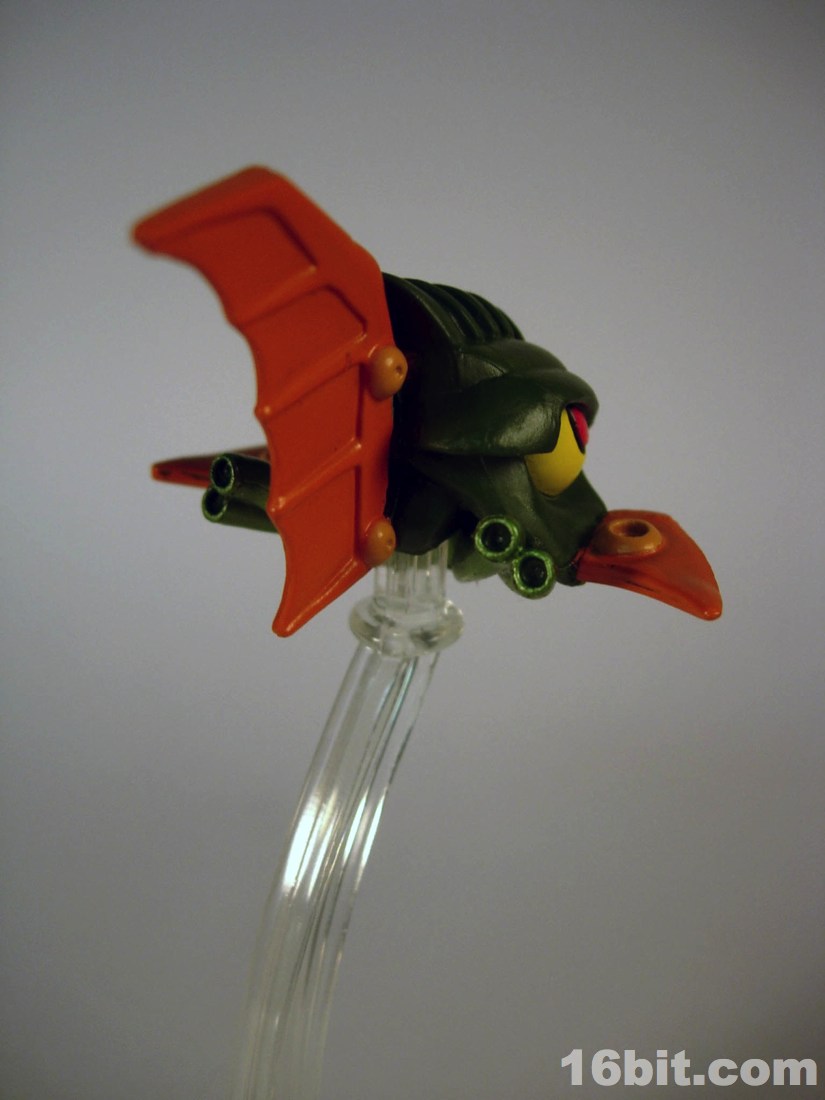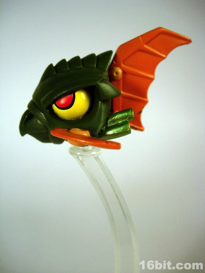 The figure has a nice update of the original sword, complete with the guard. Added metallic green paint has been added to the blade, as have a group of orange dots. The original didn't feature this level of deco, but it did include a glow-in-the-dark Warrior's Ring which seems to have Castle Grayskull on it. The idea on the original release was you could hide messages in there or something, and this new version looks pretty similar to the original. I appreciate its inclusion as a "secret accessory" but I'd by lying if I said I had any real use for it. Much more interesting is the Doomseeker, and update of the 2002 accessory. Fully-painted this time around, it's a colorful robot bird-fish thing with a clear plastic stand. It looks far superior to the 2002 version, and looks like it belongs in the 1982 aesthetic despite being cooked up two decades after the fact. Far more than the ring, this was a brilliant choice to flesh out Tri-Klops' gear.