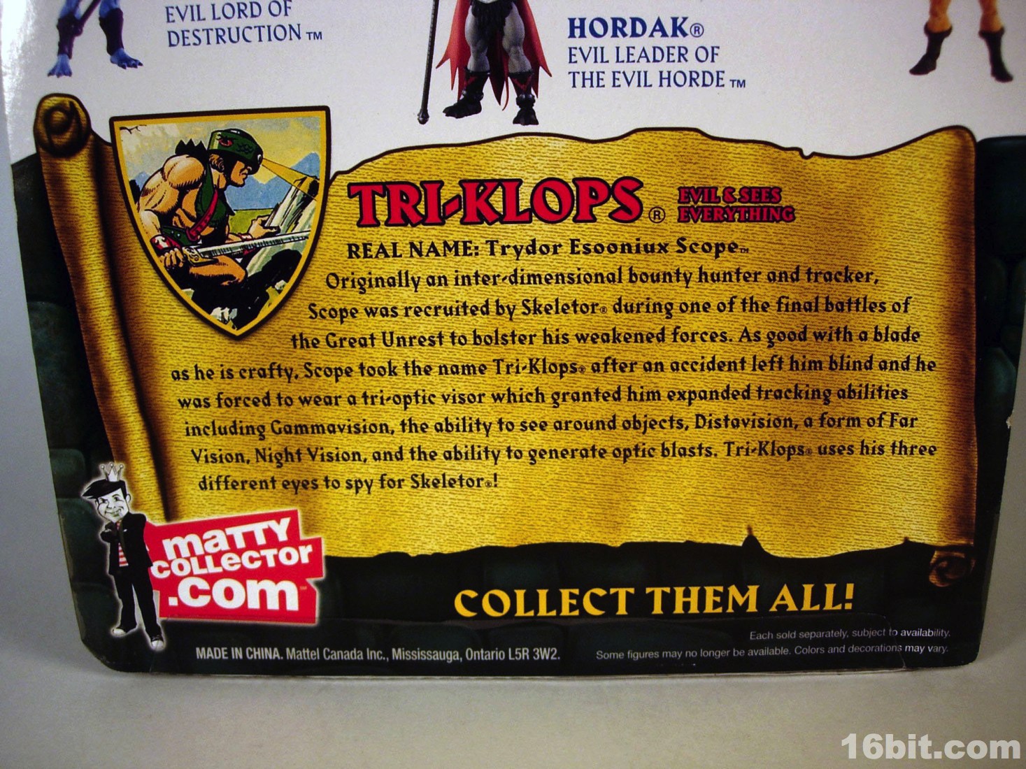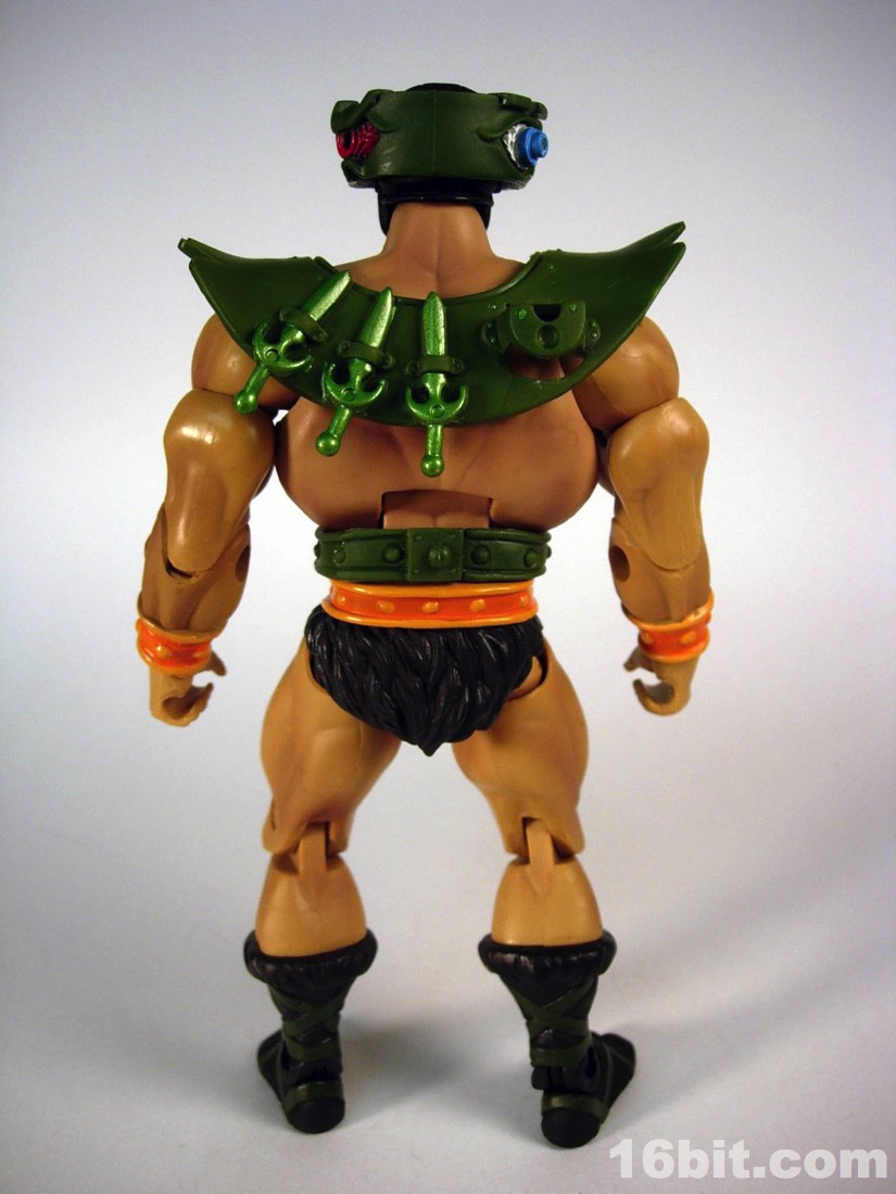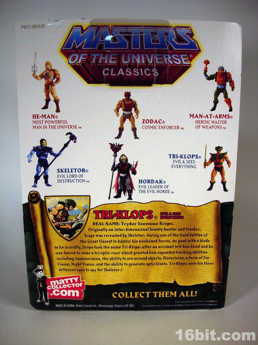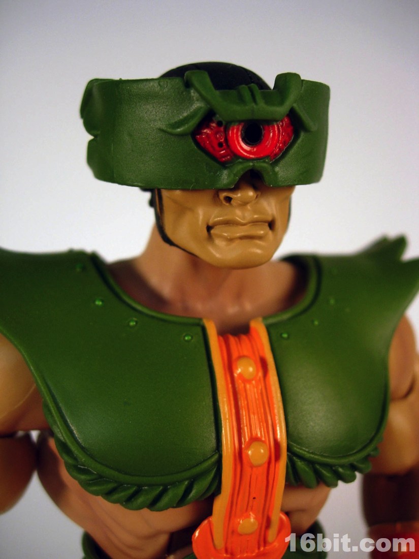 The pictures should show just what a nice paint job ol' three-eyes has, and I can't complain about his gear. The rotating eye mechanism works great, and the hands are a little softer than some other figures in the line, meaning he can hold his gear much more easily. If you make this the first figure in Masters of the Universe Classics you buy, you will be spoiled. I got him late and I gotta say, he's so good he stands up against 2012 figures and in most cases, is a little bit better. If anyone ever tells you this figure isn't good, ignore them. Like, on everything. And I mean on life-or-death stuff too, anyone who says this Tri-Klops sucks can't be trusted. Put this on your shopping list, you won't be sorry.