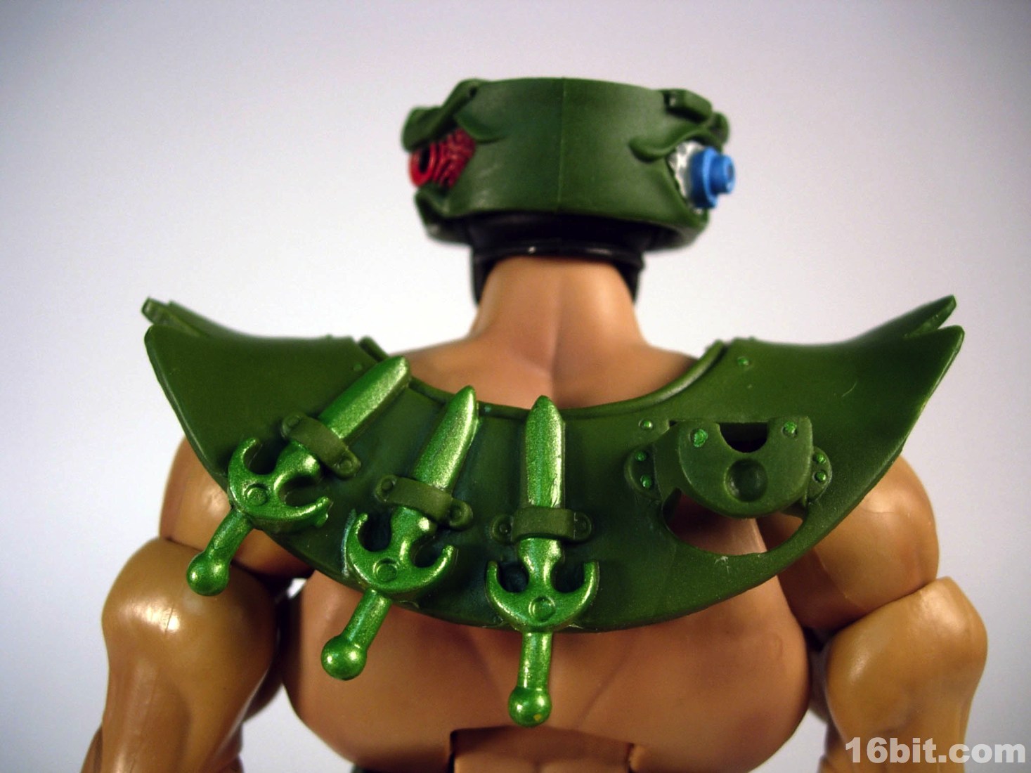 The new Tri-Klops figure is primarily based on the original 1983 design, using modern parts. The biggest and most obvious addition is on his back, which retains the storage space for his sword but adds three sculpted, painted throwing knives. They're non-removable but add a lot of gee-whiz factor to the figure, no doubt driving up its cost a bit but certainly making it feel like a more expensive collectible. The harness has also been redesigned and now lacks the "spine" piece down the back, but that's probably just fine. With one addition and one removal, ultimately, you'll probably never look at this figure's back anyway. The body is mostly reused He-Man parts with a newly tooled right forearm which has matching, uh, bracelets on either hand now. The standard 20ish joints are present plus a bonus (and necessary) one: his head is jointed so his three-eyed visor can rotate around his head. One of the neatest-- and most ghoulish-- easter eggs can be seen under the eyes, there are patches where his eyes used to be which seem to be "wired in" to the scope. Horrifying.