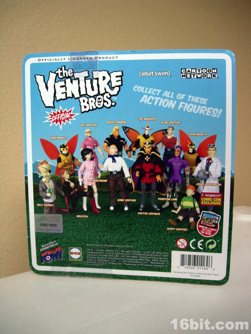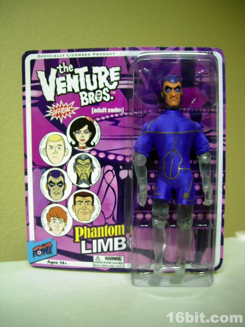 Be care ful with Phantom Limb. The figure is another in the ongoing series of Mego-style retro action figures, but it uses a different body than the rest and, as an adult collectible, should be handled with care. (Lesson learned: this figure was not meant to sit. Trust me here.) This is a figure best left in the packaging, or displayed standing up. The clear plastic doesn't like to be stressed.
