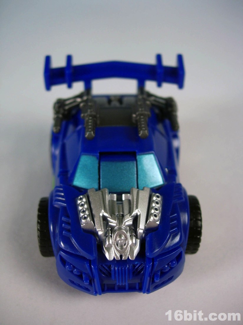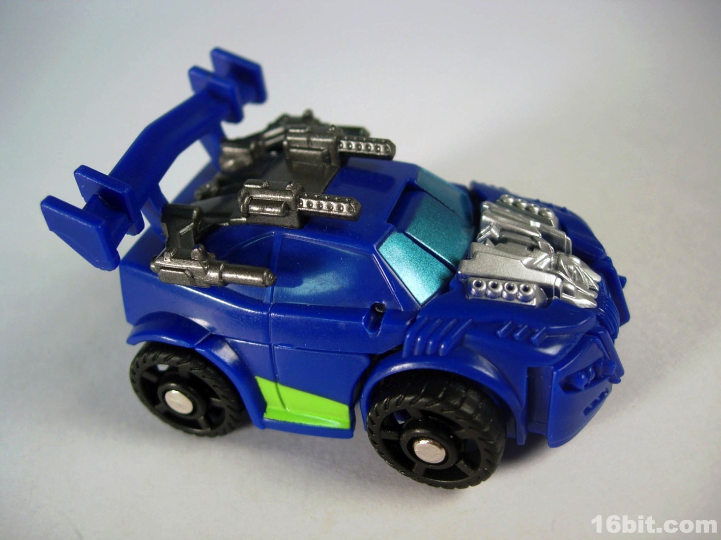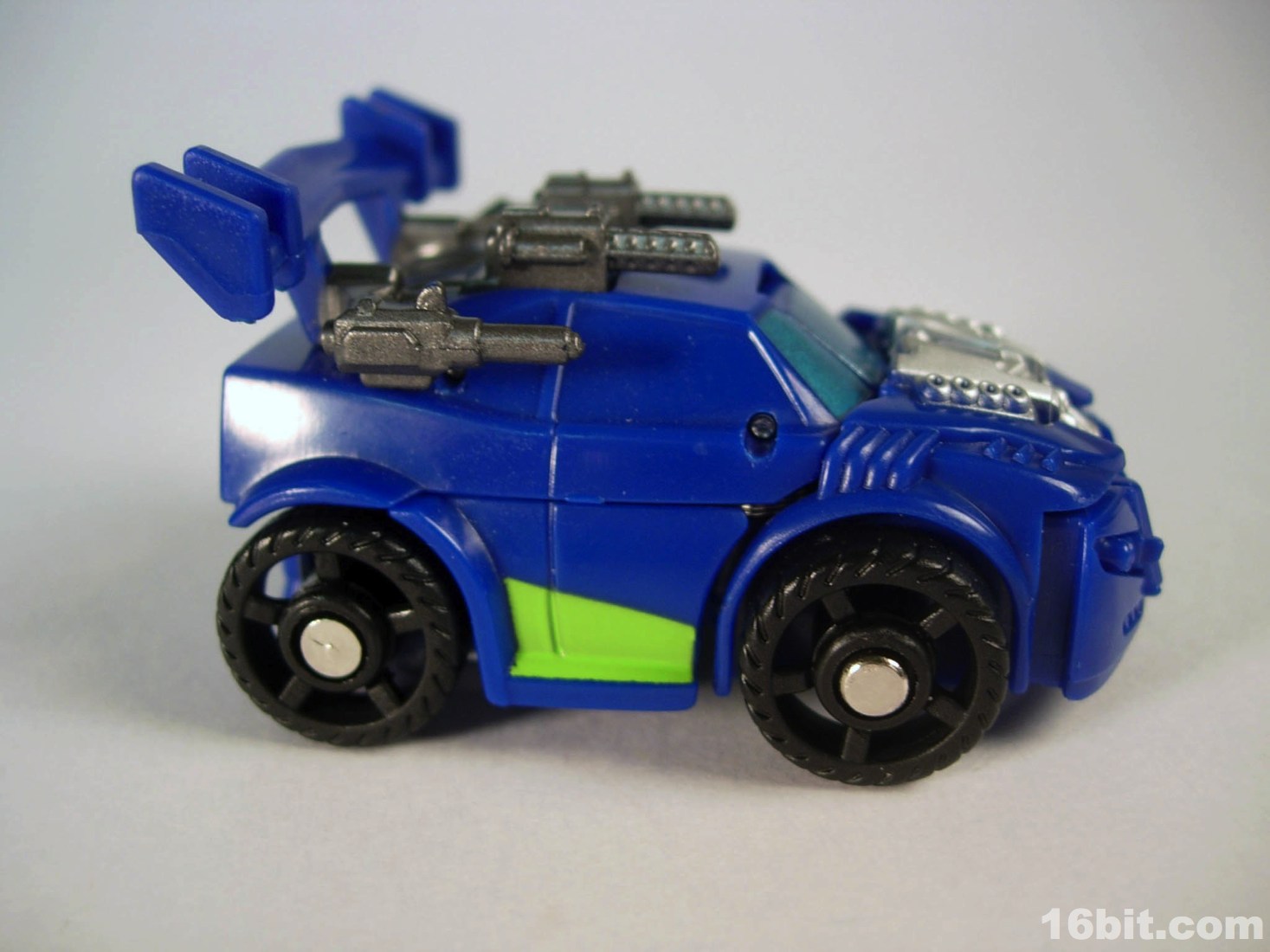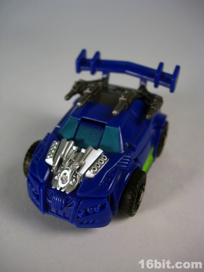 The car may remind you of Mirage from wave 2, as it is also blue and based on the Bumblebee mold. The figure is enhanced with a new bumper and hood assembly, and the elements making up the spoiler and the back half of the car are new. These parts effectively make it into Dark of the Moon Topspin, minus the "cage" elements on the side windows. On this toy, the windows are sadly unpainted but aside from that it looks pretty slick with gunmetal grey cannons, a shiny silver engine, a bright metallic windshield, and bright green detailing in the doors. If Hasbro sprang to paint the side windows, this would probably be tied with (or better than) Lockdown in the battle for my heart. The wheels roll freely, and it's a fun neat little car that should remind you of the Choro-Q pull-back cars your dad used to get you from Japan. (Your dad didn't do that? Oh.)