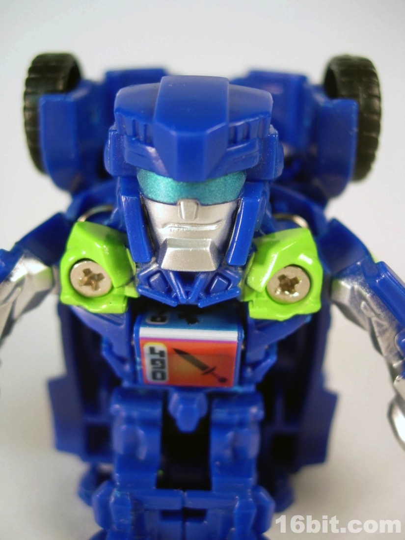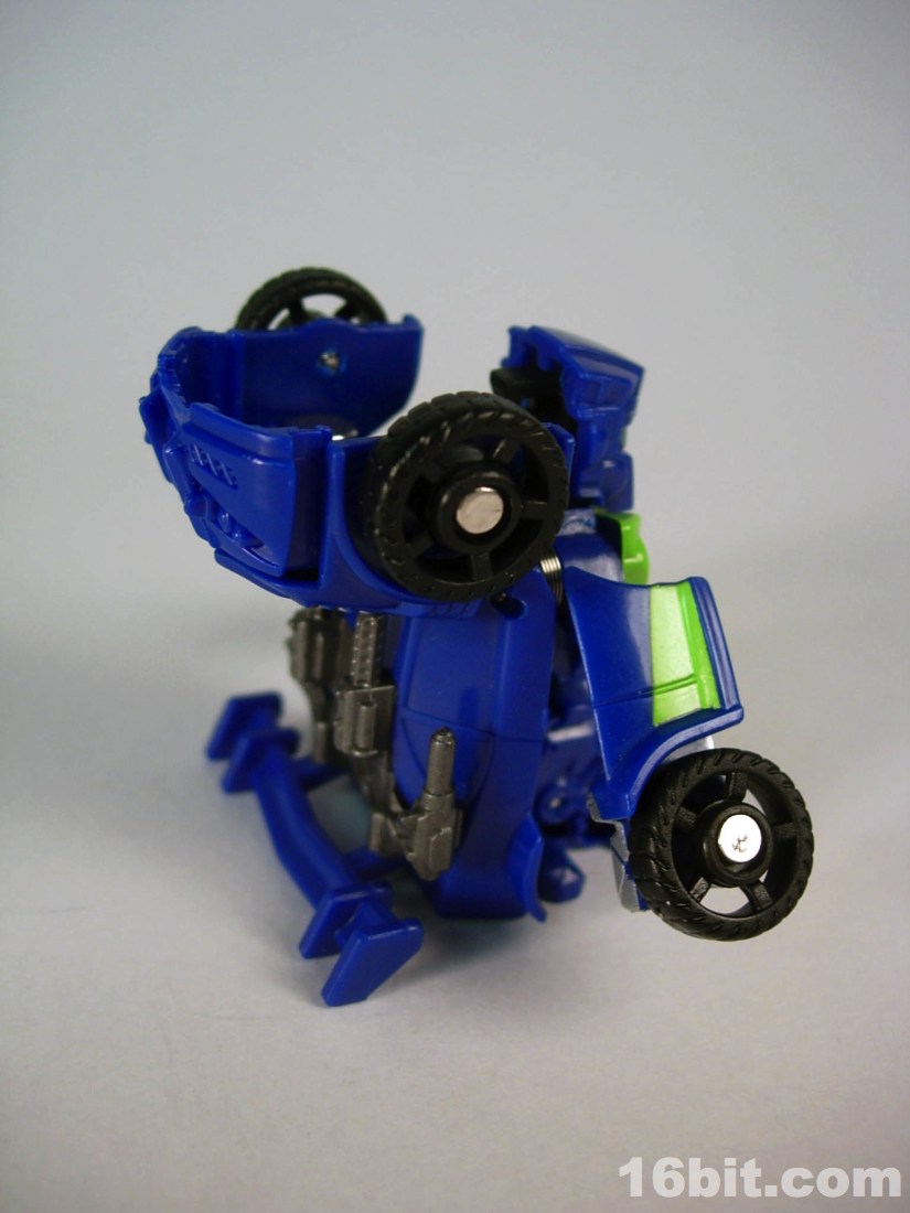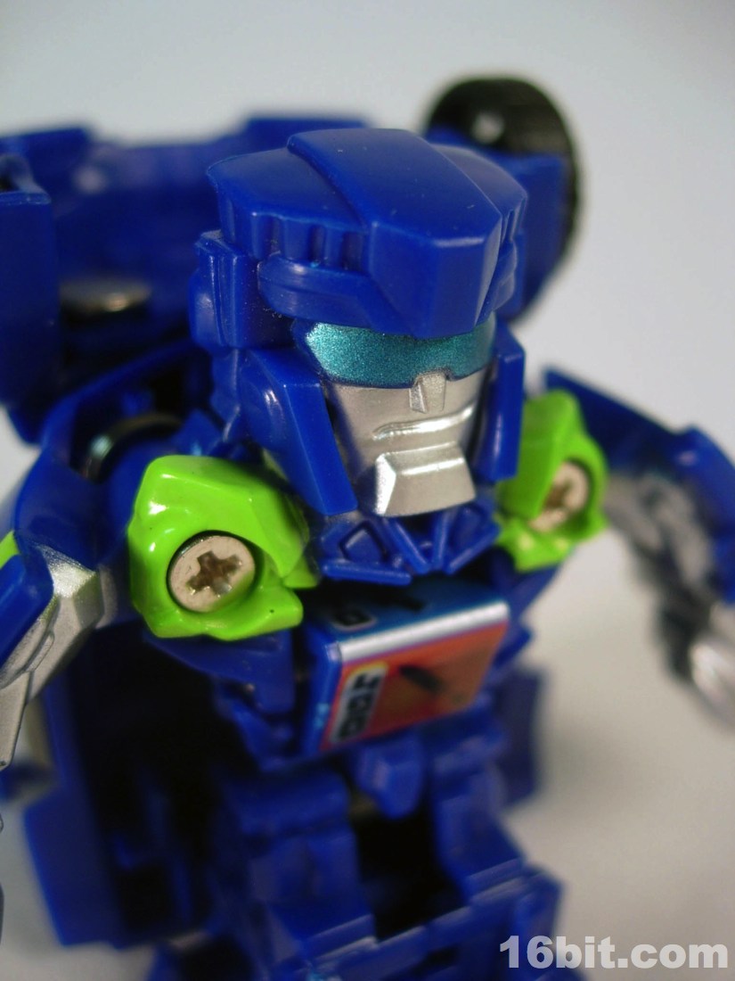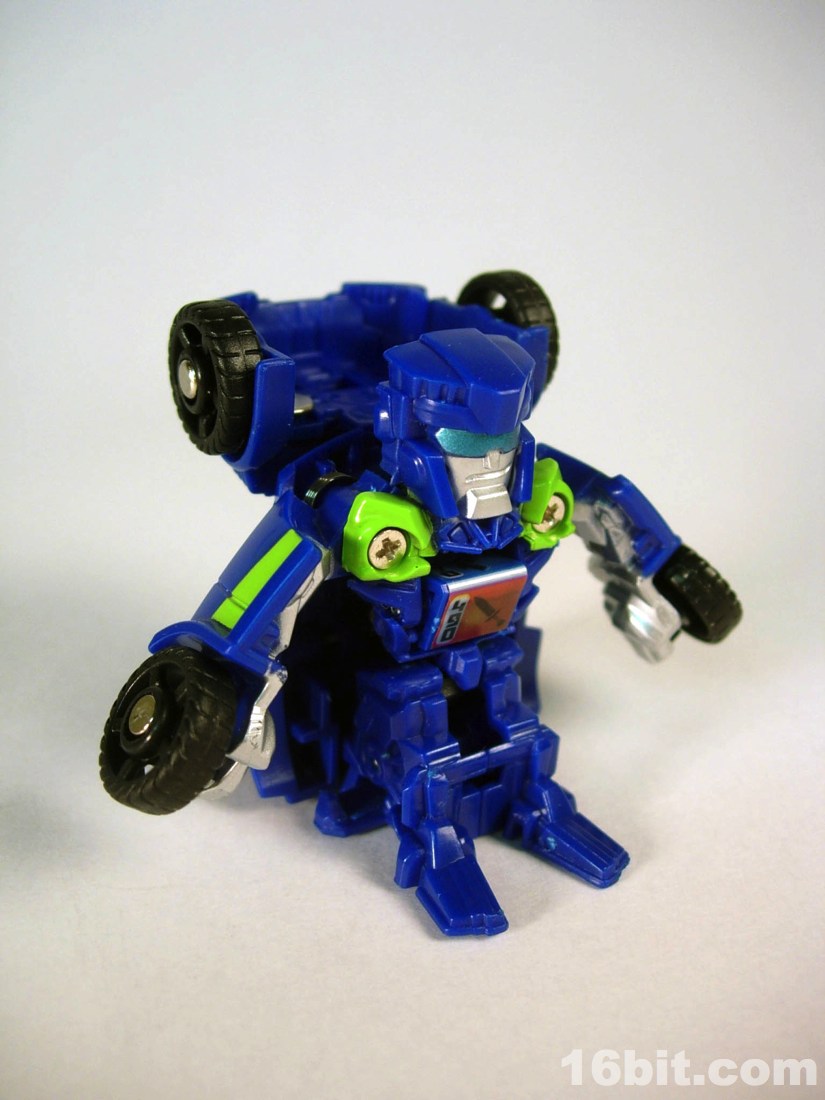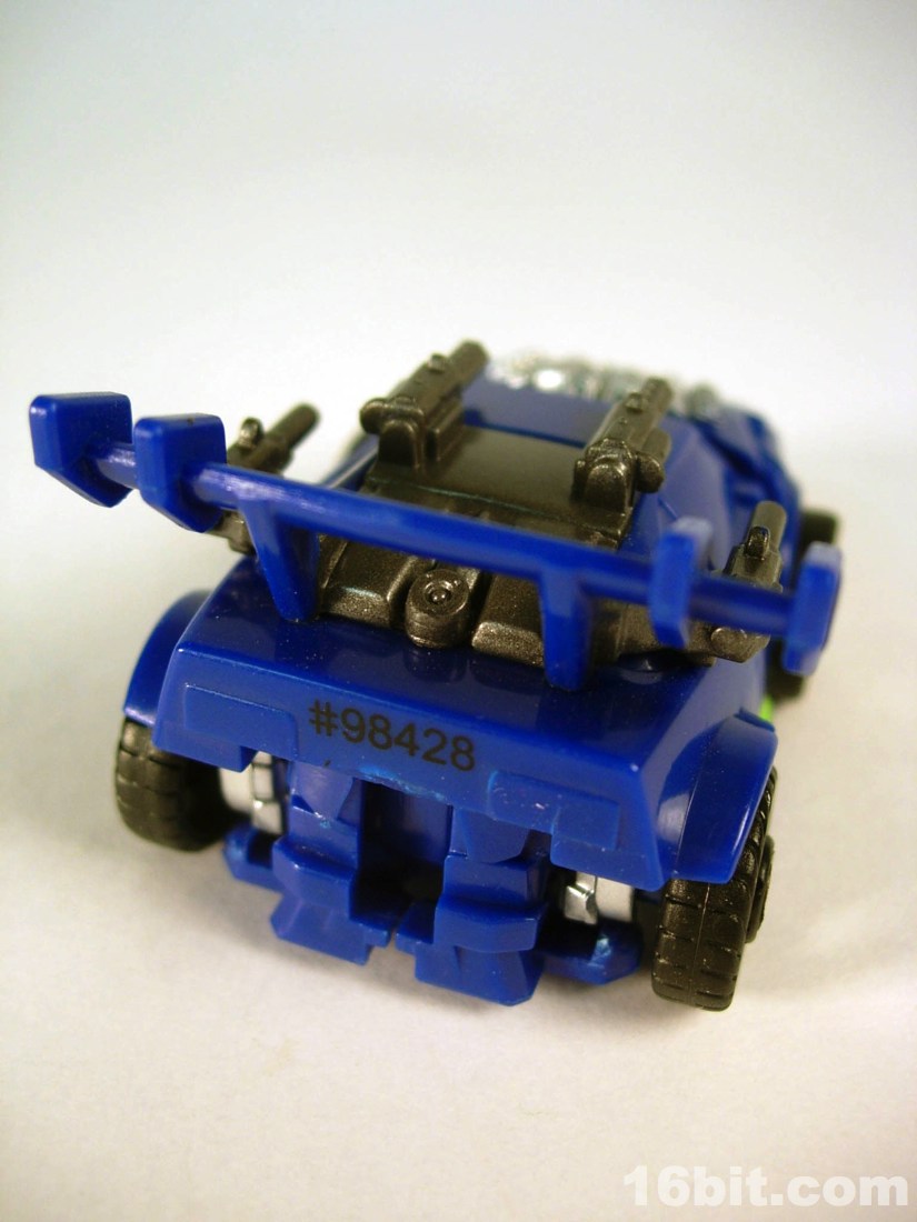 The car may remind you of Mirage from wave 2, as it is also blue and based on the Bumblebee mold. The figure is enhanced with a new bumper and hood assembly, and the elements making up the spoiler and the back half of the car are new. These parts effectively make it into Dark of the Moon Topspin, minus the "cage" elements on the side windows. On this toy, the windows are sadly unpainted but aside from that it looks pretty slick with gunmetal grey cannons, a shiny silver engine, a bright metallic windshield, and bright green detailing in the doors. If Hasbro sprang to paint the side windows, this would probably be tied with (or better than) Lockdown in the battle for my heart. The wheels roll freely, and it's a fun neat little car that should remind you of the Choro-Q pull-back cars your dad used to get you from Japan. (Your dad didn't do that? Oh.)