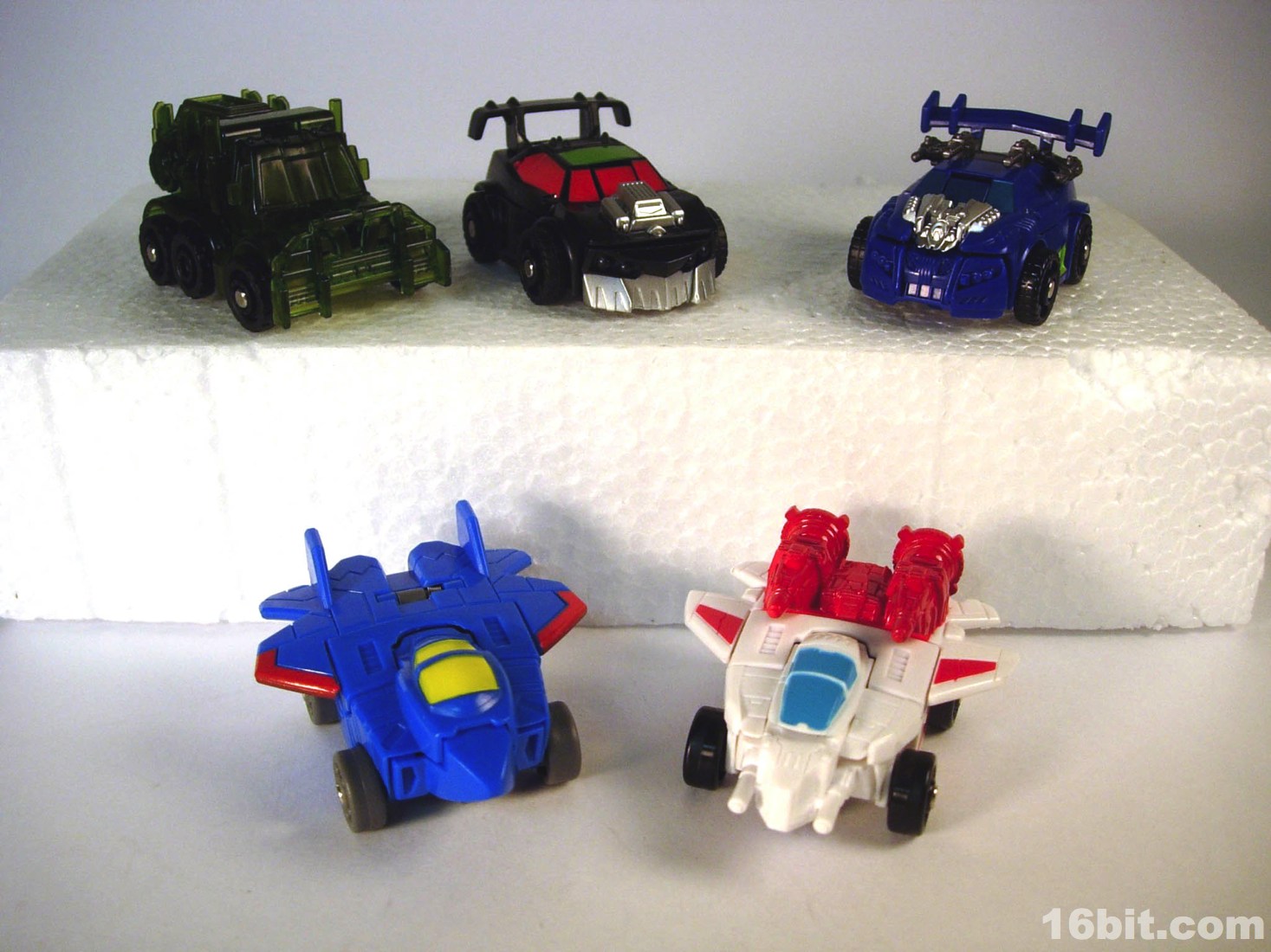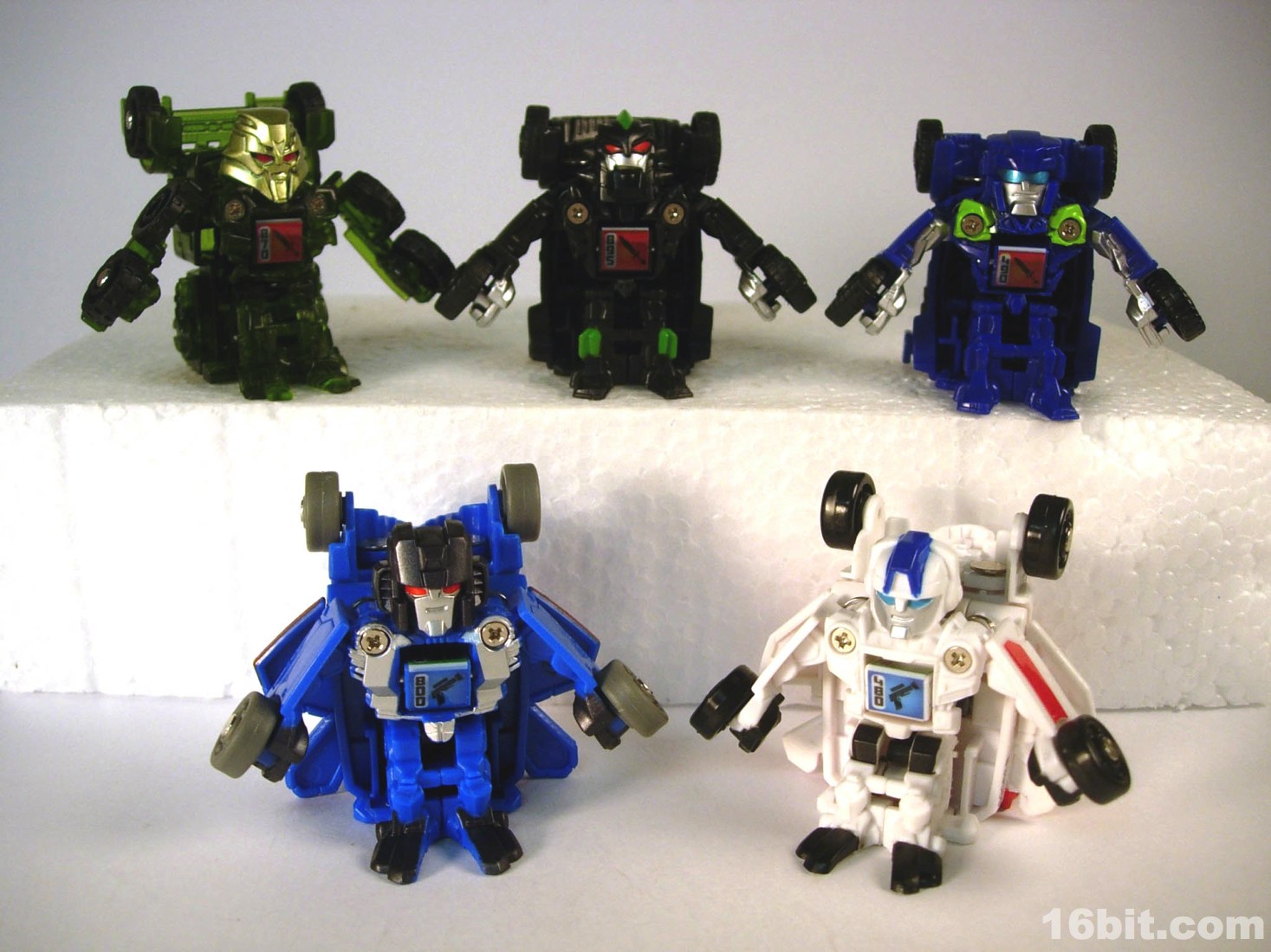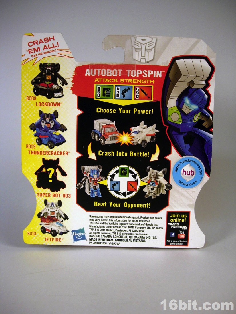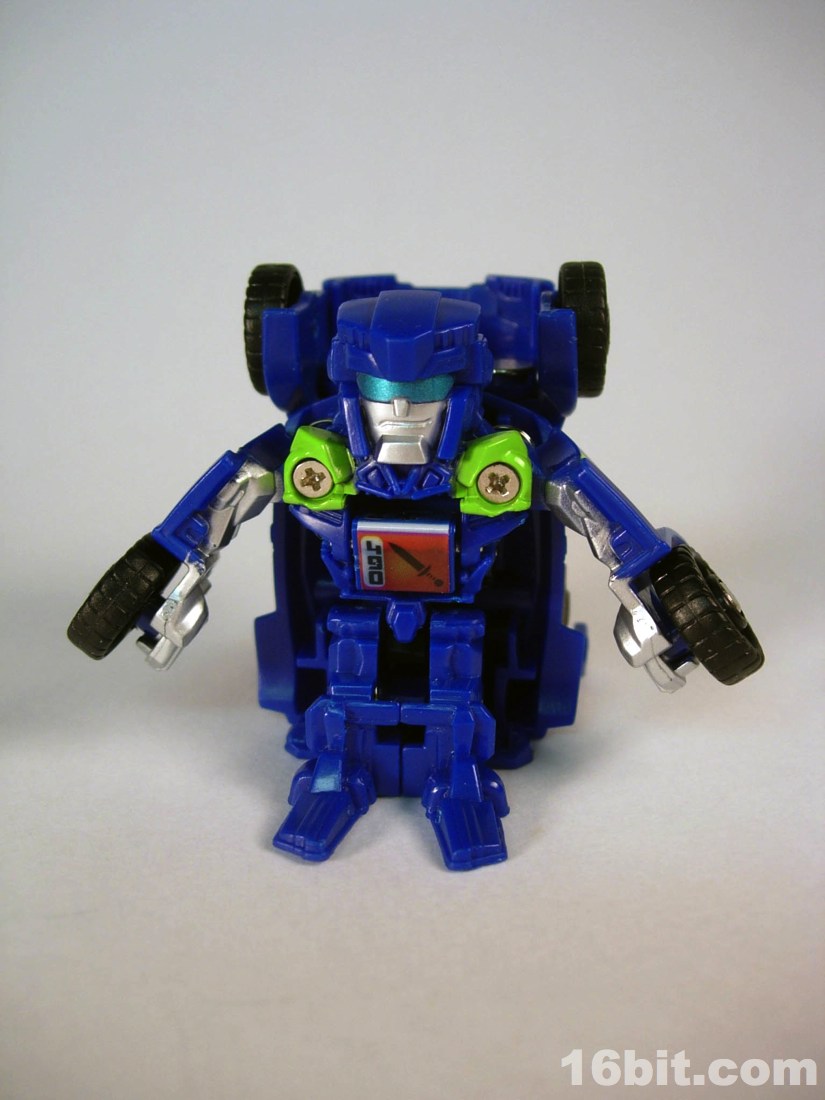 The car may remind you of Mirage from wave 2, as it is also blue and based on the Bumblebee mold. The figure is enhanced with a new bumper and hood assembly, and the elements making up the spoiler and the back half of the car are new. These parts effectively make it into Dark of the Moon Topspin, minus the "cage" elements on the side windows. On this toy, the windows are sadly unpainted but aside from that it looks pretty slick with gunmetal grey cannons, a shiny silver engine, a bright metallic windshield, and bright green detailing in the doors. If Hasbro sprang to paint the side windows, this would probably be tied with (or better than) Lockdown in the battle for my heart. The wheels roll freely, and it's a fun neat little car that should remind you of the Choro-Q pull-back cars your dad used to get you from Japan. (Your dad didn't do that? Oh.)