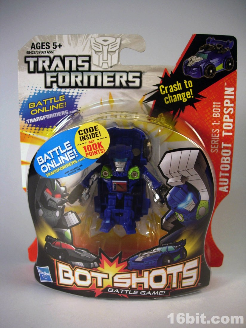 When you push the bumper, he jumps into robot mode. The head and chest are a new piece, the rest is pretty similar to Bumblebee with swing-out arms, no articulation, and a fun sculpt. I was complaining during the movie lines that the heads felt lacking in personality, but Hasbro seems to have been saving it for Bot Shots. The figure's lively smirk recalls the head from the IDW G1-themed comic books, which were inspired by the original Jumpstarters toy in the 1980s. So what you've got here is a healthy mishmash of Topspins of numerous generations, complete with "goggles" on his helmet. While Lockdown may have my favorite vehicle mode, I think Topspin's got the best head sculpt so far. If you see him for four bucks, buy him and Lockdown. If you don't agree with me that these are some of the most fun miniature toys that you can get today, well, you just have terrible taste and no place for joy in your heart. Buy Topspin. You're welcome.