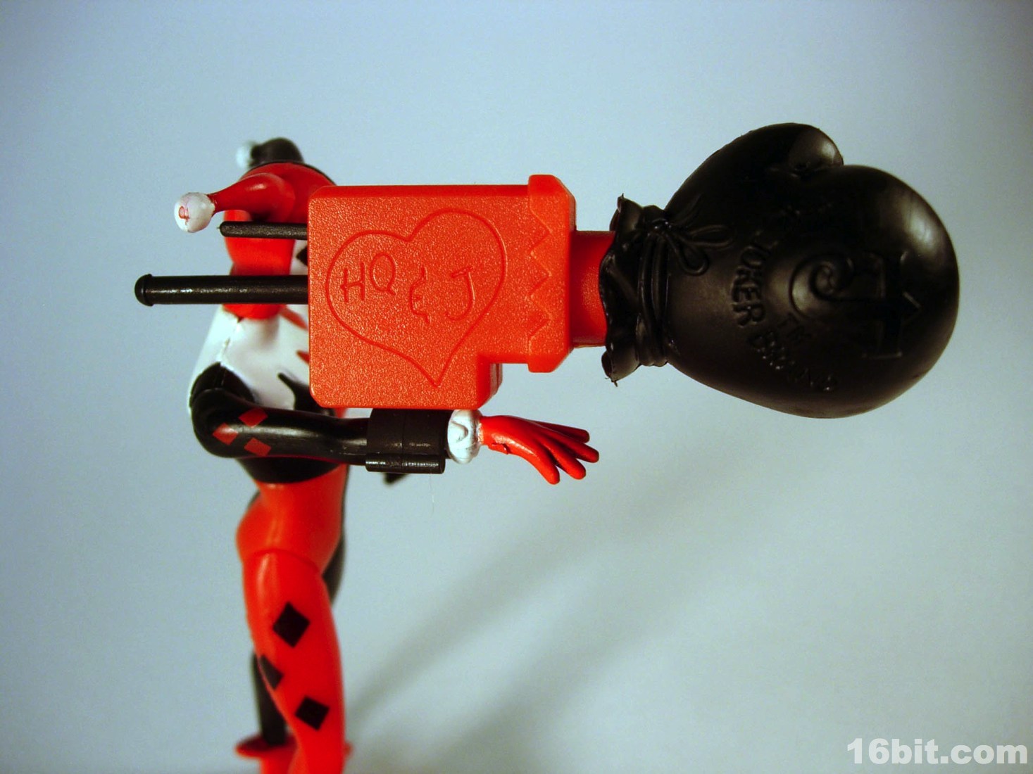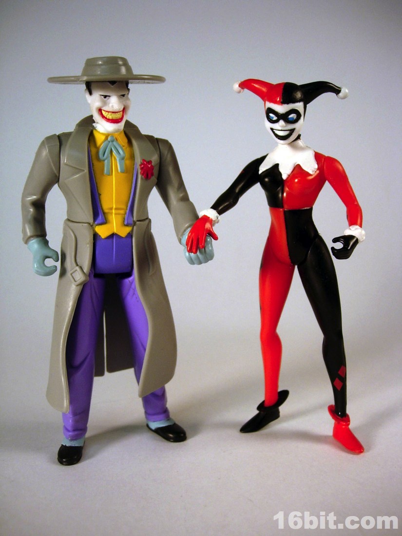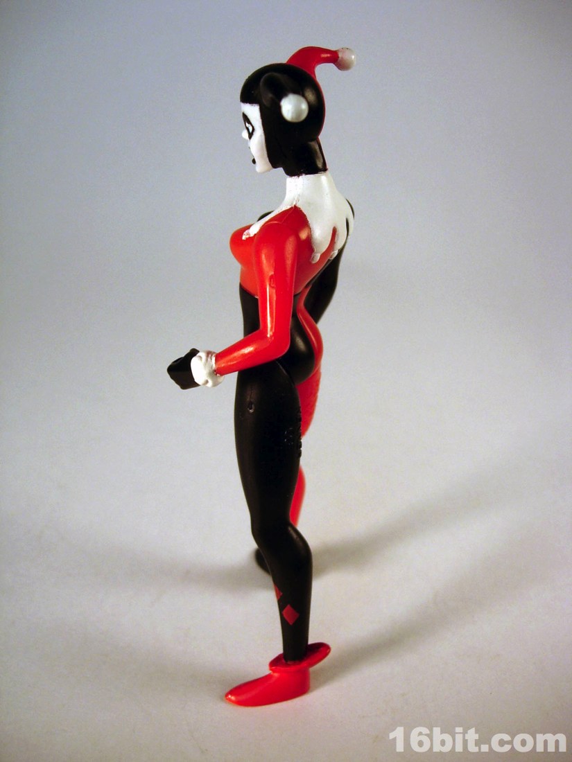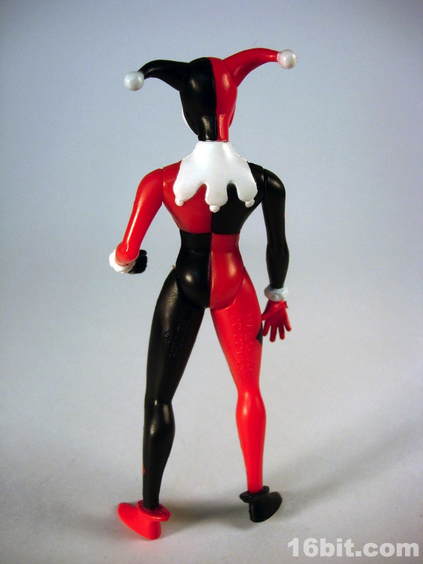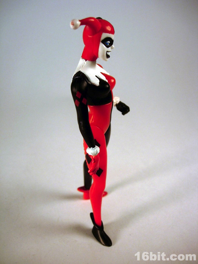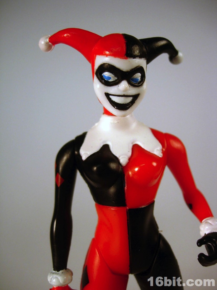 The simplified style from the TV show made for great Kenner-style action figures. Limited articulation meant the silhouette of the character could be kept intact quite nicely, while keeping the poses more or less restrained with a few exceptions like the Phantasm and Poison Ivy. Harley's right hand is extended in an unusual-for-a-villain pose, but I quickly noticed it seemed she was designed almost perfectly to compliment the Joker from the same wave. The two could hold hands-- I assume this was intentional, which is nothing short of adorable. Her arms could move freely, as could her neck, and her legs had an acceptable range of movement. While she had no holes in her feet for pegs, which was unusual for this line, she generally had no problems standing unassisted. However, her accessories made her too top-heavy and as the packaging said, some poses would require hand support.