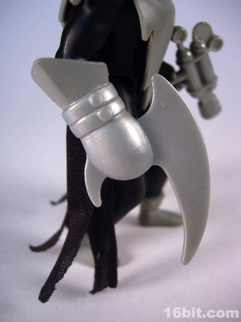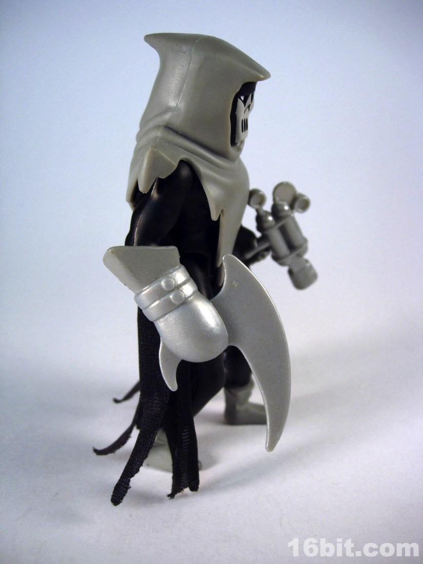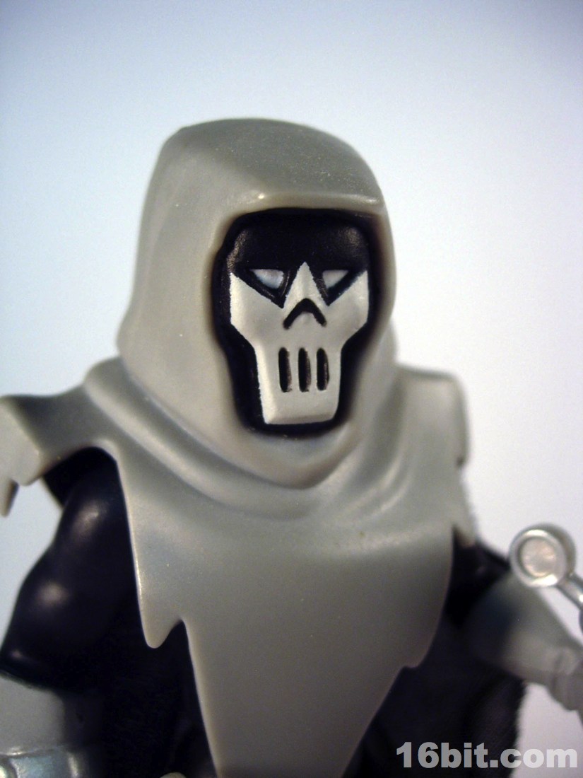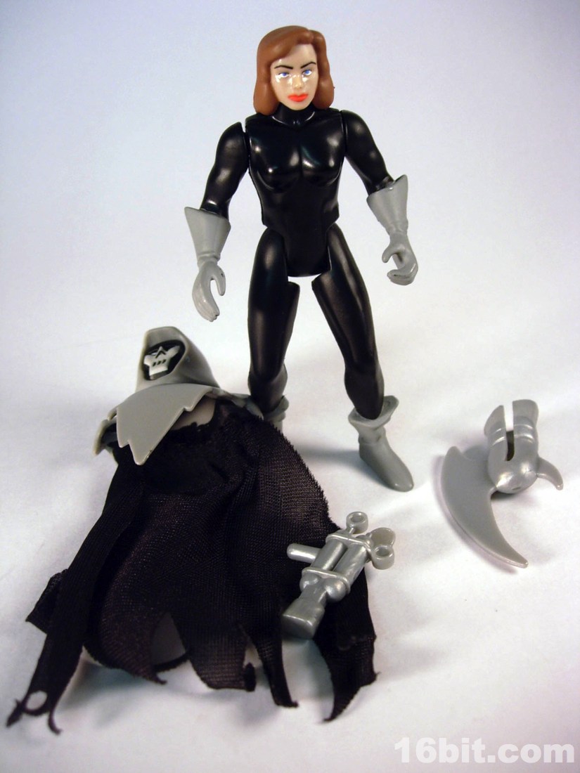 The figure interacts with her accessories flawlessly, and her blade weapon fits, appropriately, like a glove. He has no problems holding her glove and the mask is pretty much a perfect fit, plus it has a cloth element which adds to the figure's bulk while masking her true identity/gender. The overall look of the costumed villain is great, but the human head underneath needs some work. The hair is pretty striking, but both the Phantasm and Poison Ivy could have stood to get some improvement in the sculpt and/or deco department.