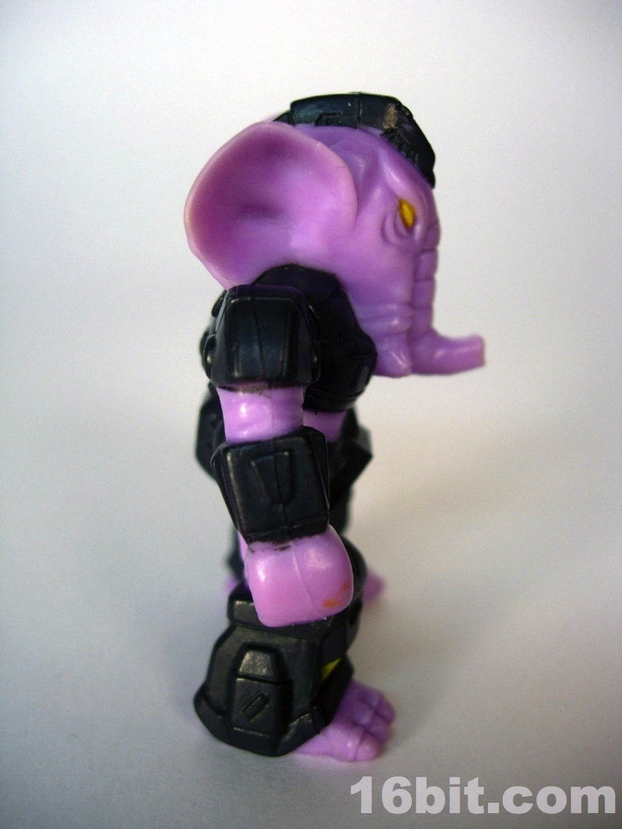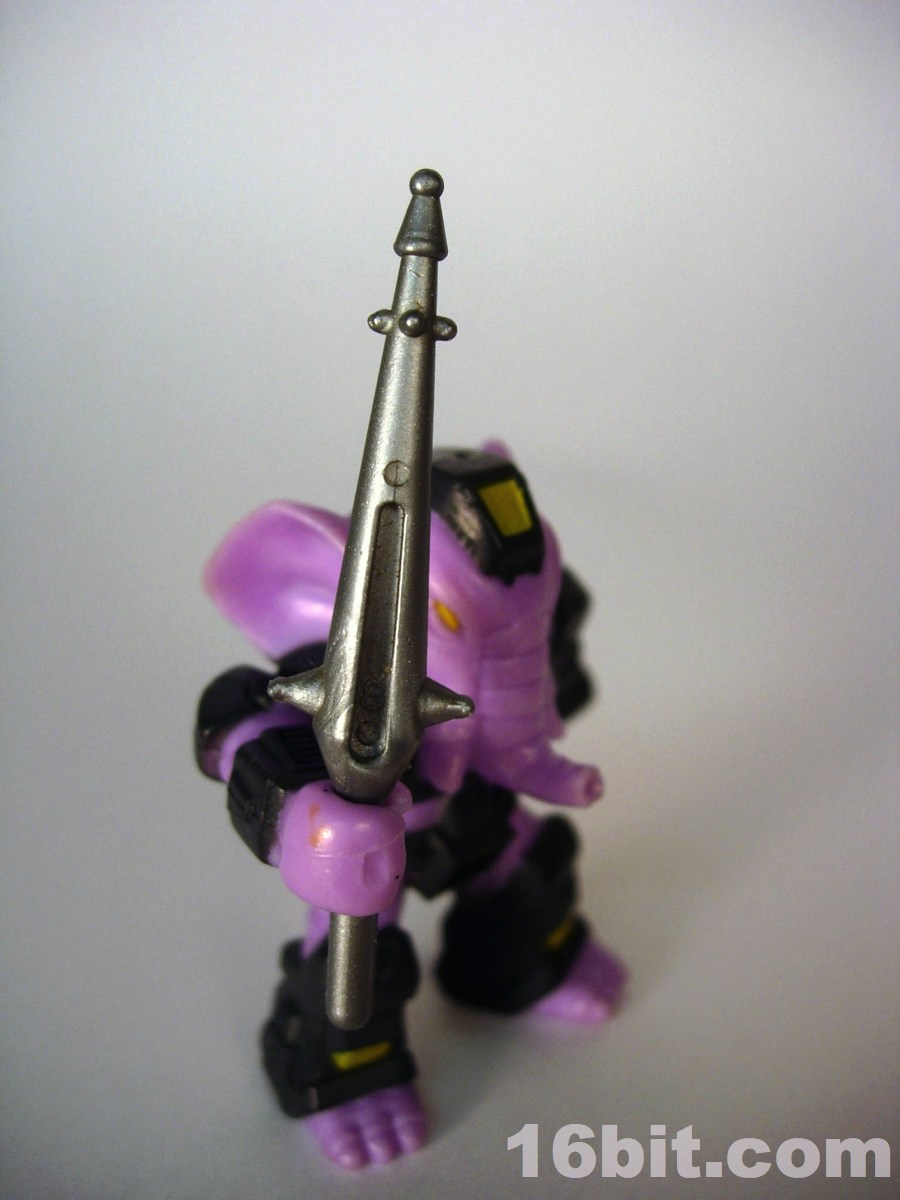 One of the things I really loved about Battle Beasts were the odd colors they selected. Rather than paint him grey with white tusks, we got a purple one. Why purple? I'd love to know! Takara's 1980s toys came in some delightfully goofy colors, and they got progressively weirder through the 1980s. (Also worth noting: Transformers Pretenders.) So he's molded in purple, with painted dark grey armor and some yellow highlights-- note his eyes, helmet, and shins. There's not a lot to it in this color department, but it seems just fine to me. I'm sure if you handed it to a typical kid today, they'd be thrown by the odd purple color (like I was) to probably not even question the unpainted tusks until they, too, were faced with the idea of judging it on an aesthetic level 25 years later.