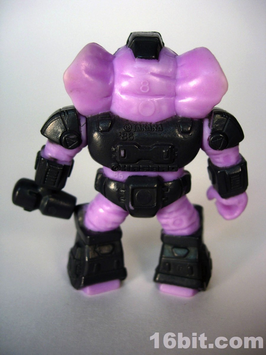 As with the rest of the line, Sledgehammer Elephant has two joints. What's particularly interesting, though, are all the little details in his sculpt. Covered in rectangles, triangles, and tiny vents for no readily apparent reason, it seems that Takara could've cranked out reissues of these with new paint jobs, and they would be quite impressive. To give the figure a greater sense of age, they even sculpted some lines under his eyes. The ears have a little bit of detail, and the feet don't look particularly elephant-like. The legs are a little knobby, as are the arms, so what you have here is a pretty slick little figure.