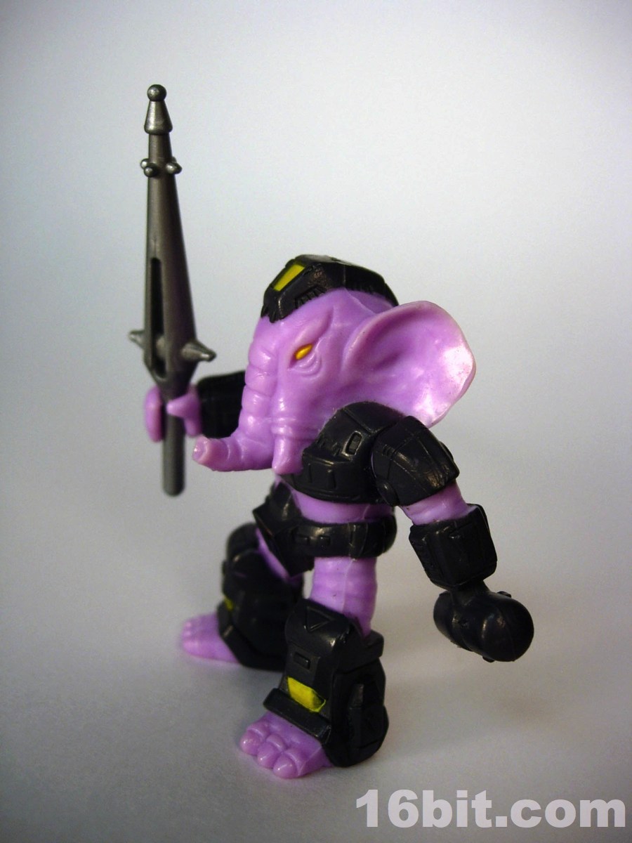 Oh, Battle Beasts are fun. The Sledgehammer Elephant was one I know I asked for as a kid because, well, elephant. It's awesome. As a kid, an elephant is about as close as you can get to a dinosaur in terms of large, land-dwelling creatures that can mess stuff up. As with many of the other figures I review here, this is the one I had as a kid. It's also one of very few figures who lost his weapon (which I'm convinced is here in a box somewhere) so I bought this off another collector in early 2012. The figure, as they all do, have some sort of symbol hidden in a black symbol on their armor. What makes this one particularly funny? A) it's on his crotch, and B) it's wood. If that isn't delightful to you, I weep for your soul.