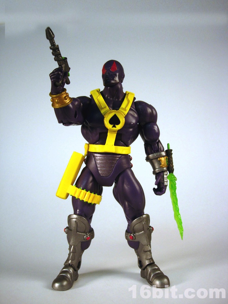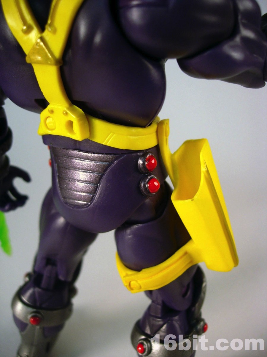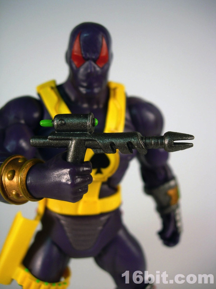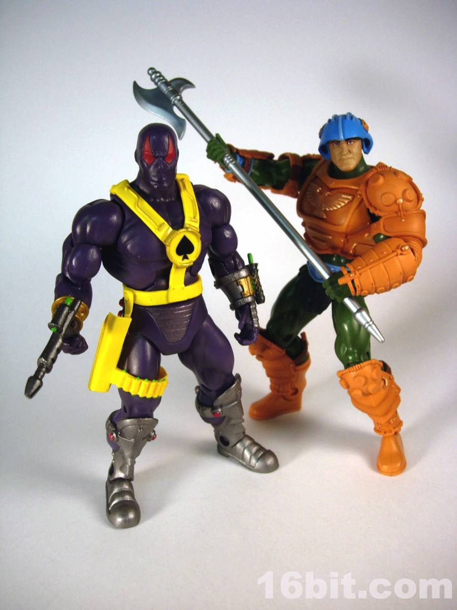 While it doesn't come from the original line, it does come from the fertile imagination of the line's current brand manager and it does make a decent degree of sense. This character is the master of time travel (which makes more sense than being a master of cameras, really) and does come from both the present and future of the timeline. The design sensibility is a mishmash of late 1980s and early 1990s stuff, with a Predator-like gauntlet (complete with weird "alien" characters) being a big source of the character's power. A mini Cosmic Key can snap right on to it, and be activated with some sort of energy burst. I dig it. The purple suit is the time-travel device, supposedly, and the yellow harness adds some color to the otherwise dark figure without hindering movement-- a big plus, as even Skeletor's arms are restricted by his armor. The figure's joints are tight, and it basically works well in the sense that it can stand and all of its features and articulation work properly. From an engineering perspective, The Mighty Spector may be one of the best overall assembled and painted releases, plus he's purple and there aren't a heck of a lot of purple good guys.