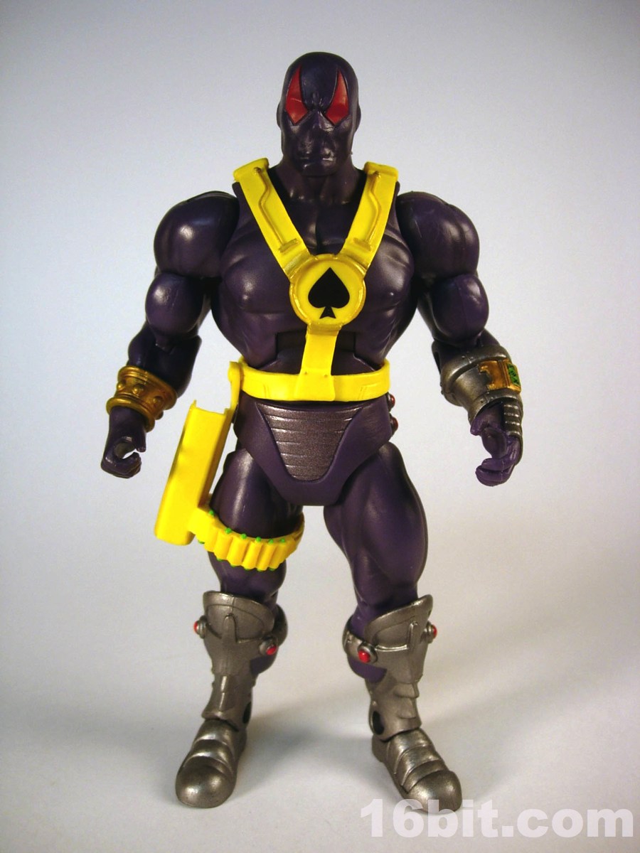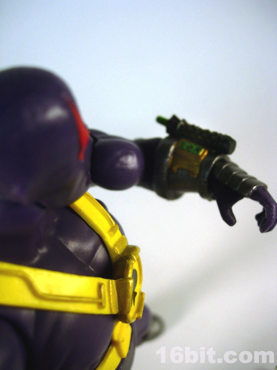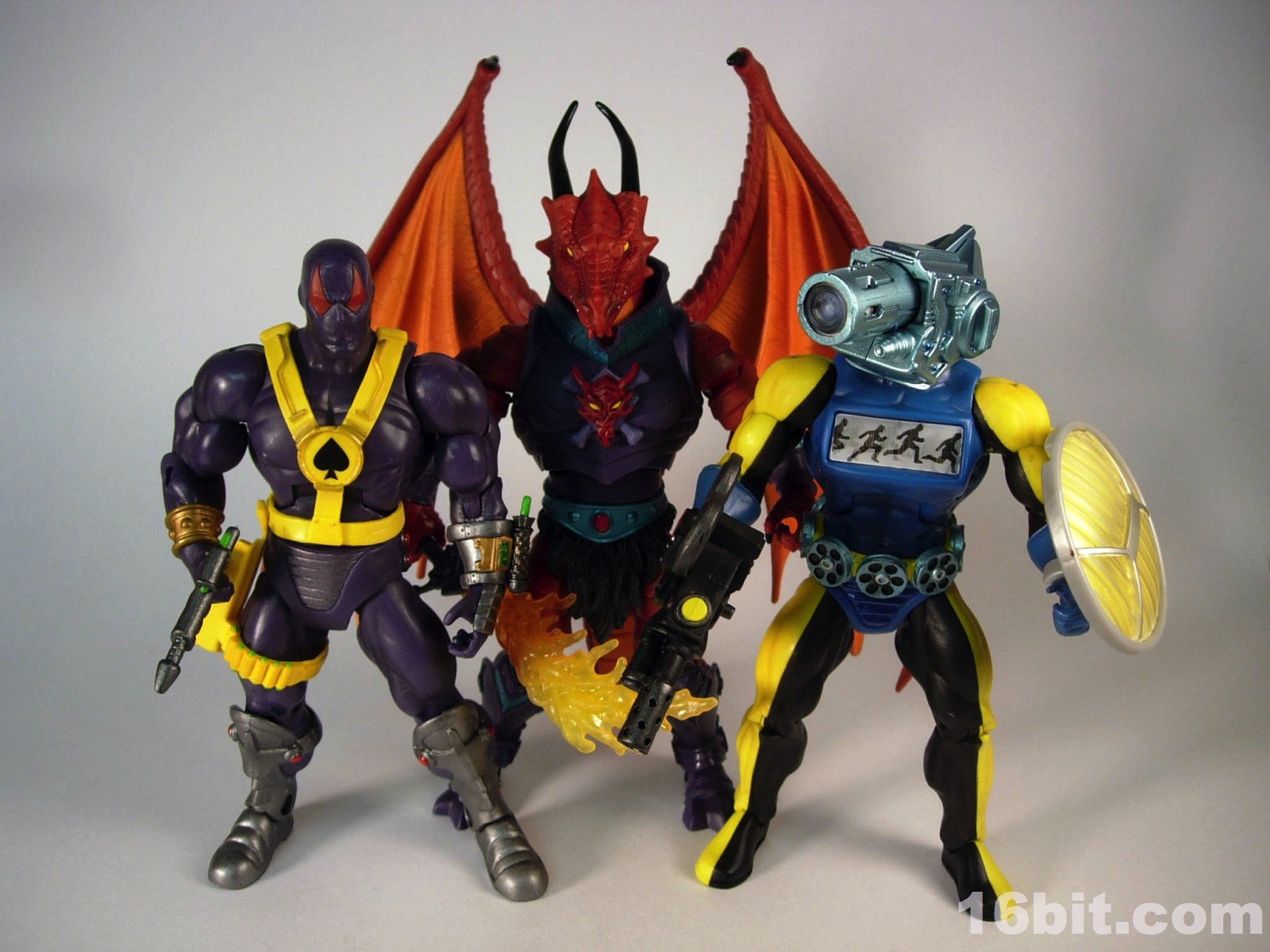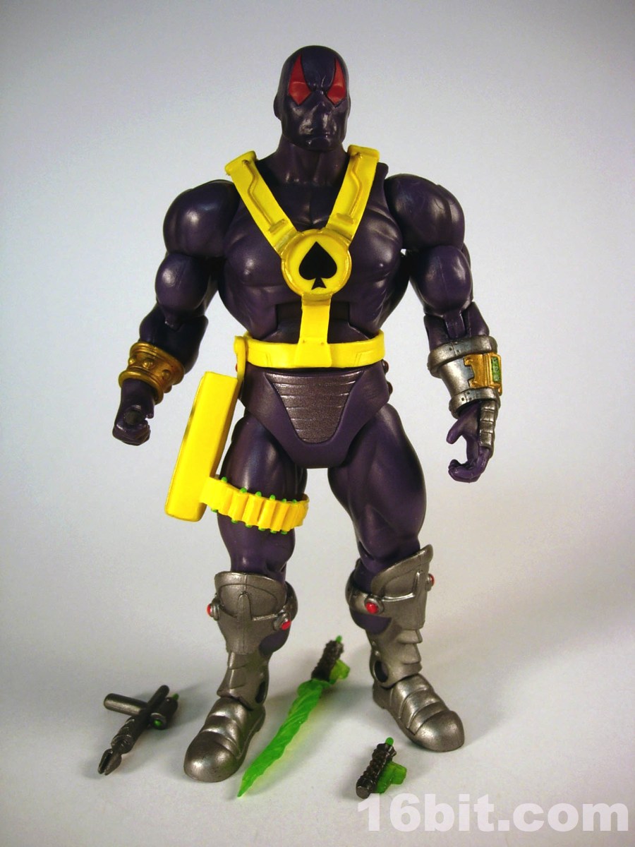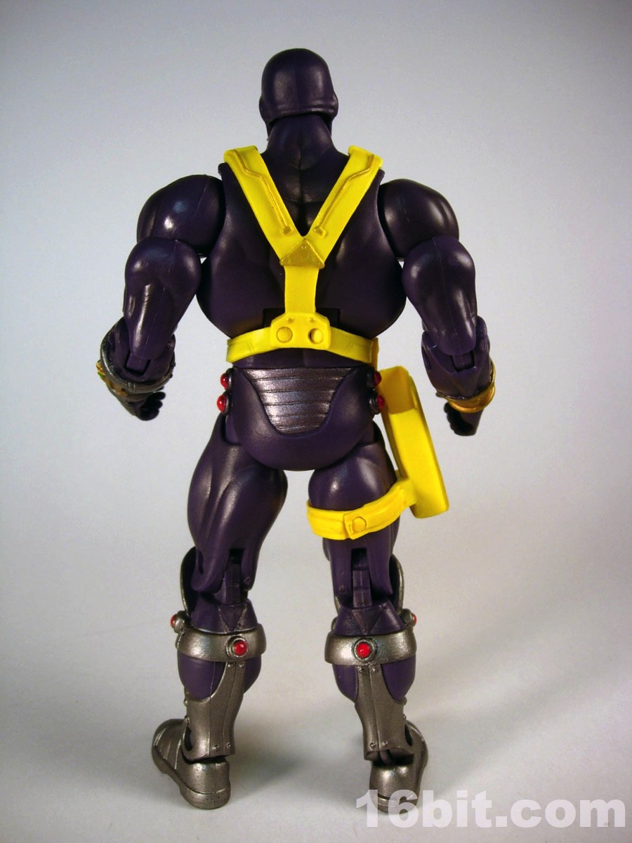 While it doesn't come from the original line, it does come from the fertile imagination of the line's current brand manager and it does make a decent degree of sense. This character is the master of time travel (which makes more sense than being a master of cameras, really) and does come from both the present and future of the timeline. The design sensibility is a mishmash of late 1980s and early 1990s stuff, with a Predator-like gauntlet (complete with weird "alien" characters) being a big source of the character's power. A mini Cosmic Key can snap right on to it, and be activated with some sort of energy burst. I dig it. The purple suit is the time-travel device, supposedly, and the yellow harness adds some color to the otherwise dark figure without hindering movement-- a big plus, as even Skeletor's arms are restricted by his armor. The figure's joints are tight, and it basically works well in the sense that it can stand and all of its features and articulation work properly. From an engineering perspective, The Mighty Spector may be one of the best overall assembled and painted releases, plus he's purple and there aren't a heck of a lot of purple good guys.