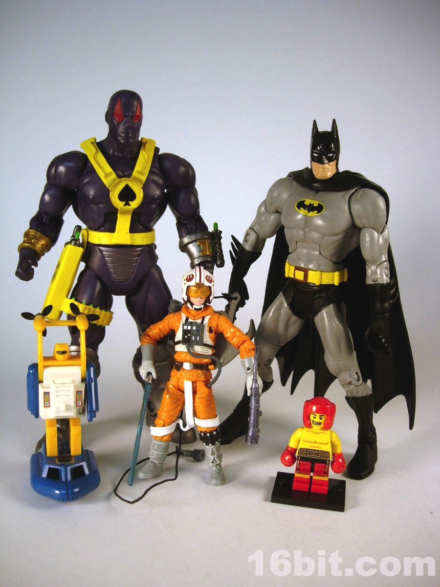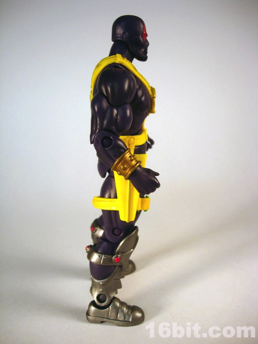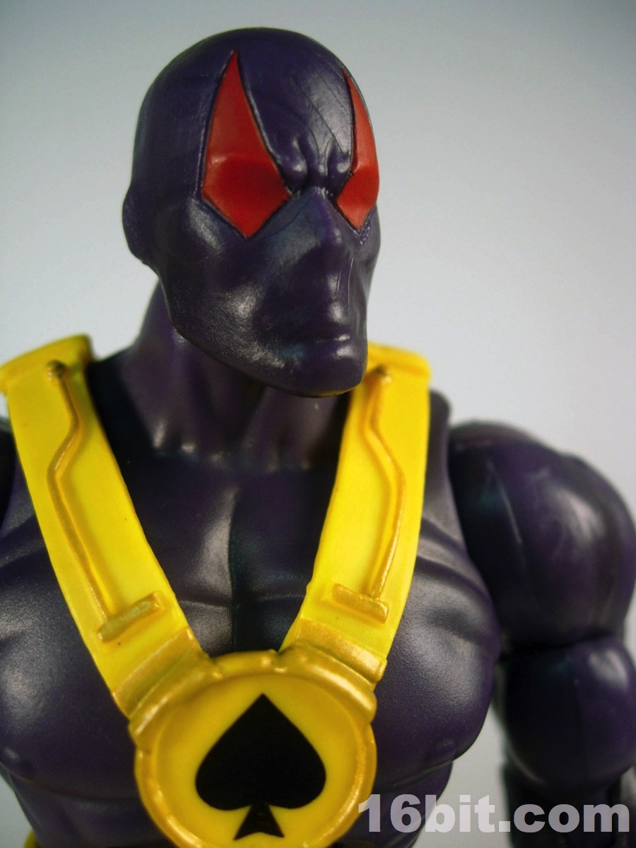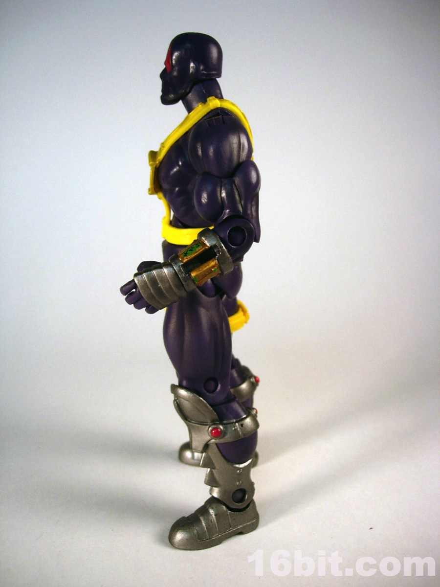 While it doesn't come from the original line, it does come from the fertile imagination of the line's current brand manager and it does make a decent degree of sense. This character is the master of time travel (which makes more sense than being a master of cameras, really) and does come from both the present and future of the timeline. The design sensibility is a mishmash of late 1980s and early 1990s stuff, with a Predator-like gauntlet (complete with weird "alien" characters) being a big source of the character's power. A mini Cosmic Key can snap right on to it, and be activated with some sort of energy burst. I dig it. The purple suit is the time-travel device, supposedly, and the yellow harness adds some color to the otherwise dark figure without hindering movement-- a big plus, as even Skeletor's arms are restricted by his armor. The figure's joints are tight, and it basically works well in the sense that it can stand and all of its features and articulation work properly. From an engineering perspective, The Mighty Spector may be one of the best overall assembled and painted releases, plus he's purple and there aren't a heck of a lot of purple good guys.