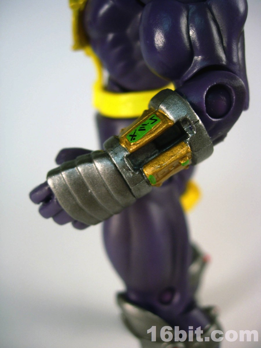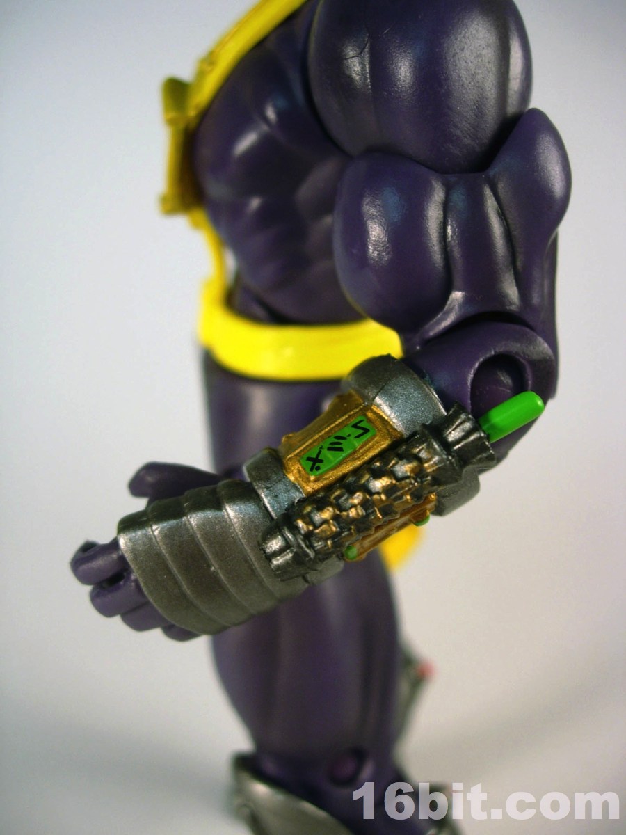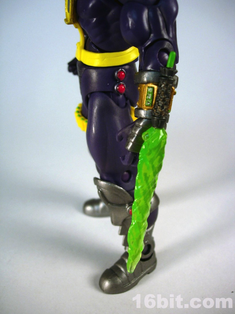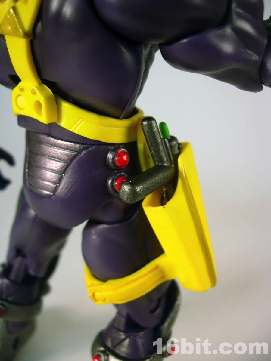 One thing I particularly dug about this figure (and wished could be fleshed out more) was that Cosmic Key on his wrist. The idea of being able to plug multiple weapons into a wrist-mounted device seemed like a lot of fun and reminded me a smidgen of the Green Lantern toys (because it's green). I'm particularly pleased at the designs, because if you want Spector can hold his gun while having the "switched off" Cosmic Key stored in his holster. It's a nice touch. The gun itself is pretty good, they don't waste a lot of detail on the grip and the weapon has an energy stick inserted in it for maximum.... something. The figure has a bunch of this "ammo" sculpted to a yellow band on his thigh, and you'll notice one of them is "missing."
