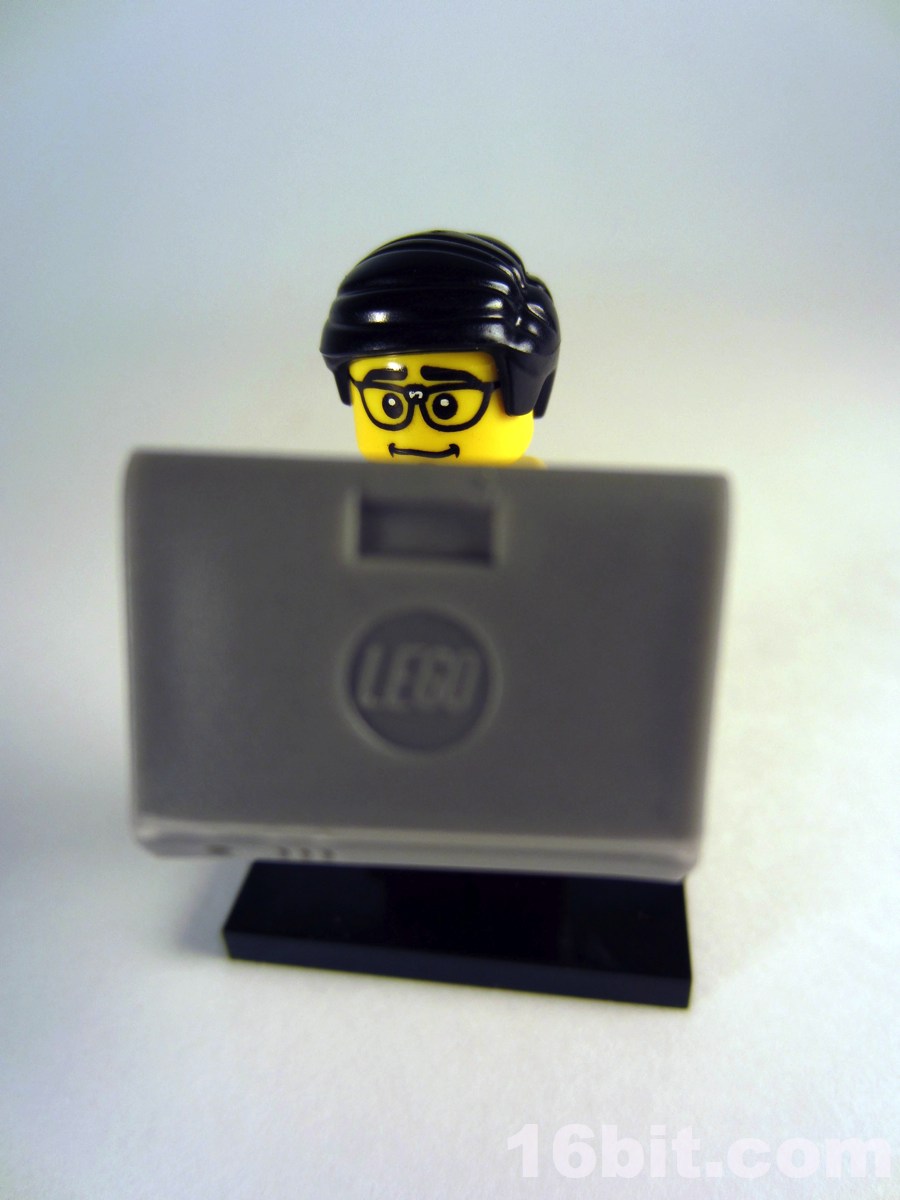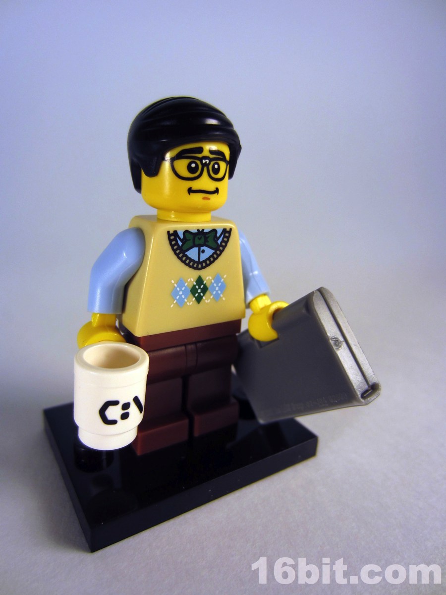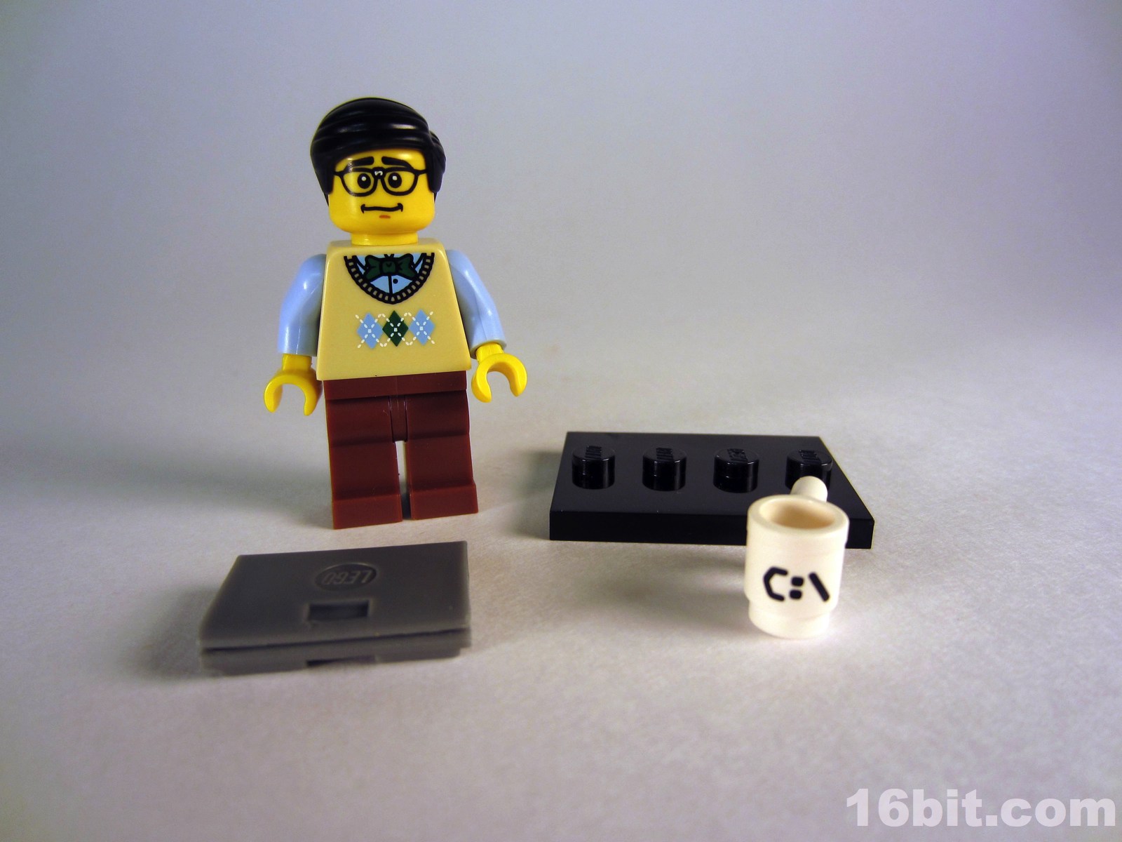 The figure has a nicely detailed sweater vest with a bow tie, which is a little too much like the "dud" from the Mystery Date game I remember seeing on The Simpsons. The hair is neat, and I think could make the basis for a decent Devo (Nu-Tra era) were the bodies to be found. The deco is simple, although as I've been pulling out my 1980s LEGO minifigures lately, it's not exactly cheap. I remember when we got a blue torso with white outlines, and that was it! This figure has multiple colors and complicated, fine detail. The glasses are particularly dorky, and the eyebrows and smile are of an affable fellow. What's particularly neat are the accessories. A mug with the C:\ DOS prompt is delightful and another nod to buyers over 30. The laptop seems inspired by some of the Dell and Apple designs, with a circle and a LEGO logo on the outside. The interior has no deco to speak of, but there are sculpted keys and a blank screen that begs for a sticker. The laptop isn't jointed, so you may notice some minor stress marks where the plastic folds. (Confidential to LEGO: Playmobil puts separate joints in so they don't snap or tear. I'm just saying.)